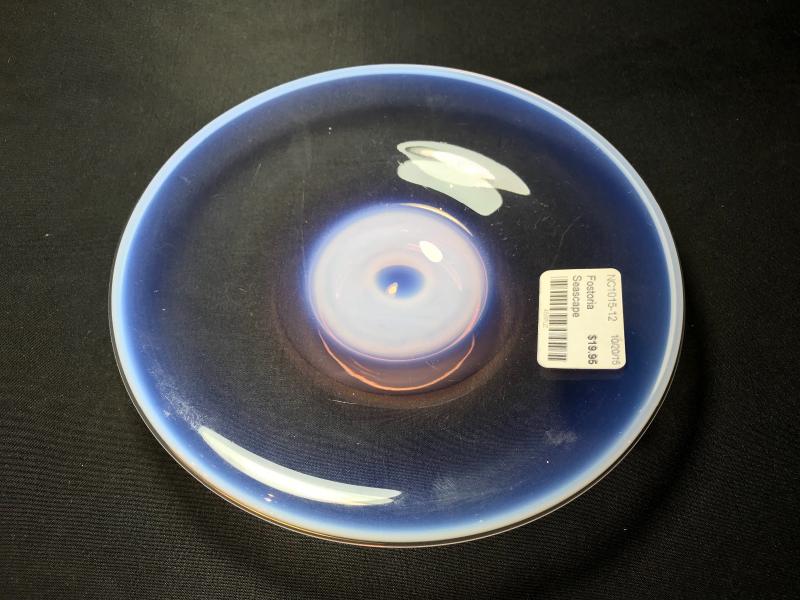 Beautiful Fostoria tazza or footed plate from their "Seascape" collection, which was only produced between 1954 and 1958. In the pink opalescent "coral sand" color. Excellent condition. 7 1/2" D x 1 1/2" H