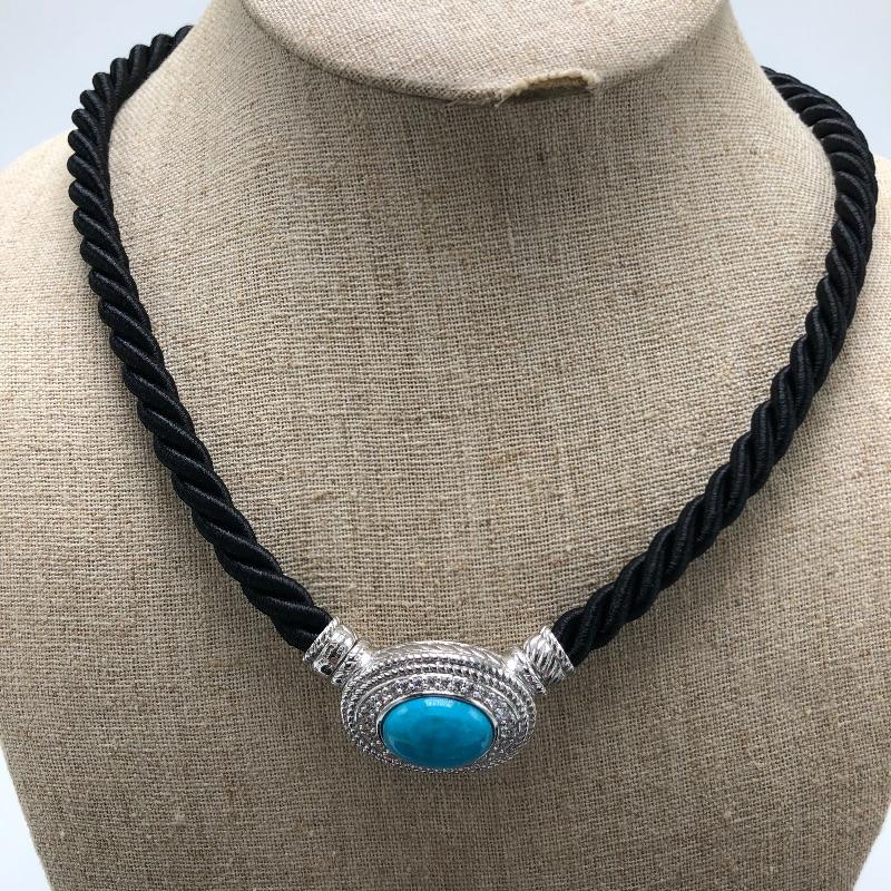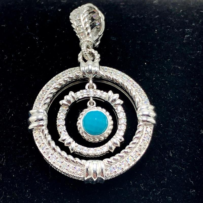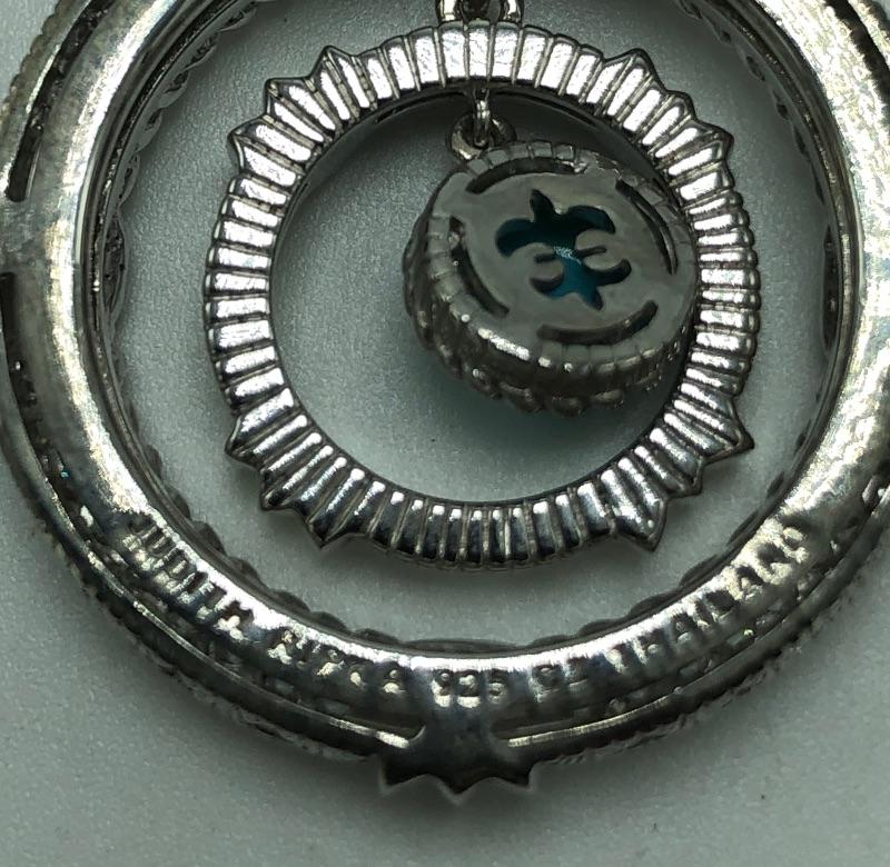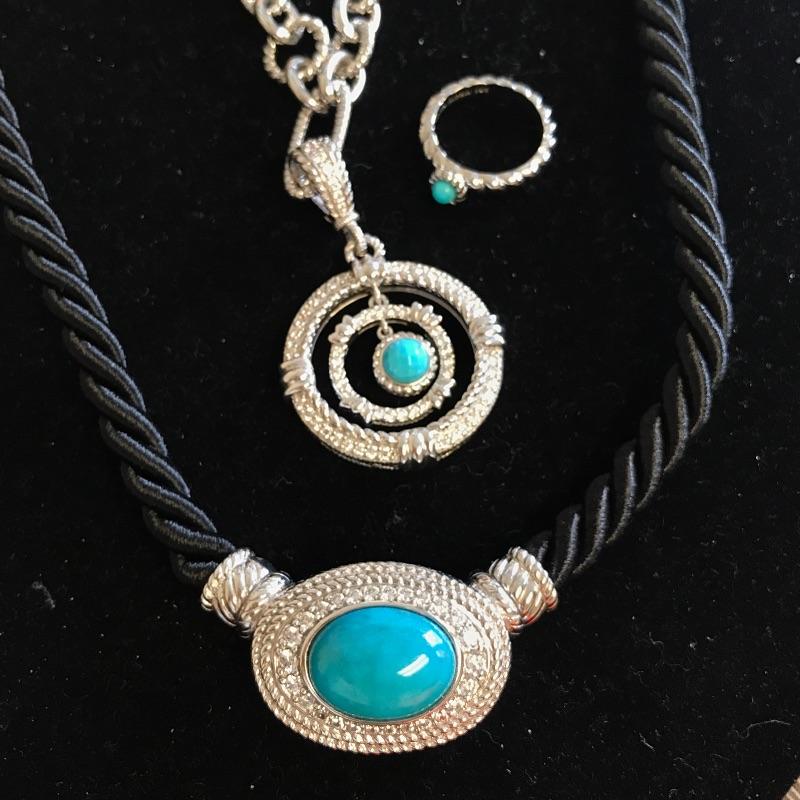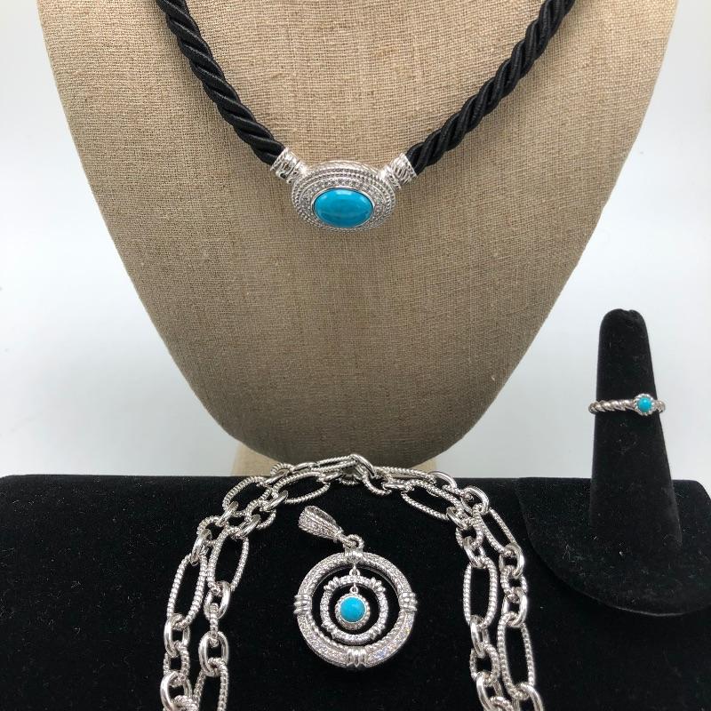 Two equally stunning necklaces and a ring here from Judith Ripka. The silk corded necklace attaches its pendant with magnets for a choker length necklace. The silver chain and accompanying pendant are also by Ripka. The pendant does not lay flat on this chain but the easy clip allows you to attach the pendant to most jewelry. Mix and match with these gorgeous silver pieces that are all marked 925.