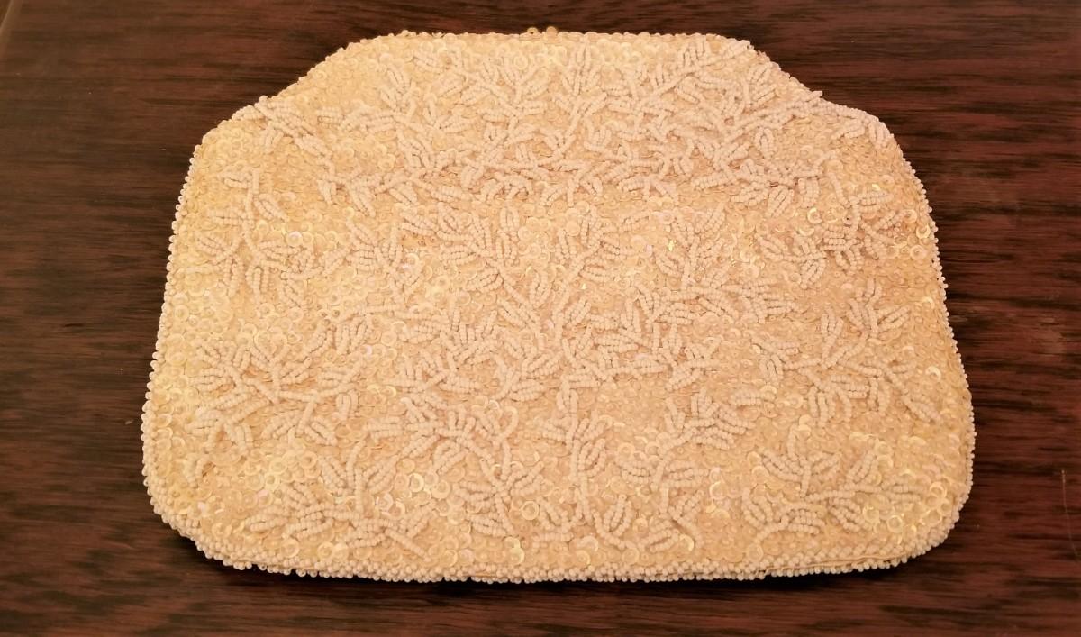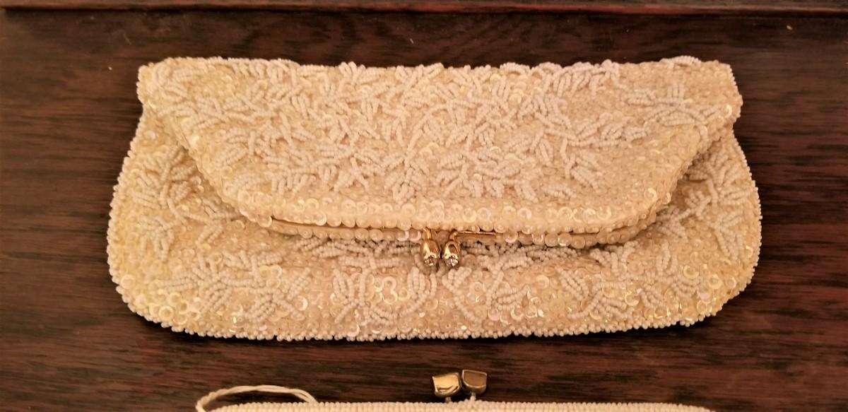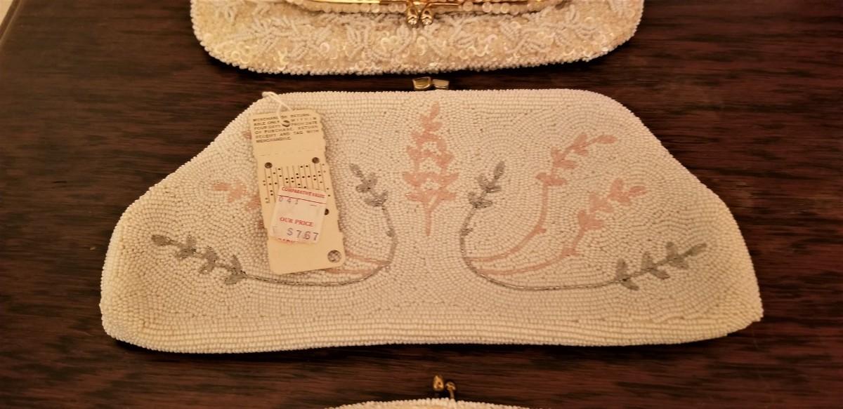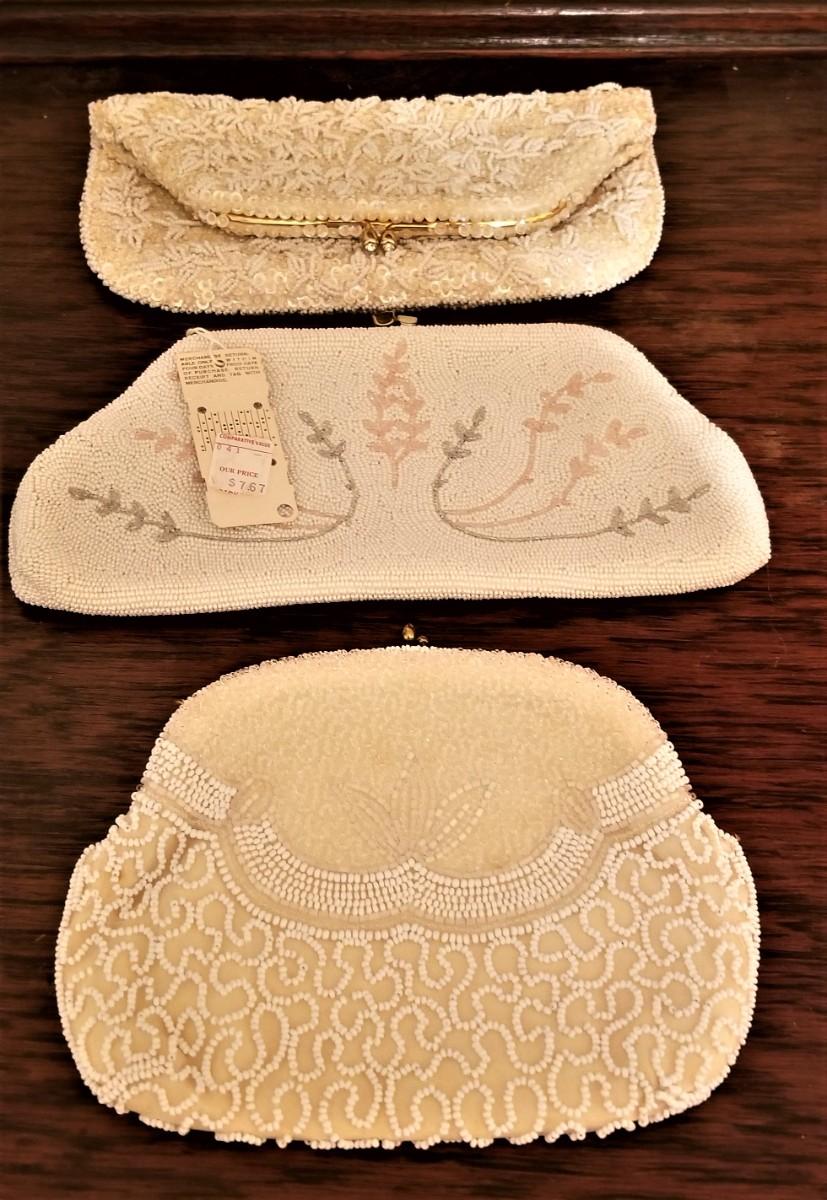 These three vintage, beaded bags are in great condition - one still has the tag! Bag at the top is a fold-over clutch - plenty of room for a cell phone, etc, measures 9" by 8". Middle bag has original tag, made in Japan, 9.5" x 4.5". Bottom bag was made in Belgium, 7.5" x 5.5". All have nice sating linings and are in excellent condition.
