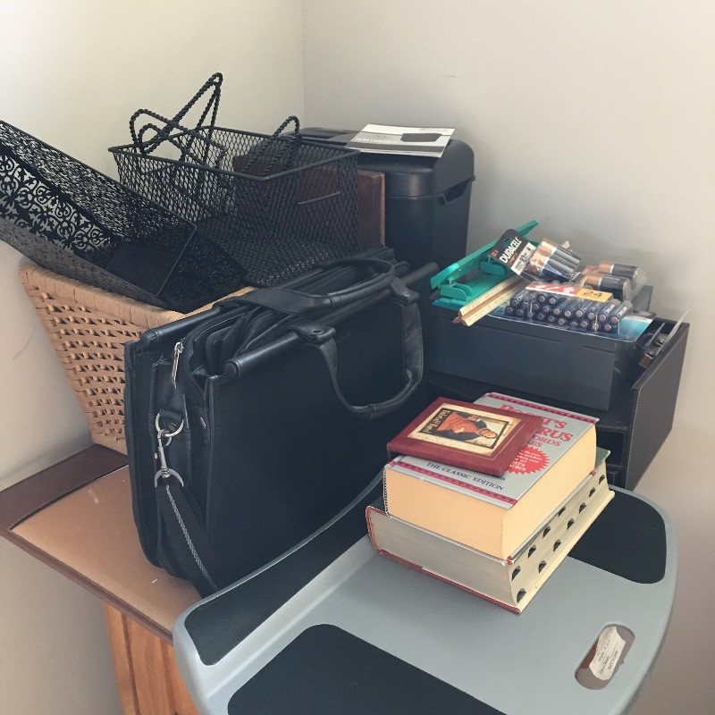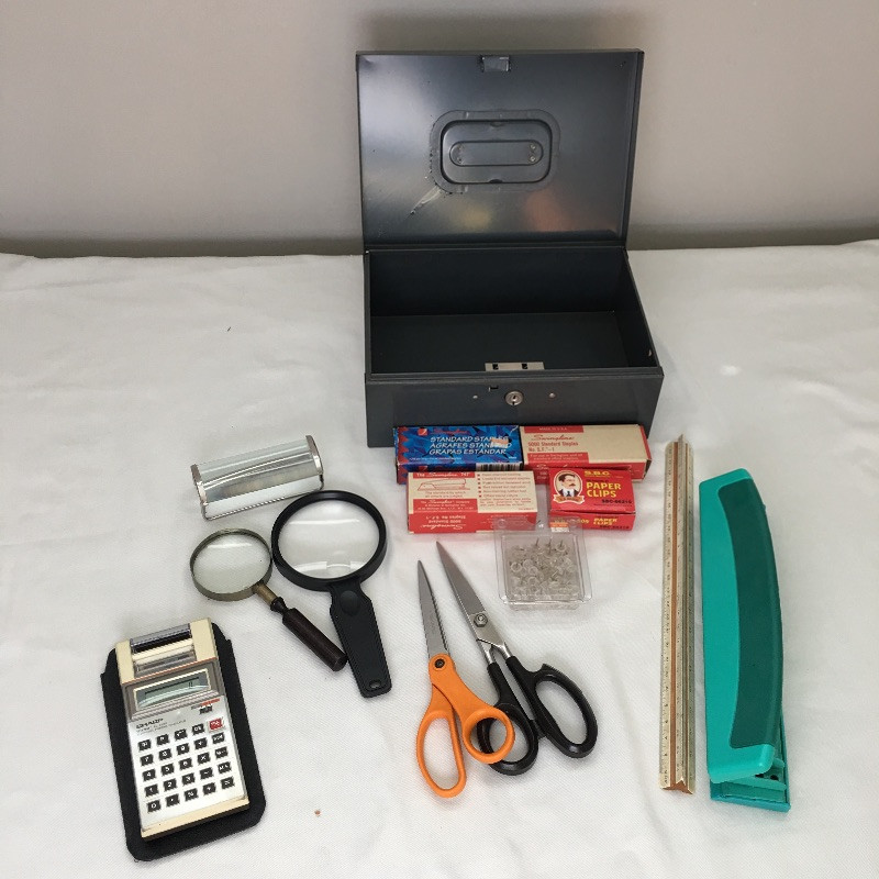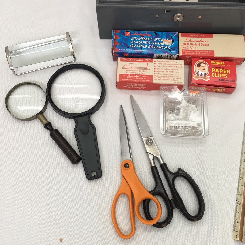 A great assortment for setting up your home office. Office supplies include paper shredder, briefcase, leather blotter, lap desk, scissors, magnifying glass, staples and more.