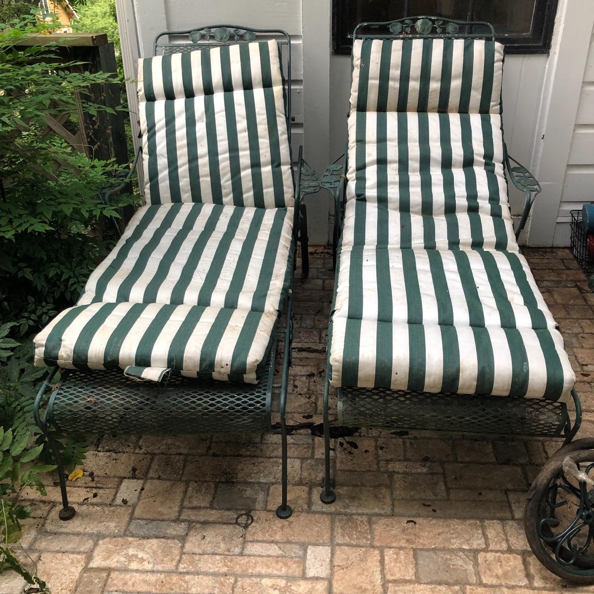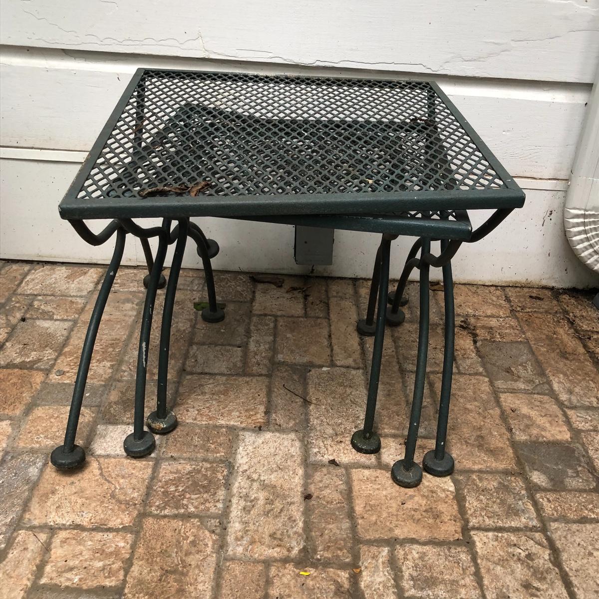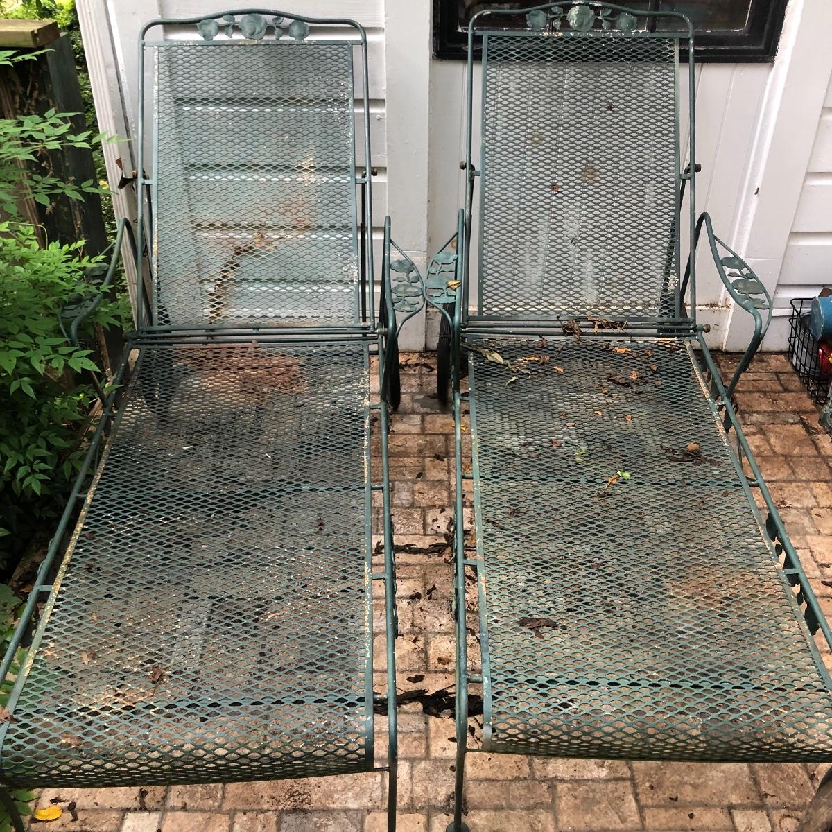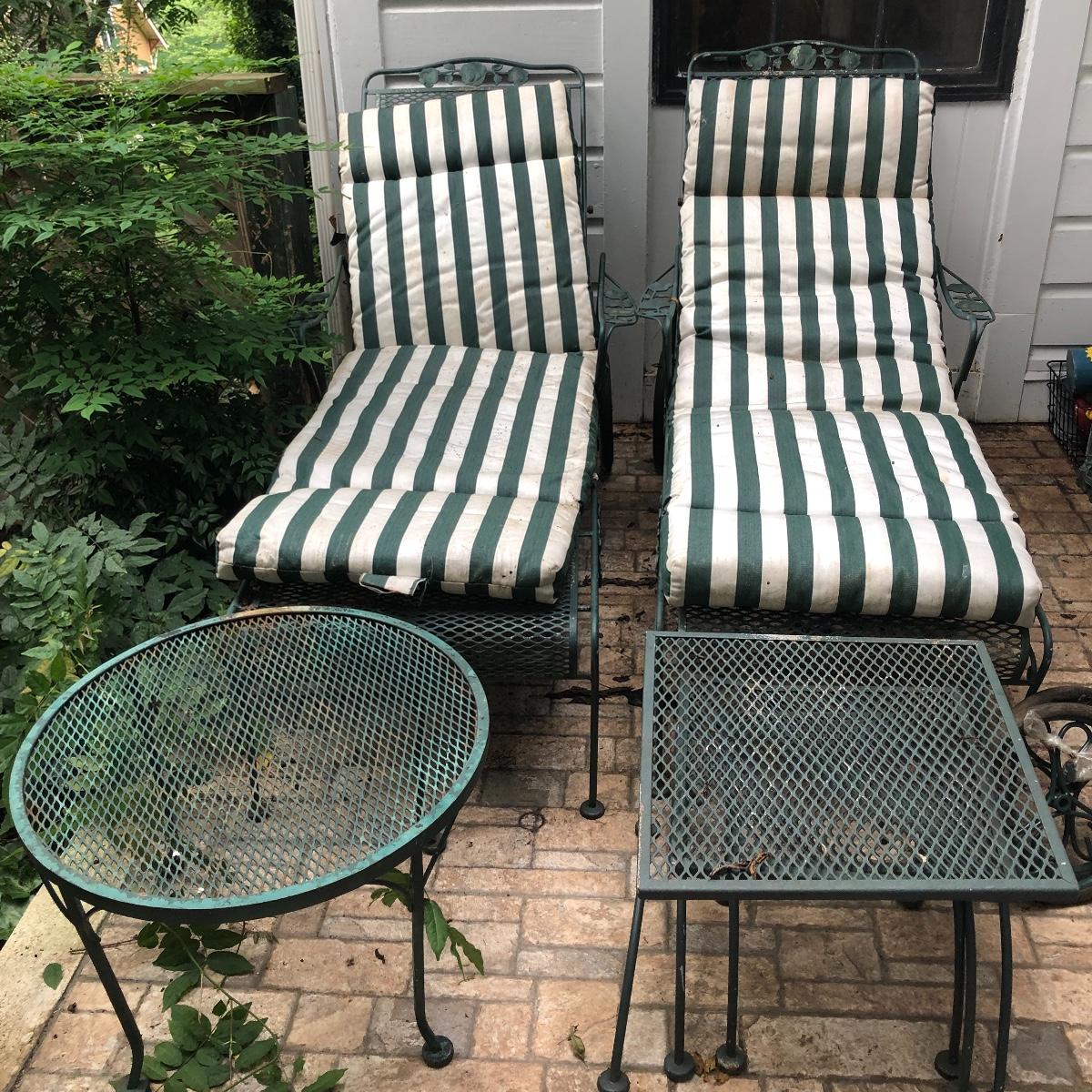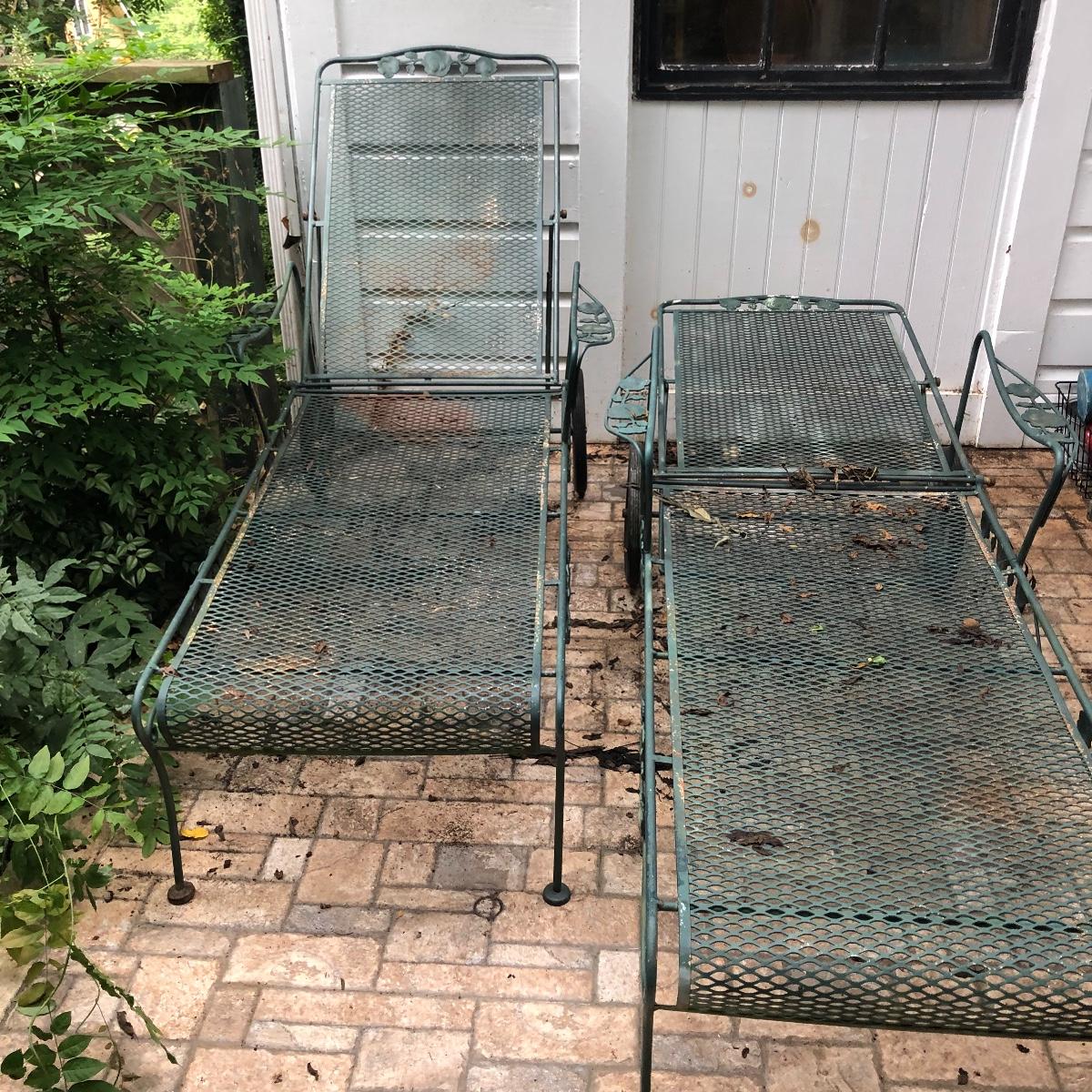 Relax in these nice metal lounge chairs. Lot includes two metal lounge chairs with adjustable backs and wheels. You even get 2 extra replacement wheels! Also includes three square nesting tables and one round table. Largest nesting table has bent leg. Cushions on loungers are dirty, see pictures. Loungers measure 30” x 76” x 22” when laying flat.