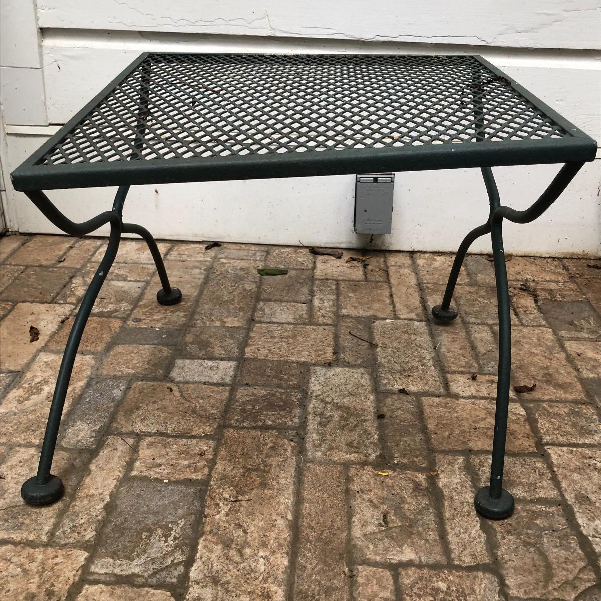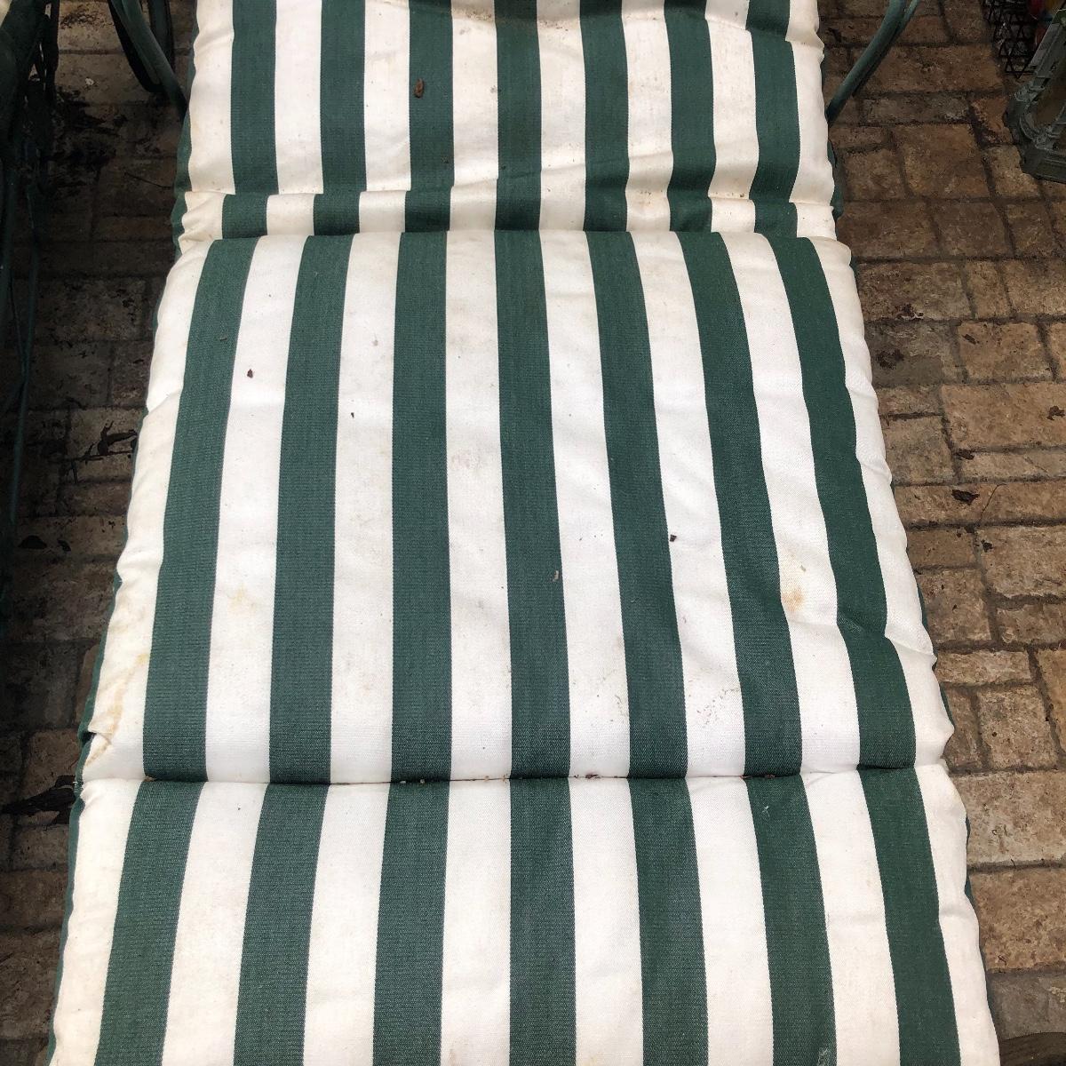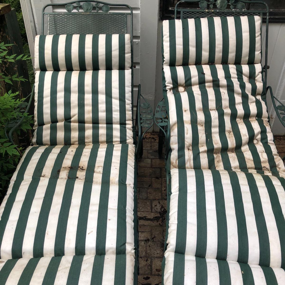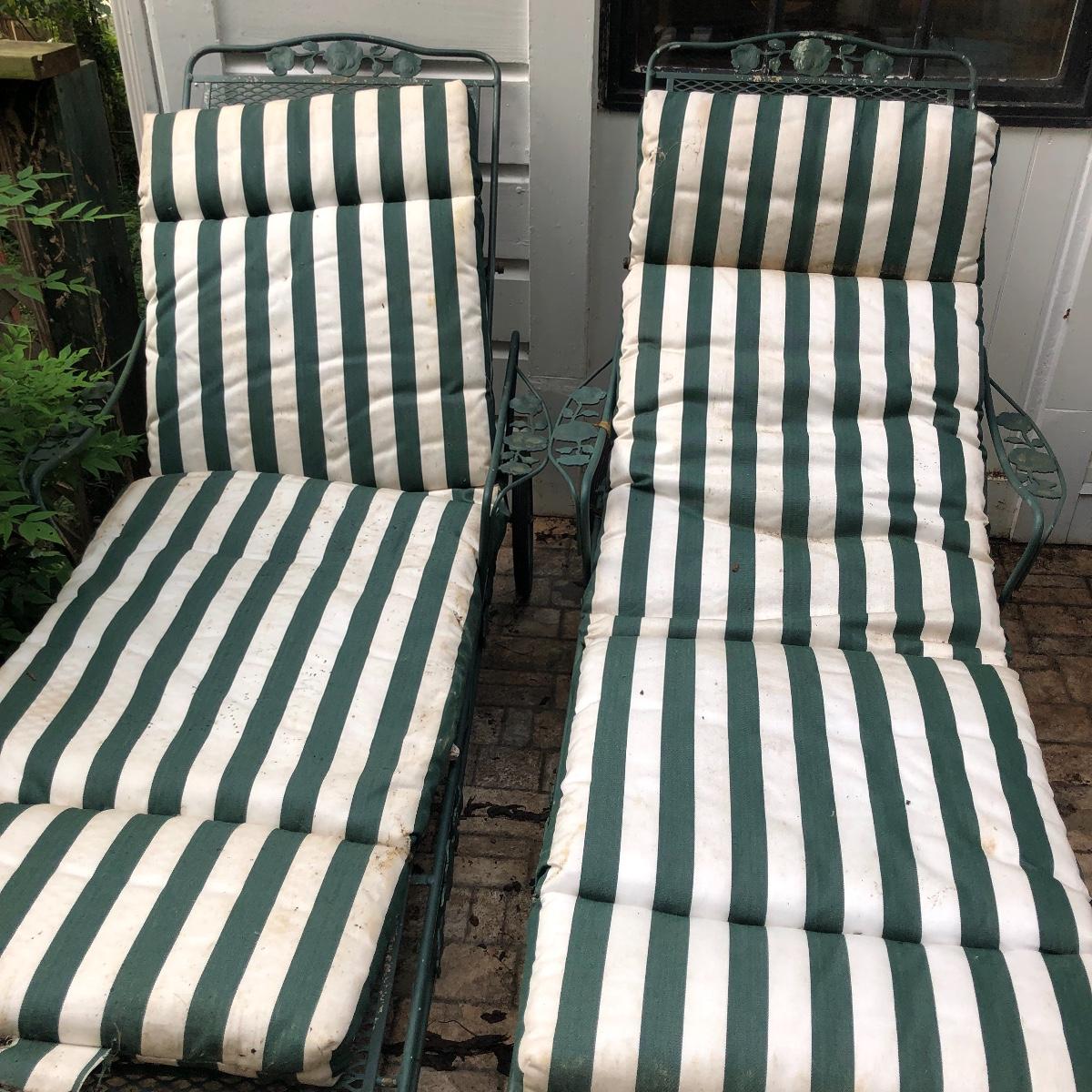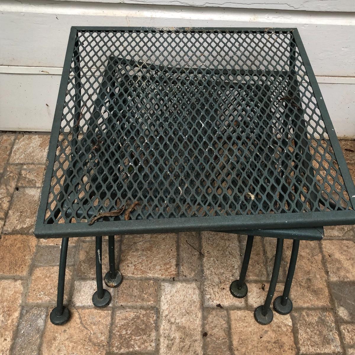 Relax in these nice metal lounge chairs. Lot includes two metal lounge chairs with adjustable backs and wheels. You even get 2 extra replacement wheels! Also includes three square nesting tables and one round table. Largest nesting table has bent leg. Cushions on loungers are dirty, see pictures. Loungers measure 30” x 76” x 22” when laying flat.