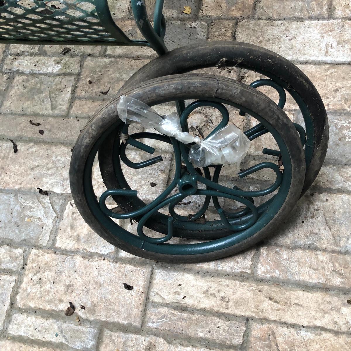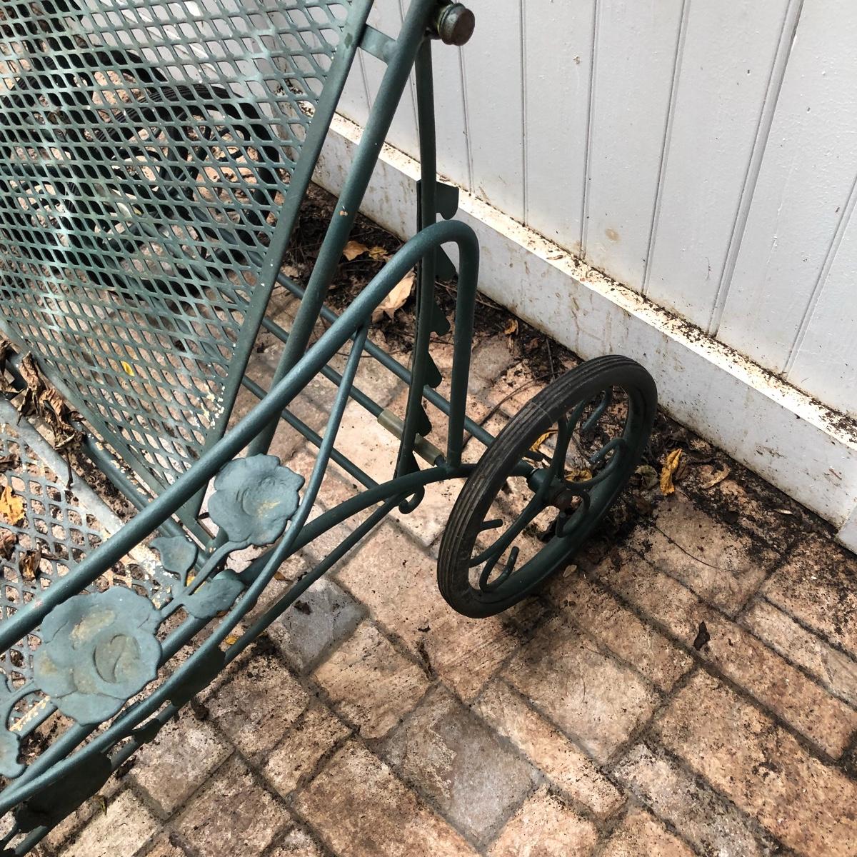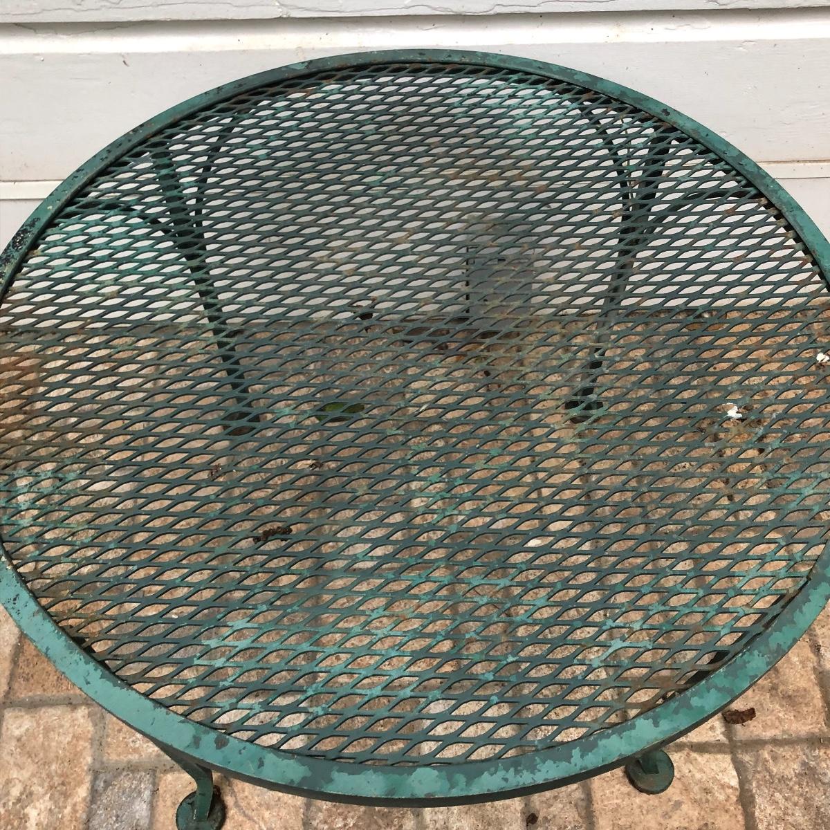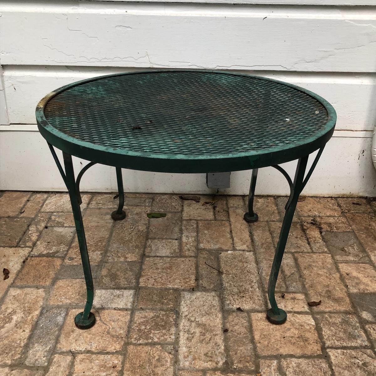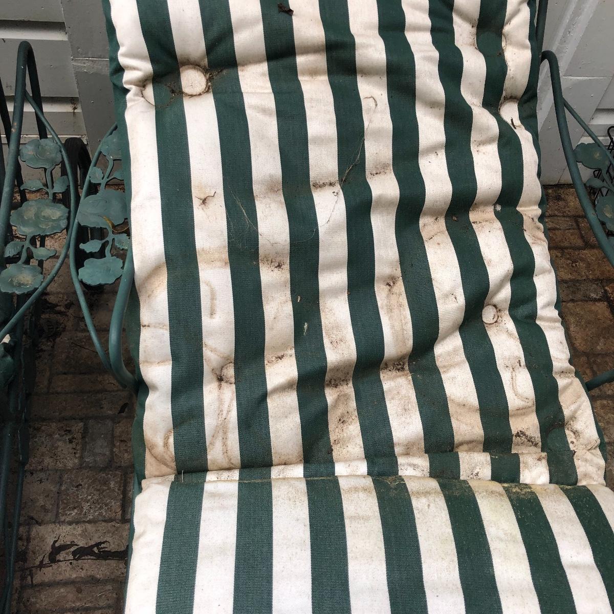 Relax in these nice metal lounge chairs. Lot includes two metal lounge chairs with adjustable backs and wheels. You even get 2 extra replacement wheels! Also includes three square nesting tables and one round table. Largest nesting table has bent leg. Cushions on loungers are dirty, see pictures. Loungers measure 30” x 76” x 22” when laying flat.