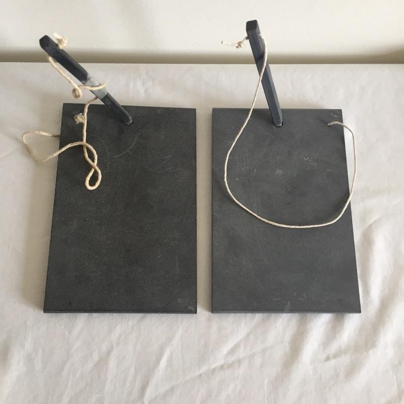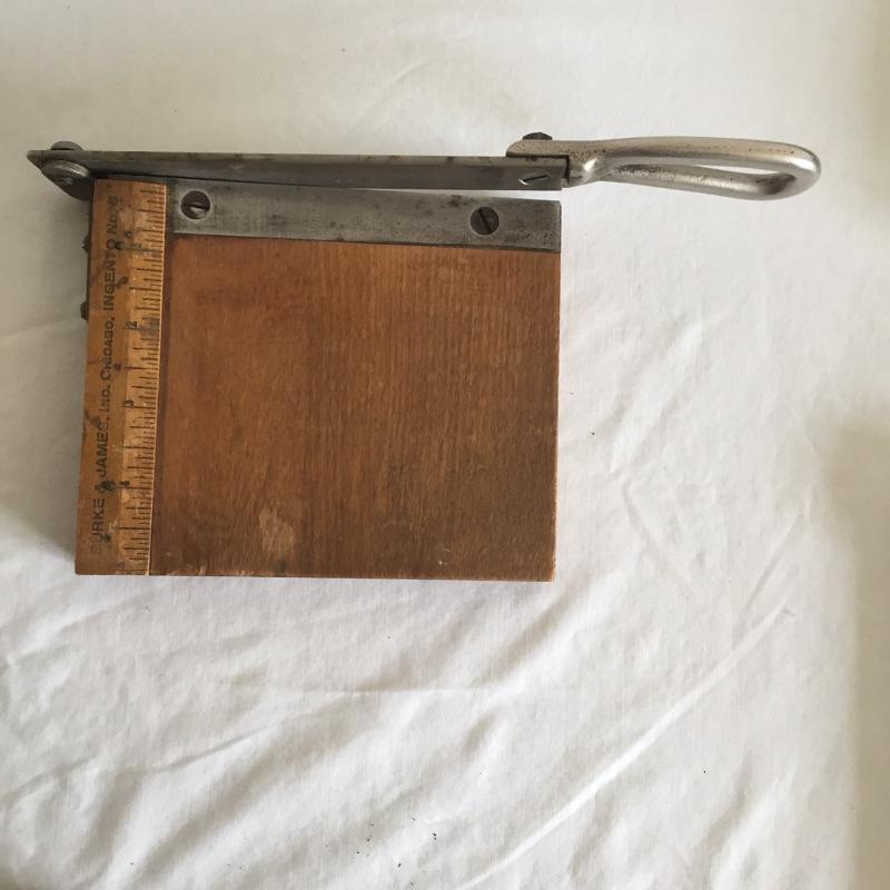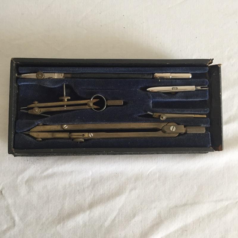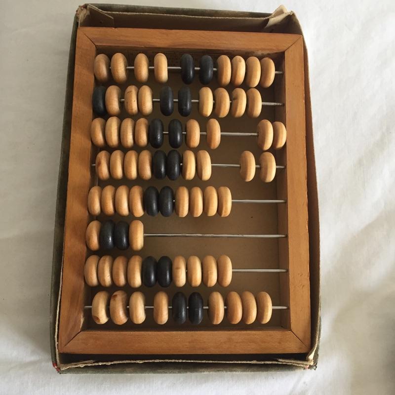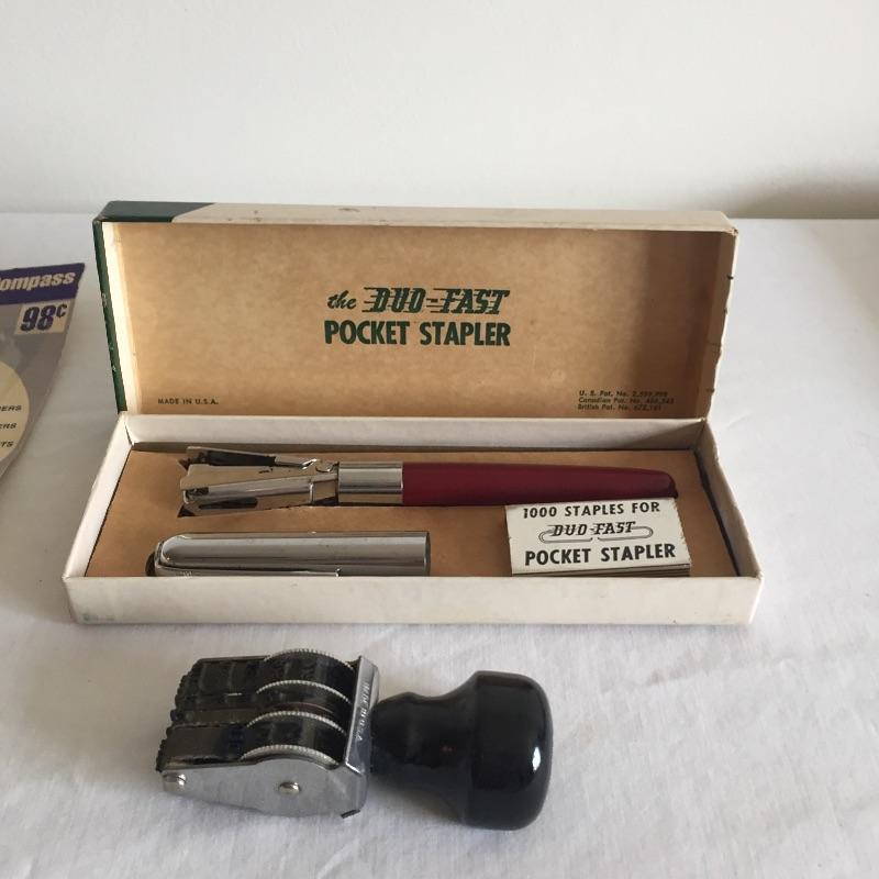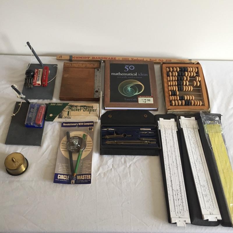 Selection of precision office tools including abacus , trio of staplers , stamp holder , small paper cutter , compass , three slide rules and a pair of chalk writing tablets. Math lovers unite!