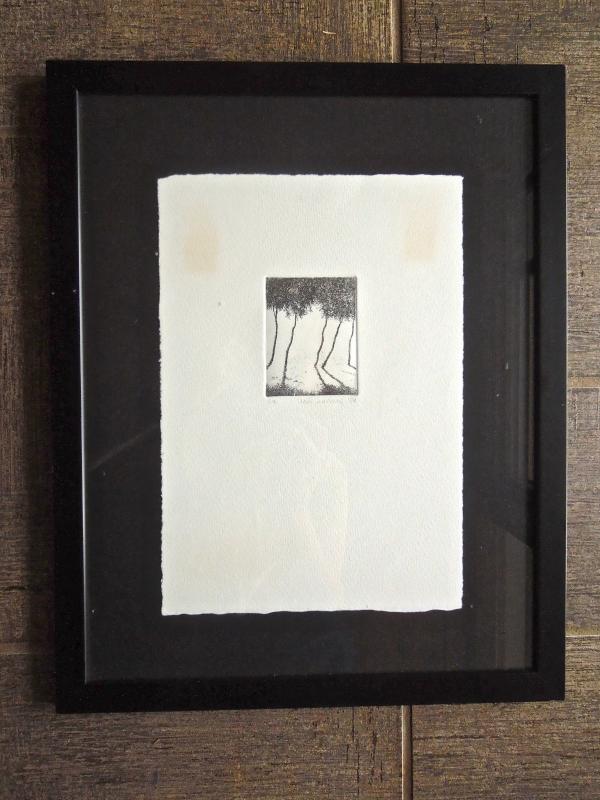 Nice signed professionally framed embossed print of stand of trees casting a shadow. Nice black metal frame. Frame measures 16 x 13". Ready to hang.