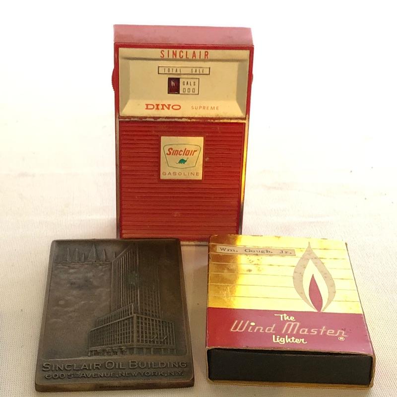 Vintage collectibles from the Sinclair Oil Building. Heavy bronze looking paper weight, real butane lighter and transistor radio. Lighter needs a flint and radio needs a nine volt battery. Shipping available.