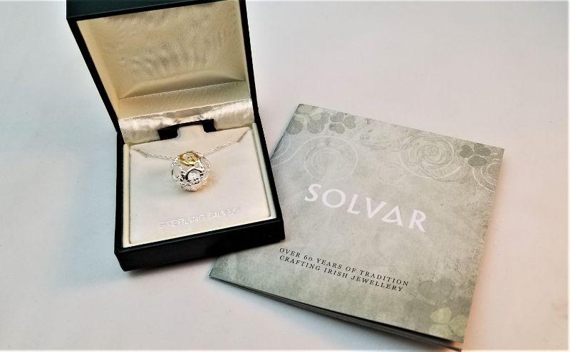 Original packaging - this was purchased in 2013 at a cost of 64.14. SOLVAR Spiral design Claddagh (classic Irish symbol) pendant on chain - sterling silver with 18kt gold plate accent. 18" long delicate chain.