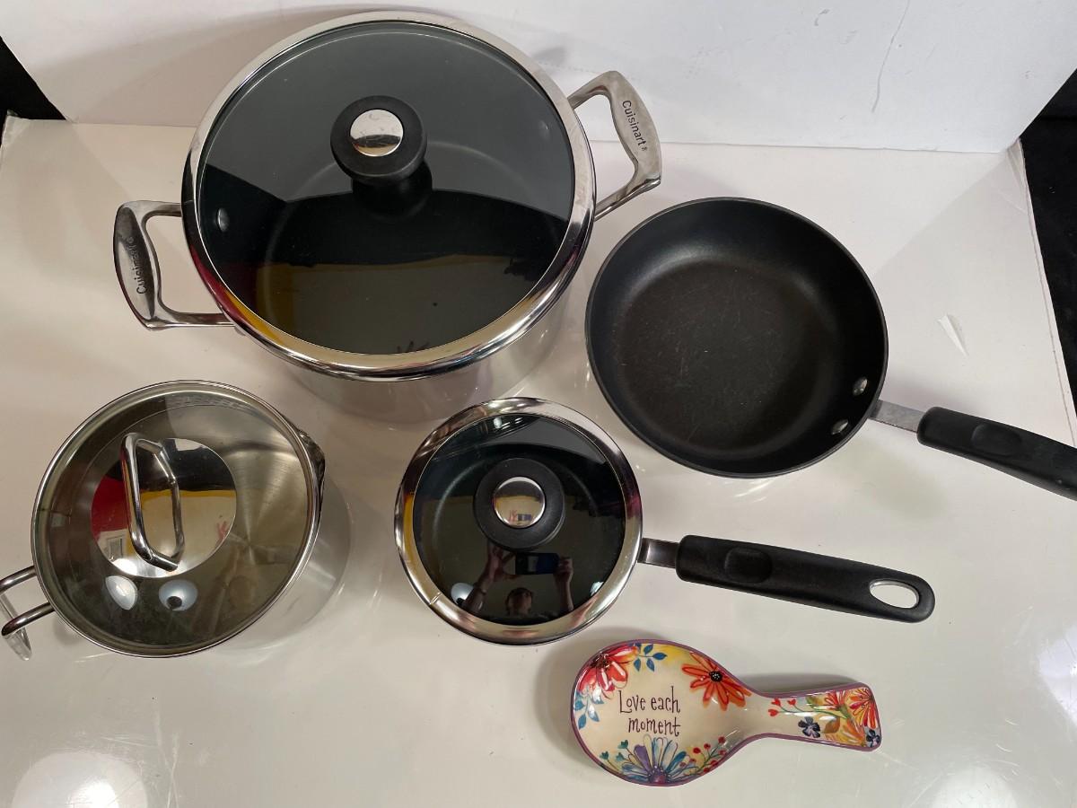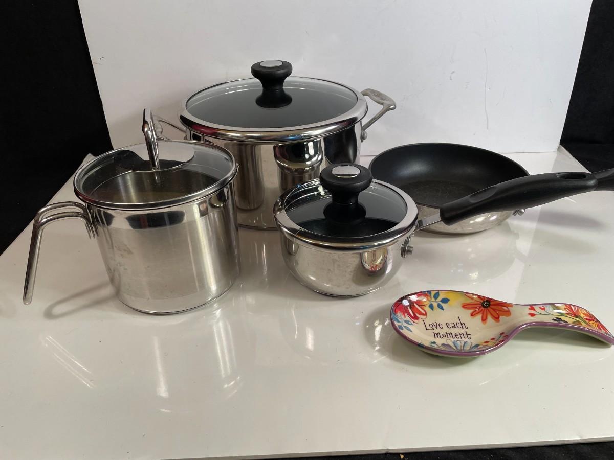 Lot 128 Stock Pot and Miscellaneous Pans, with Spoon Rest