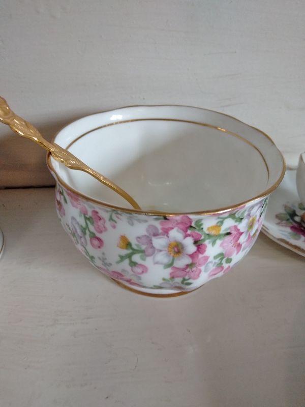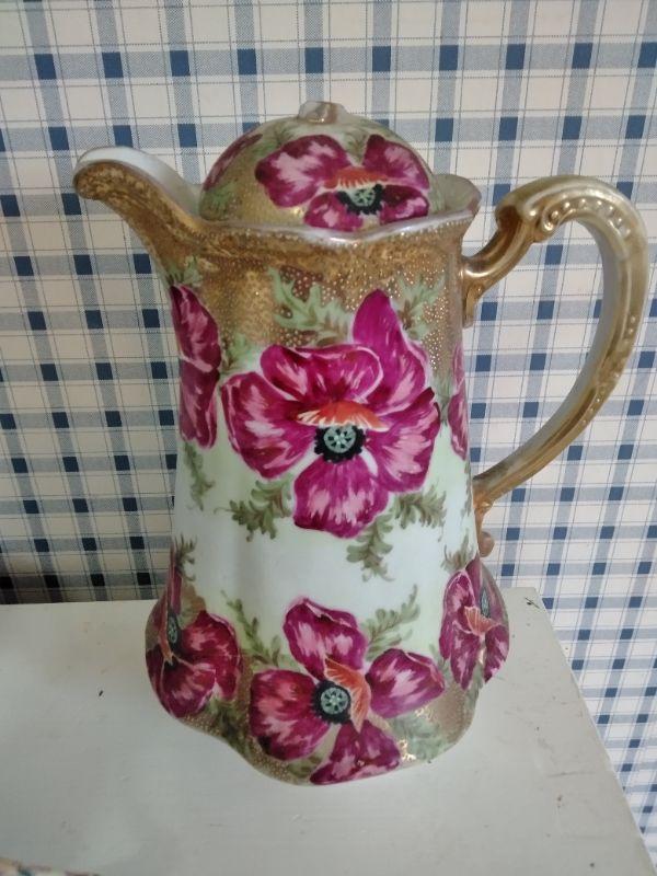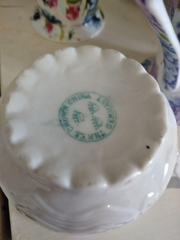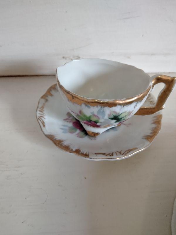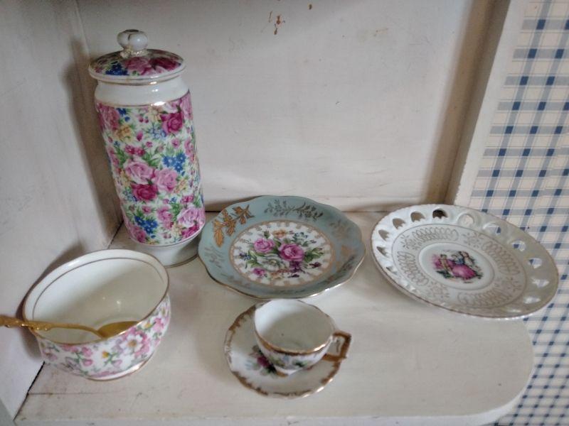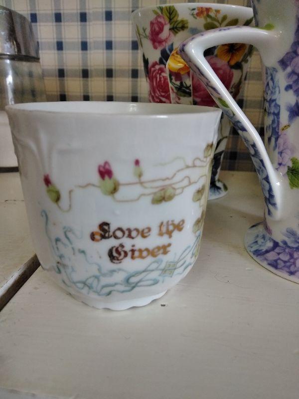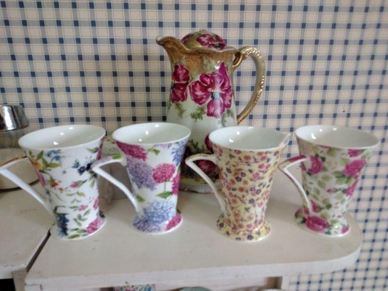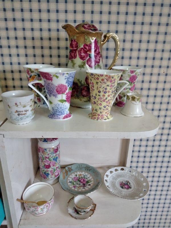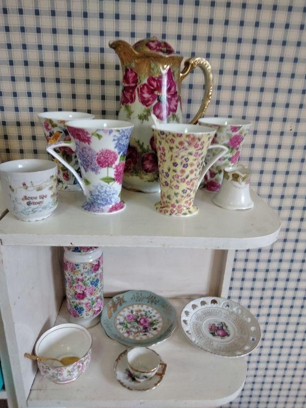TEA POT (broken lid) TEA CUPS, AND OTHER ASSORTED CHINA.