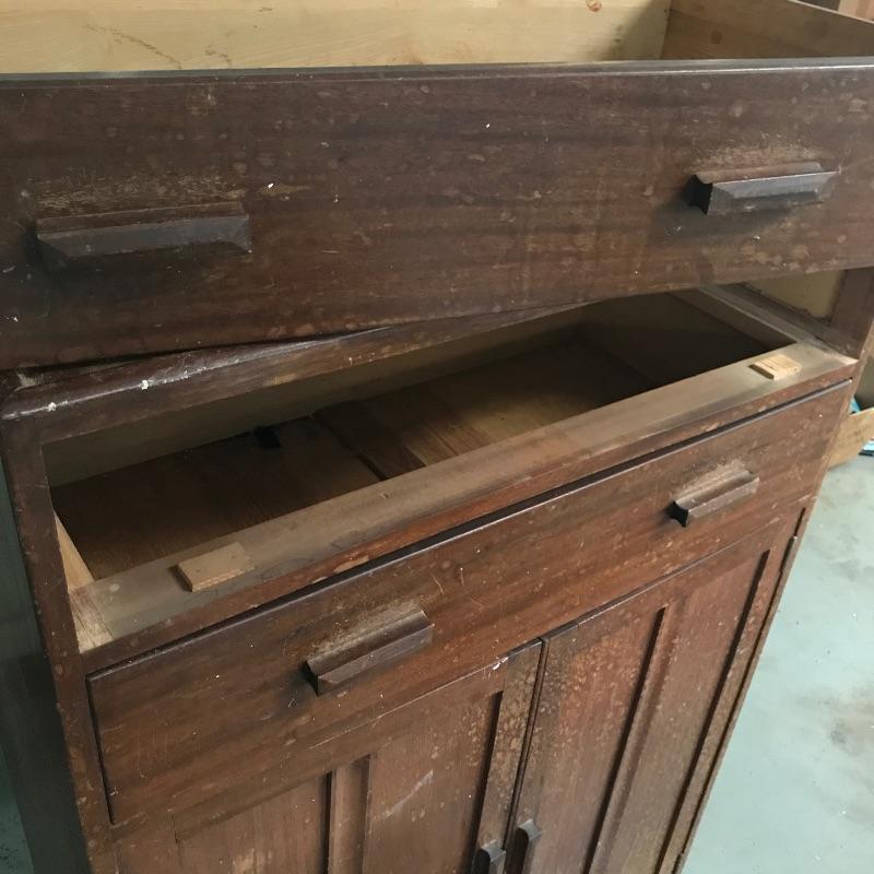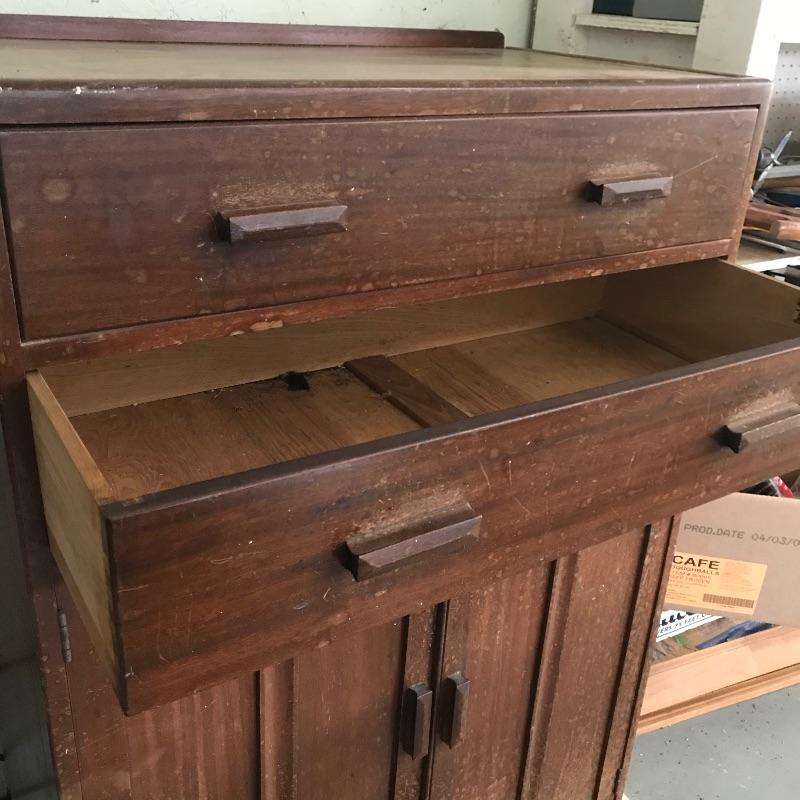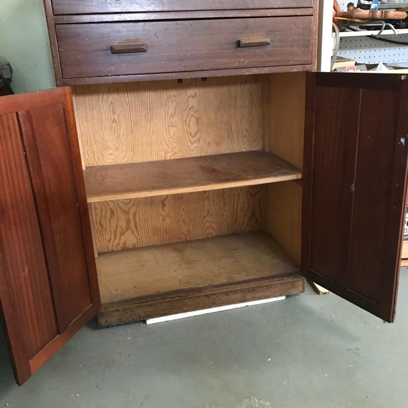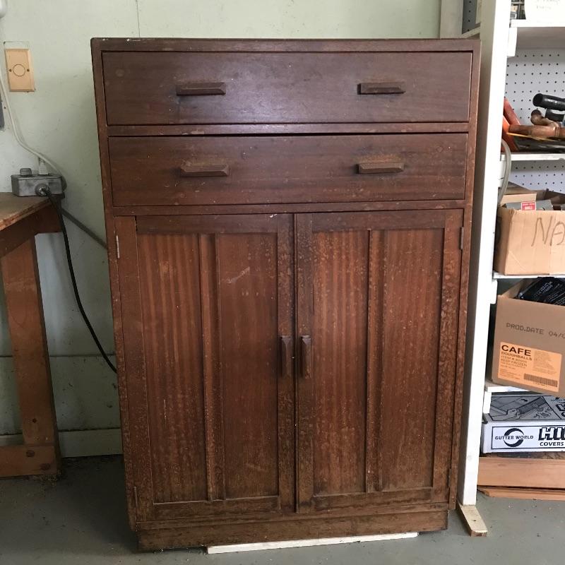 Perfect for any room! Nice two drawer - two shelf solid wood cabinet with dovetail drawers and wood pulls. Piece was previously used in a workshop and needs some cleaning and new stain for perfection, but it is solid and sturdy. Sticker inside says Gomme Furniture. Piece measures approximately 33” x 18” x 49.25”. See photos. No shipping.