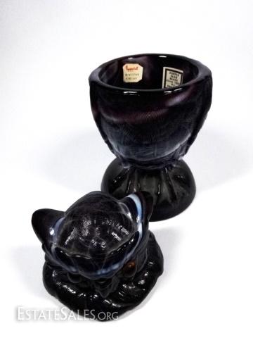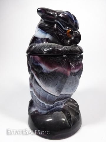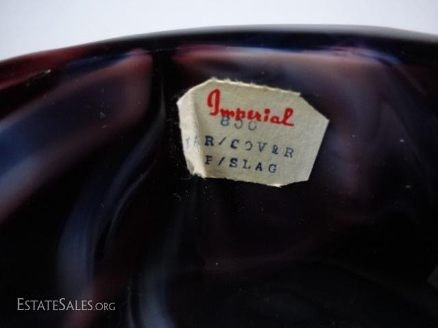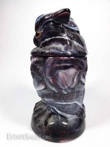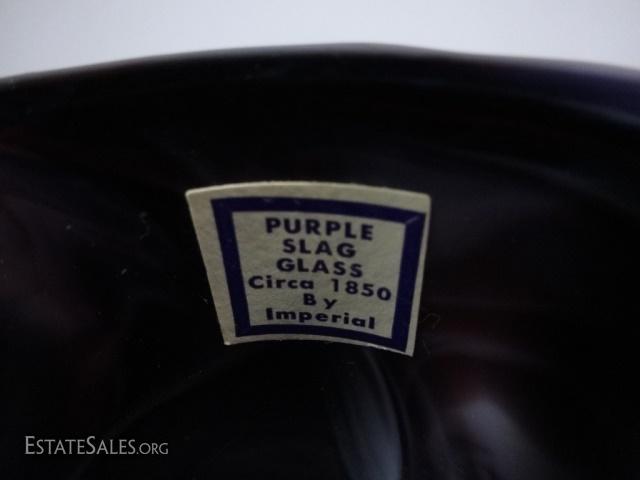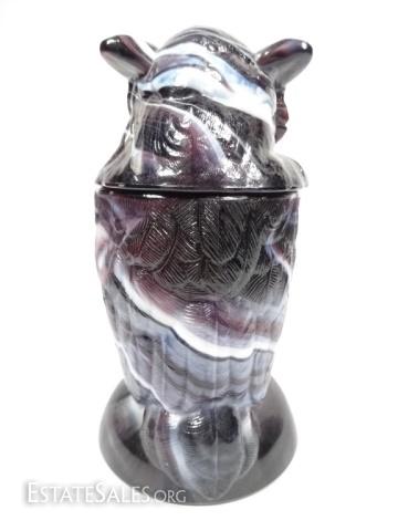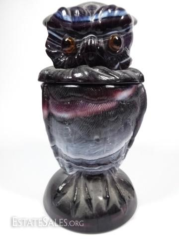 LOT 128: VINTAGE MID CENTURY IMPERIAL PURPLE SLAG GLASS OWL COVERED JAR, MOLD #800 PRODUCED ONLY IN 1975-1976, WITH LABEL "PURPLE SLAG GLASS CIRCA 1850 BY IMPERIAL" & IMPERIAL LABEL, APPROX 6.5"H