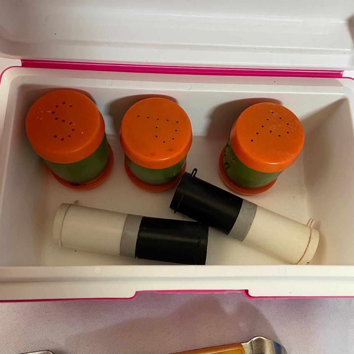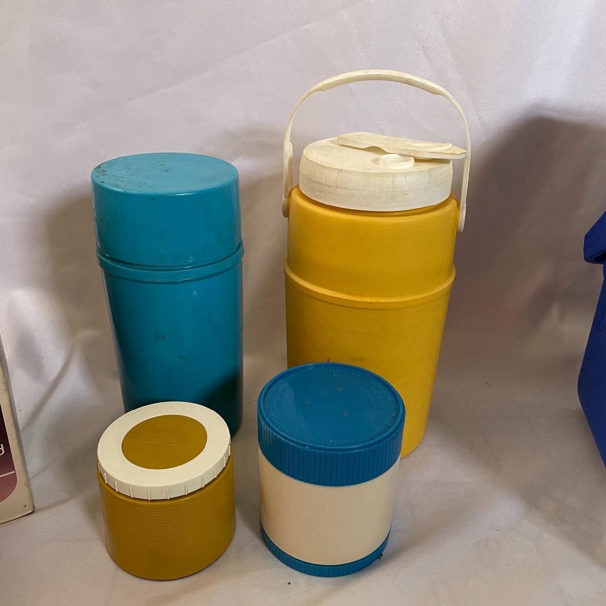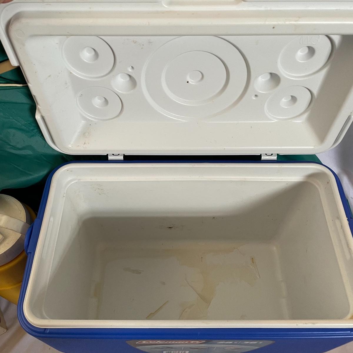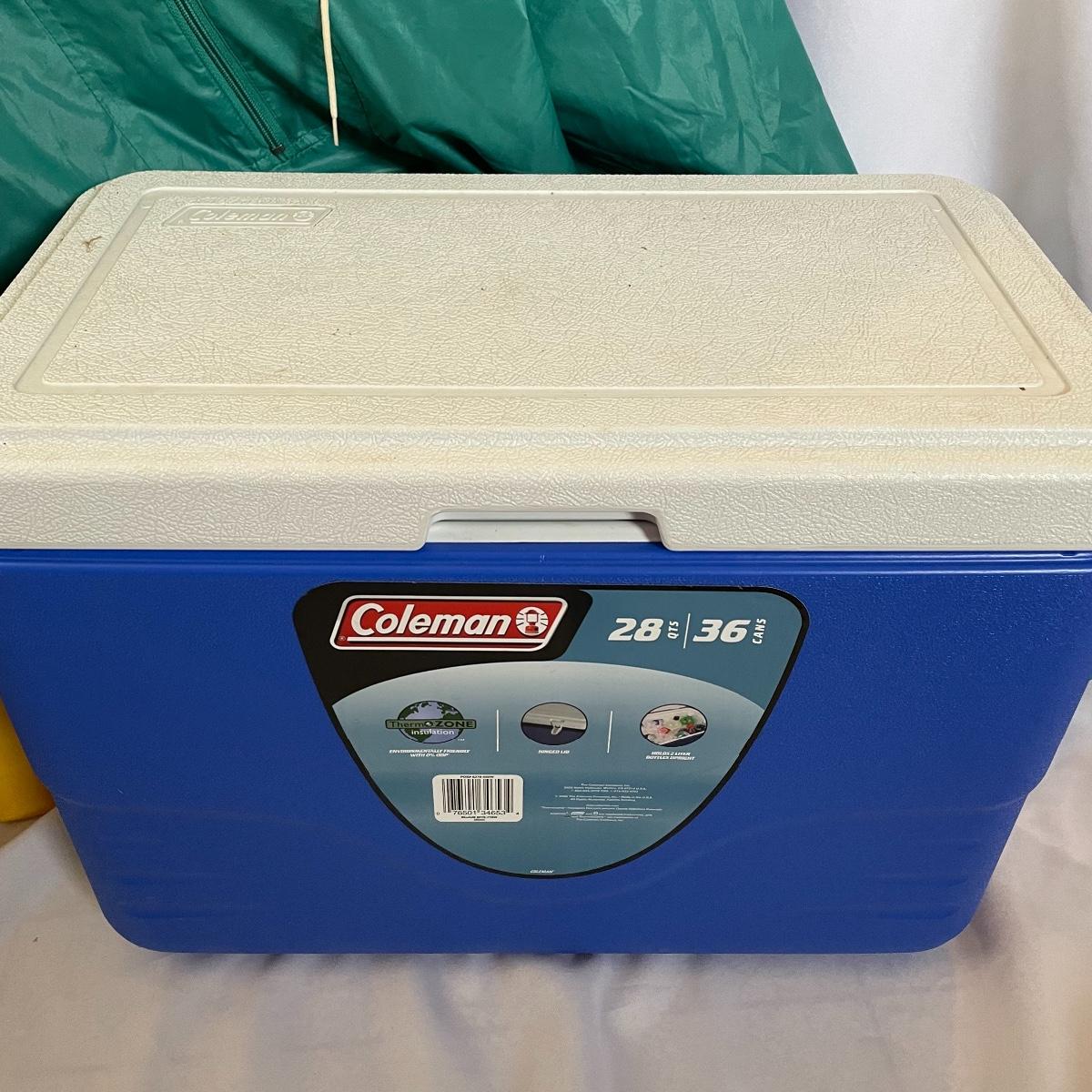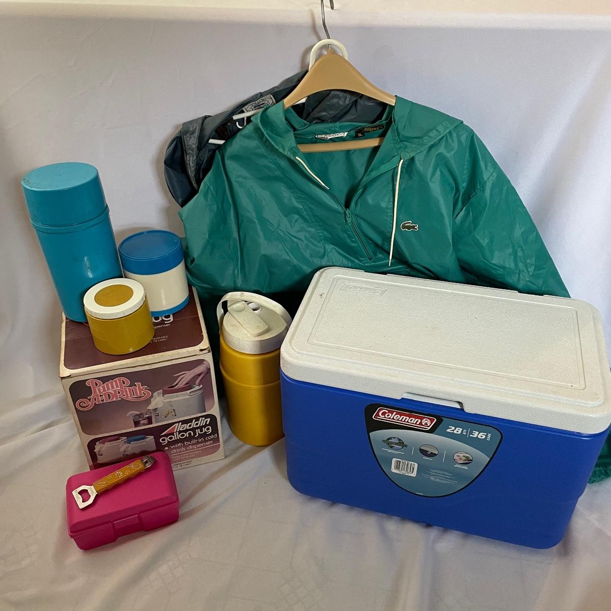 This lot will keep you outdoors in rain or shine! Two XL Izod lightweight rain jackets and a 28qt Coleman Cooler. Lot offers salt & peppers, Alladin and Thermos hot/cold canisters and even a Pump-a-Drink cold beverage dispenser. See images. Cooler outside measures approximately 18.5” x 10.5” x 14”. Items could use a bit of cleaning before use. Local pick up only.