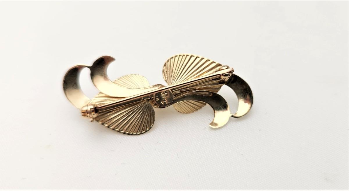 Opening bid is just a little above scrap price - 14kt gold marked and tested. Sweet little brooch - a nice accent on a collar or perhaps a young lady's first piece of "real" jewelry? Measures 1 3/4" across, has a cultured pearl in the center - good condition. Weighs about 3.1 grams.