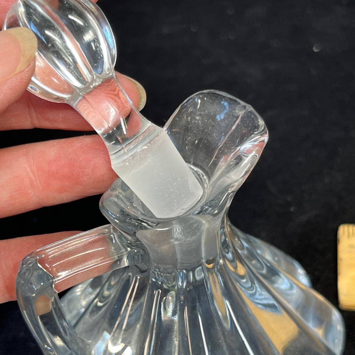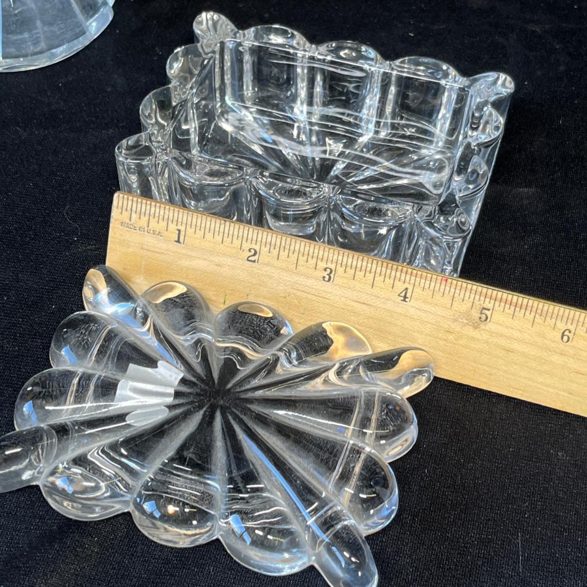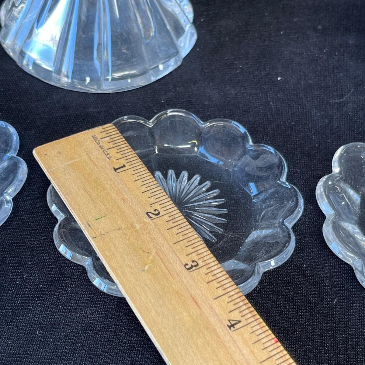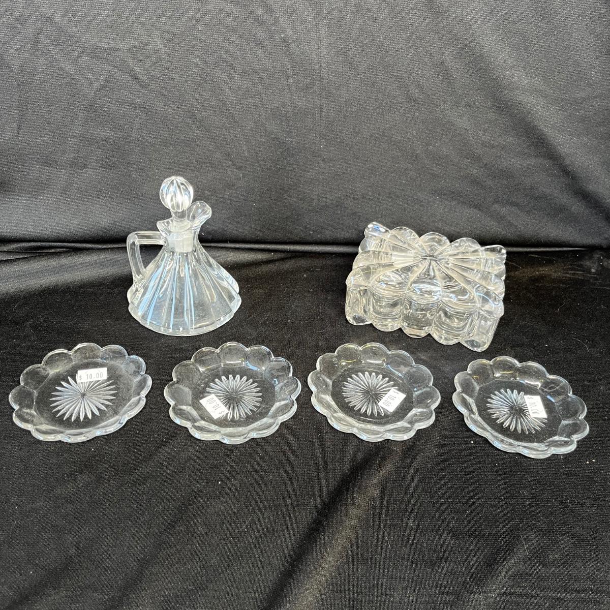 Some very nice Heisey pieces! Butter pats, cruet, & box. No damage.