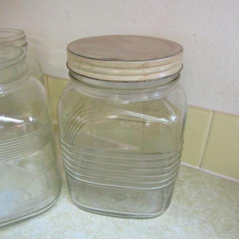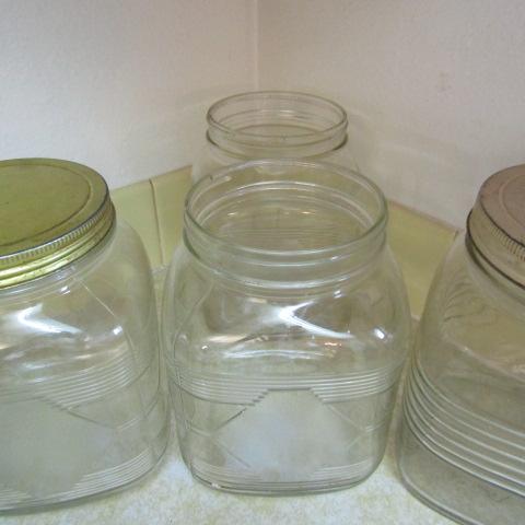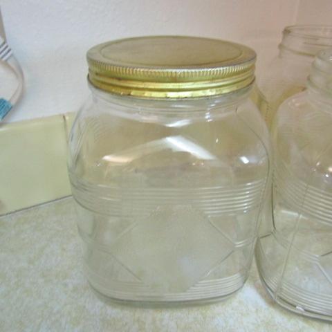 GOLD GLASS REFRIGERATOR DISH AND 4 VINTAGE JARS, ONLY 1 HAS A LID