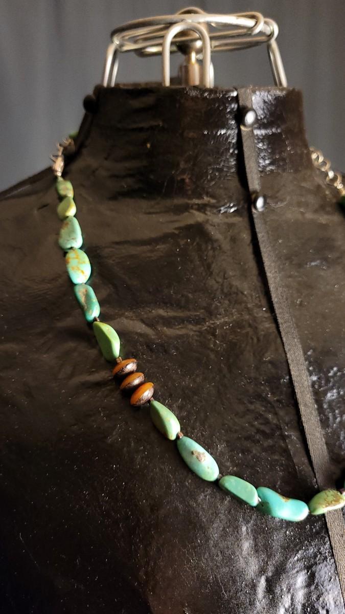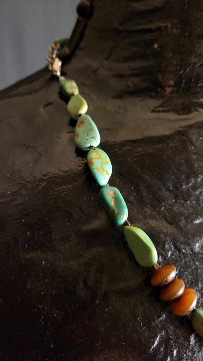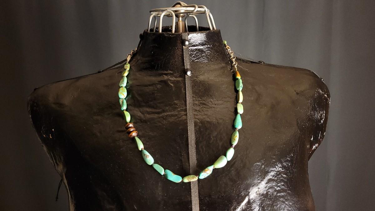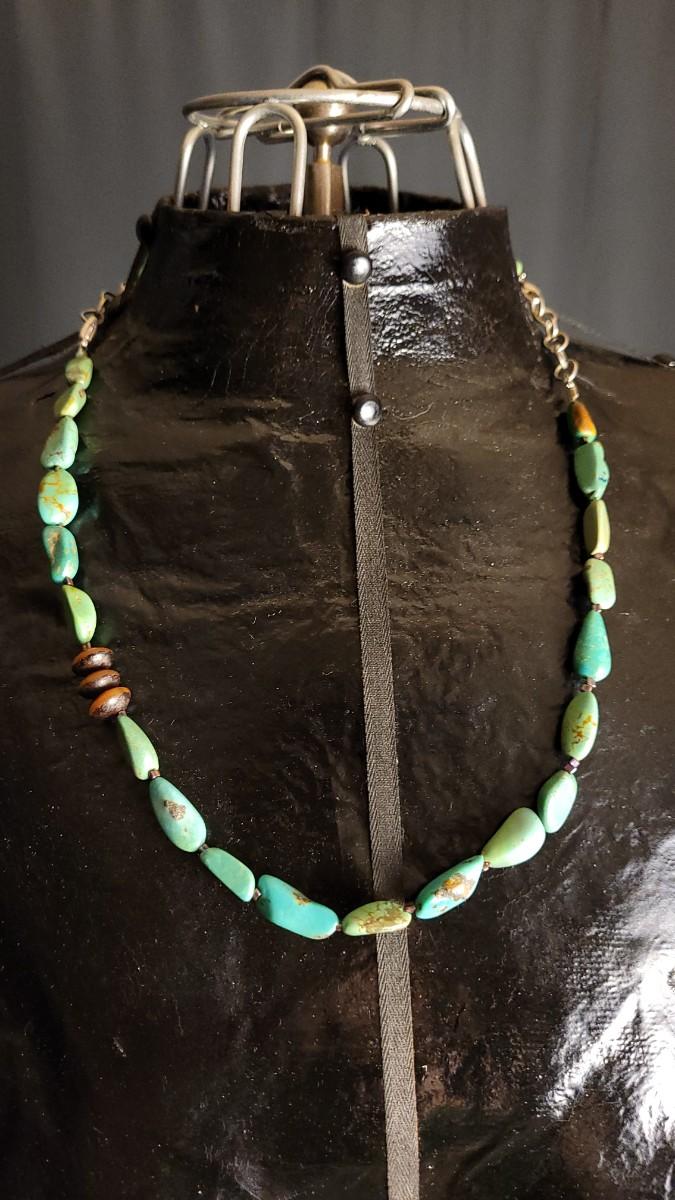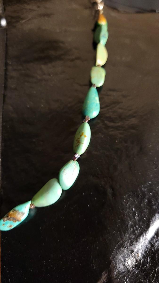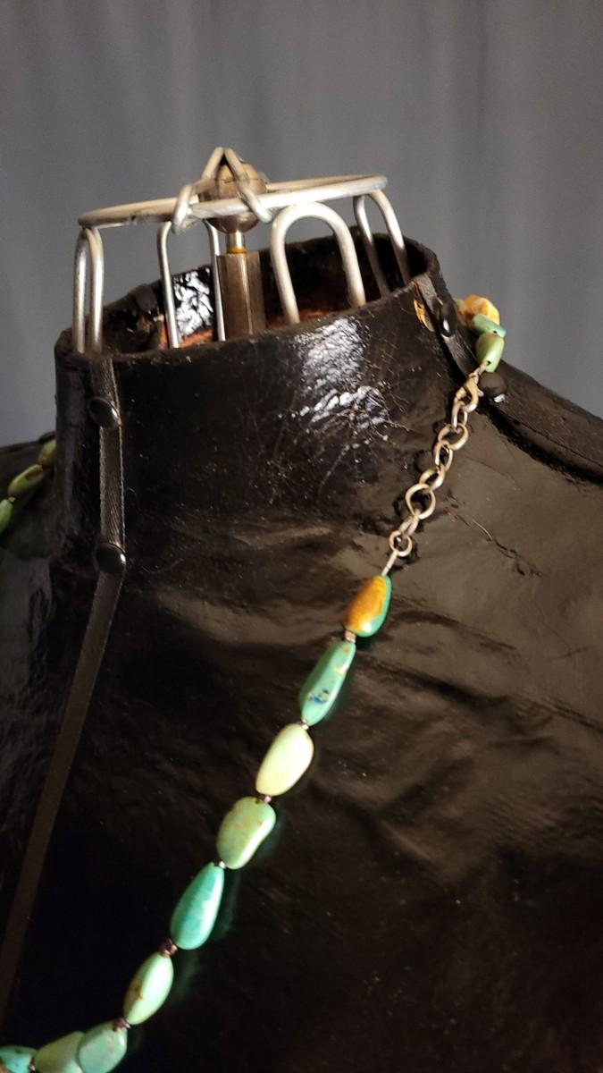 This lot features a 22.5" Handmade Fine Art Beaded Turquoise Necklace. There are two junction points on the necklace creating a non-symetrical design that creates opportunities to present itself in dozens of different ways. The half dollar coin is added for scale in one of the photos (not included in the auction).