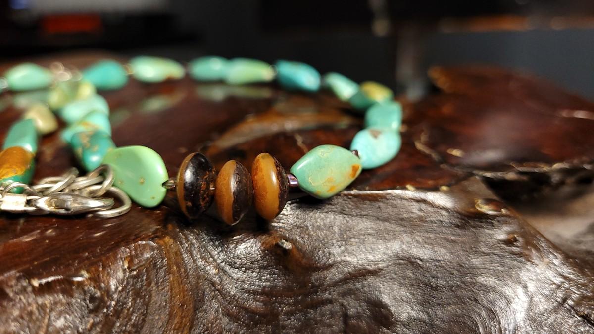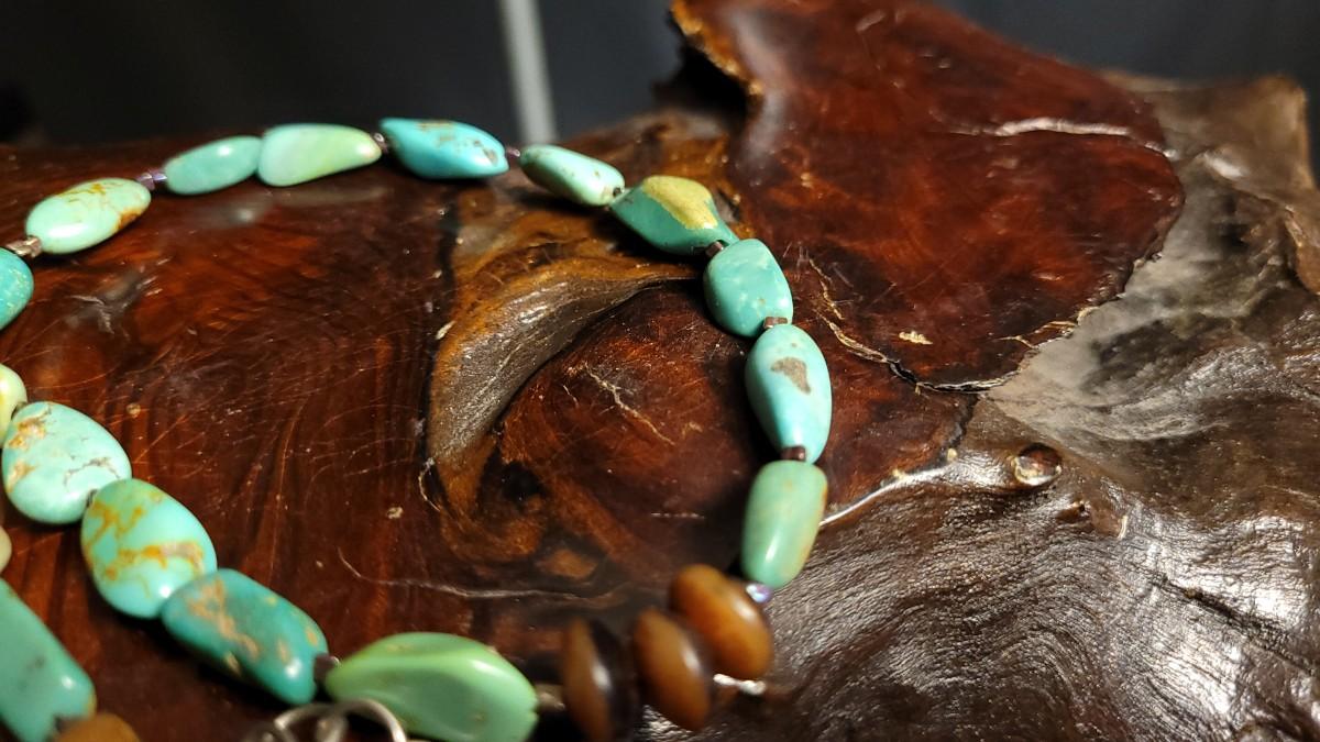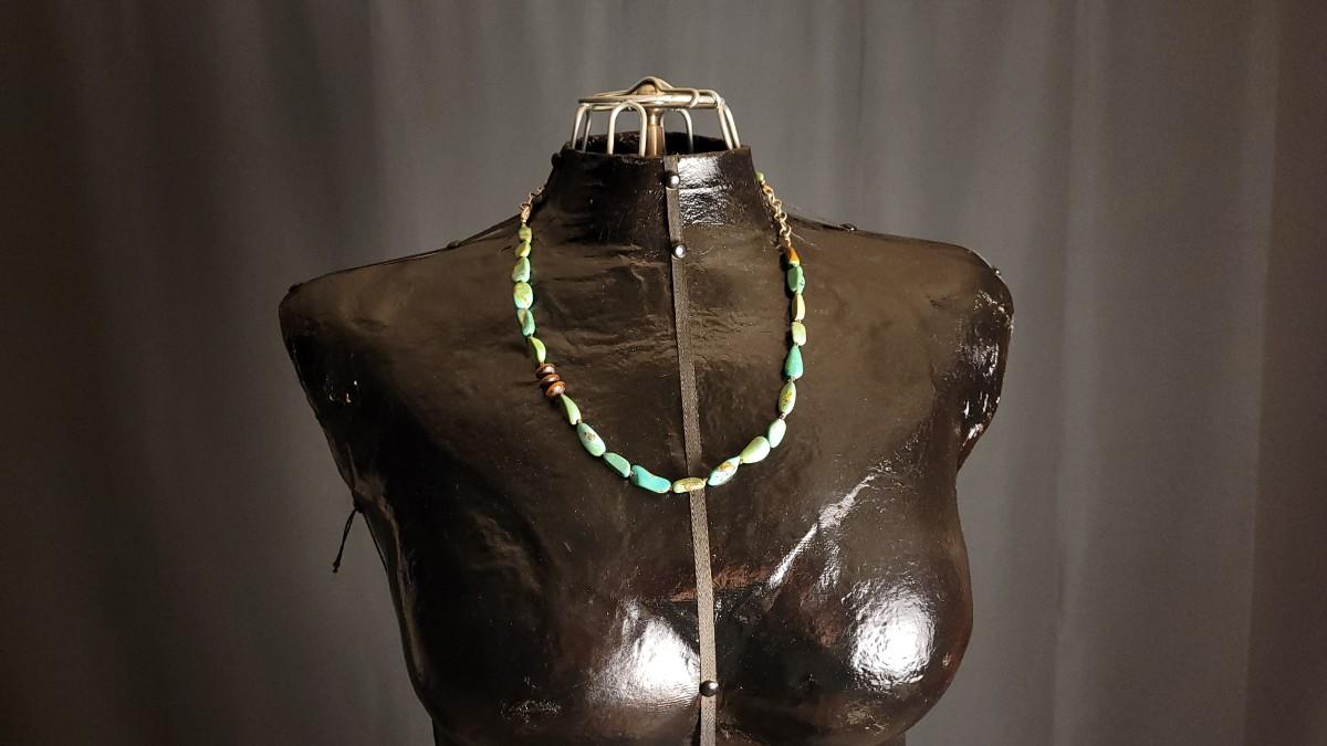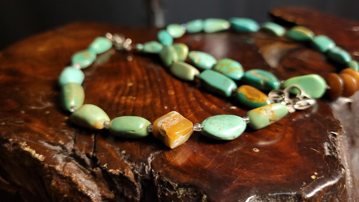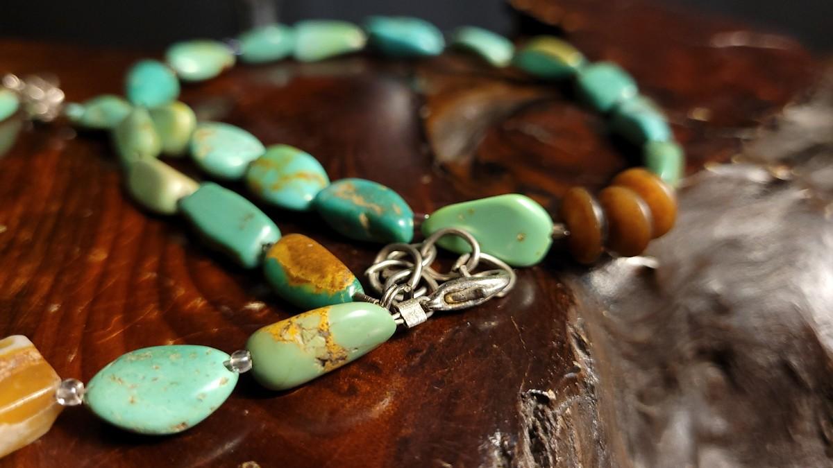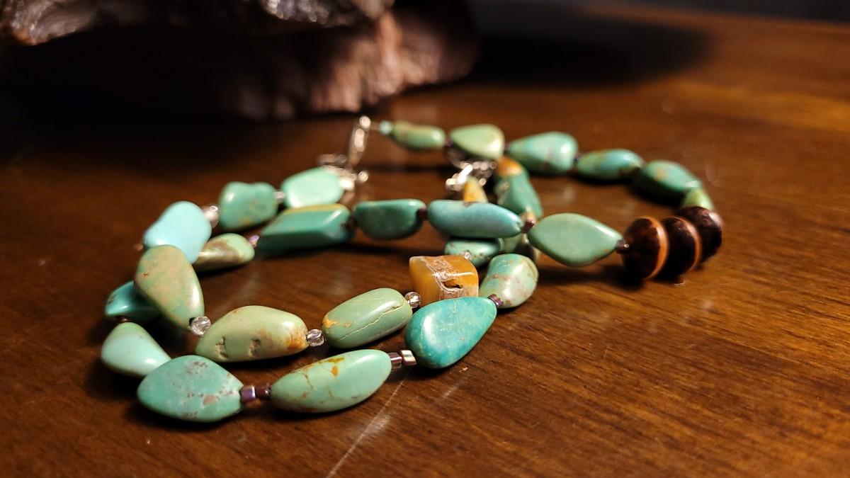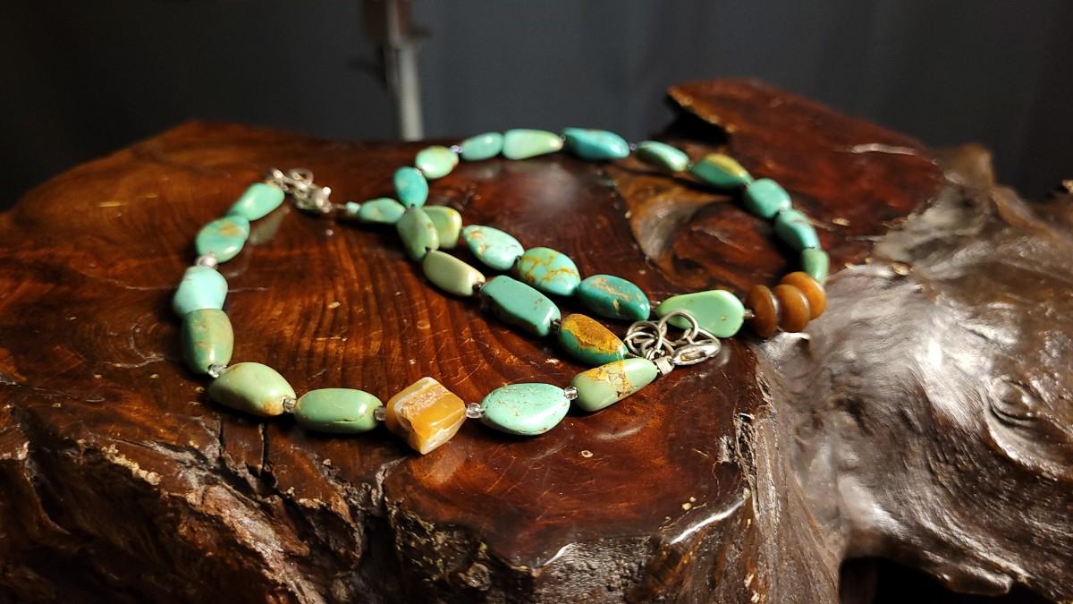 This lot features a 22.5" Handmade Fine Art Beaded Turquoise Necklace. There are two junction points on the necklace creating a non-symetrical design that creates opportunities to present itself in dozens of different ways. The half dollar coin is added for scale in one of the photos (not included in the auction).