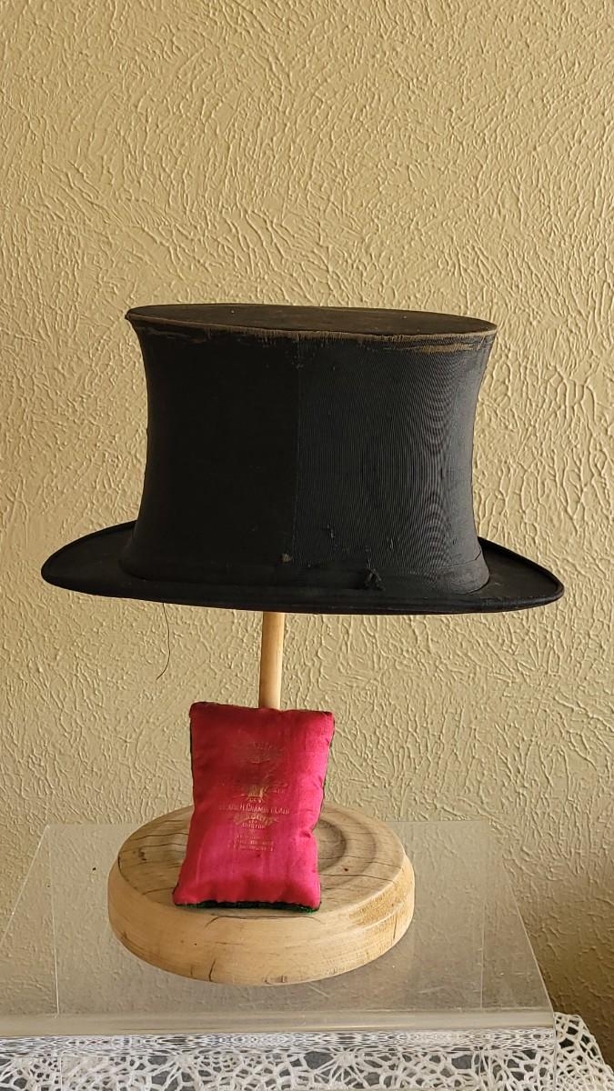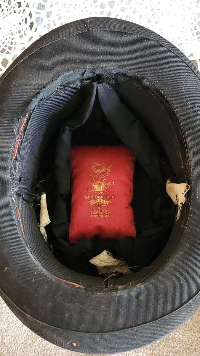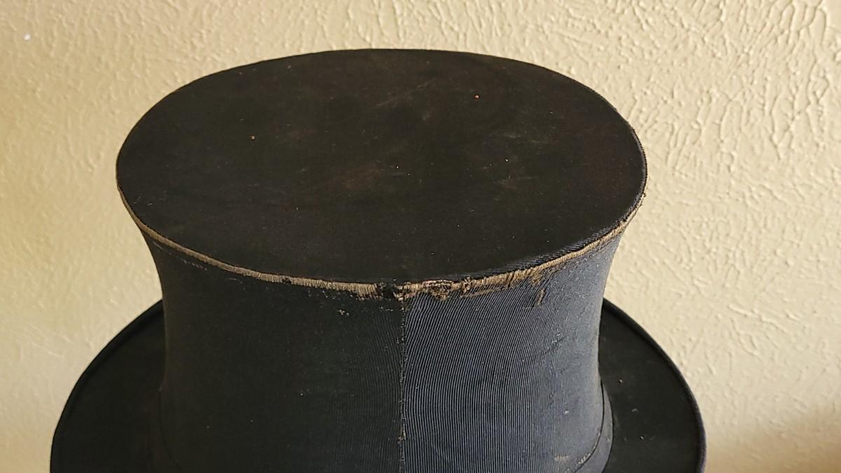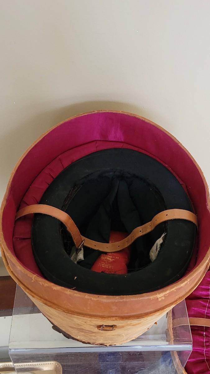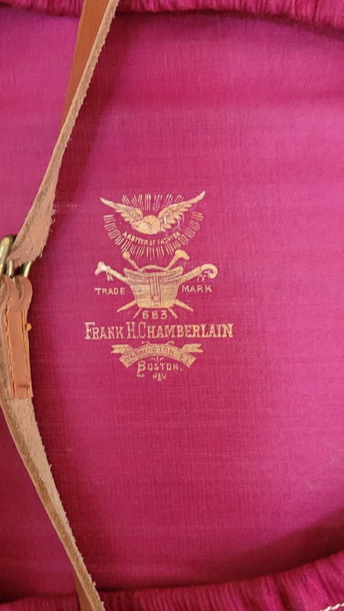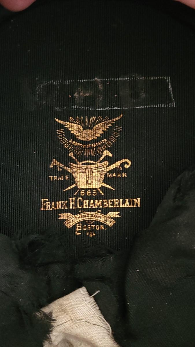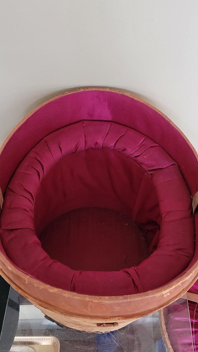 Box has straps that have broken but the straps are still present with the box. The top hat, box and small Cushion all have the Original Frank H. CHAMBERLAIN Label which is amazing that all 3 pieces have stayed together for so long! The leather box has some what appears to be heat/fire damage to one bottom side. The top hat is a Collapsible Opera Hat. The interior of the hat has fallen down but not ripped out, the material is still attached at the top and can be repaired. Impressive set!