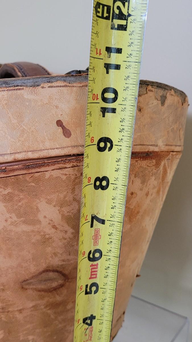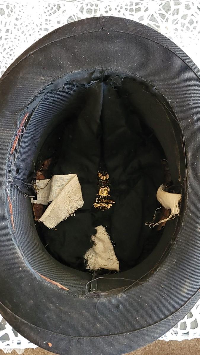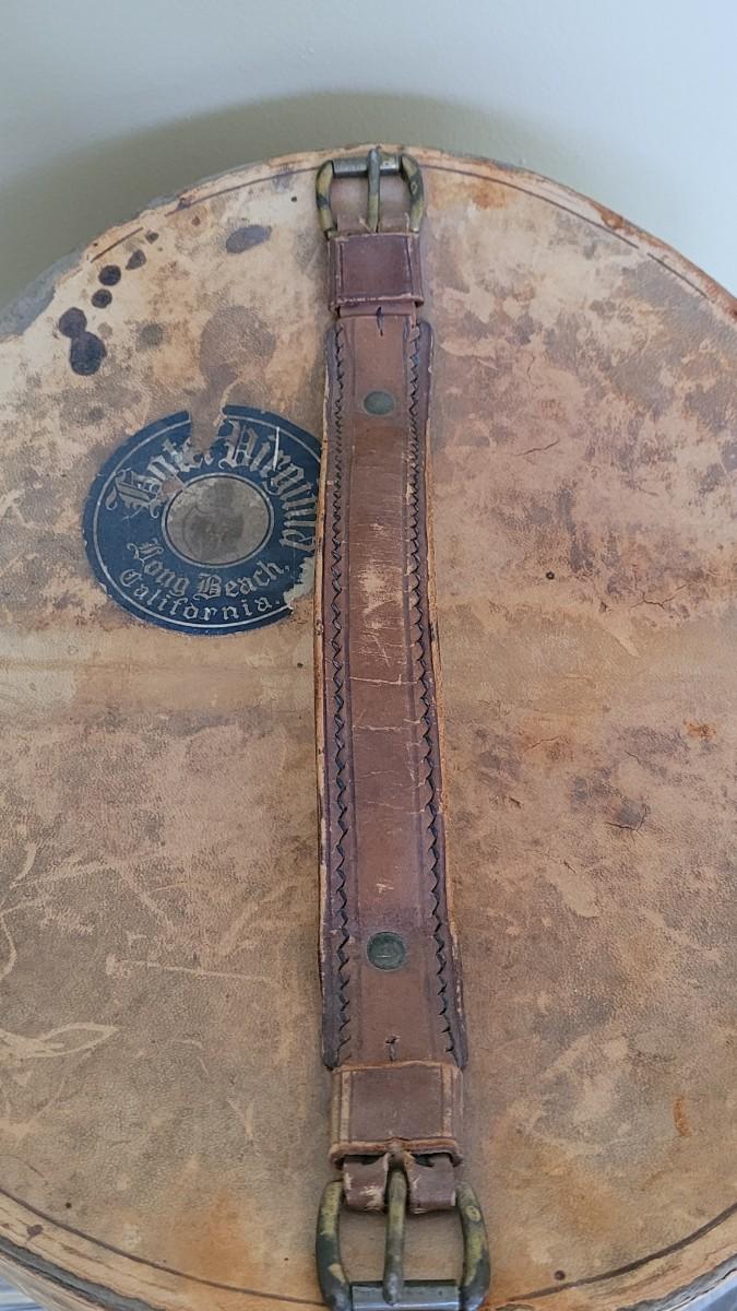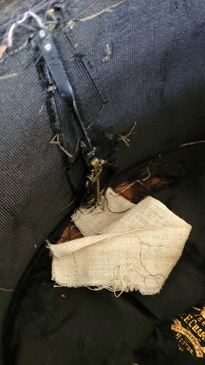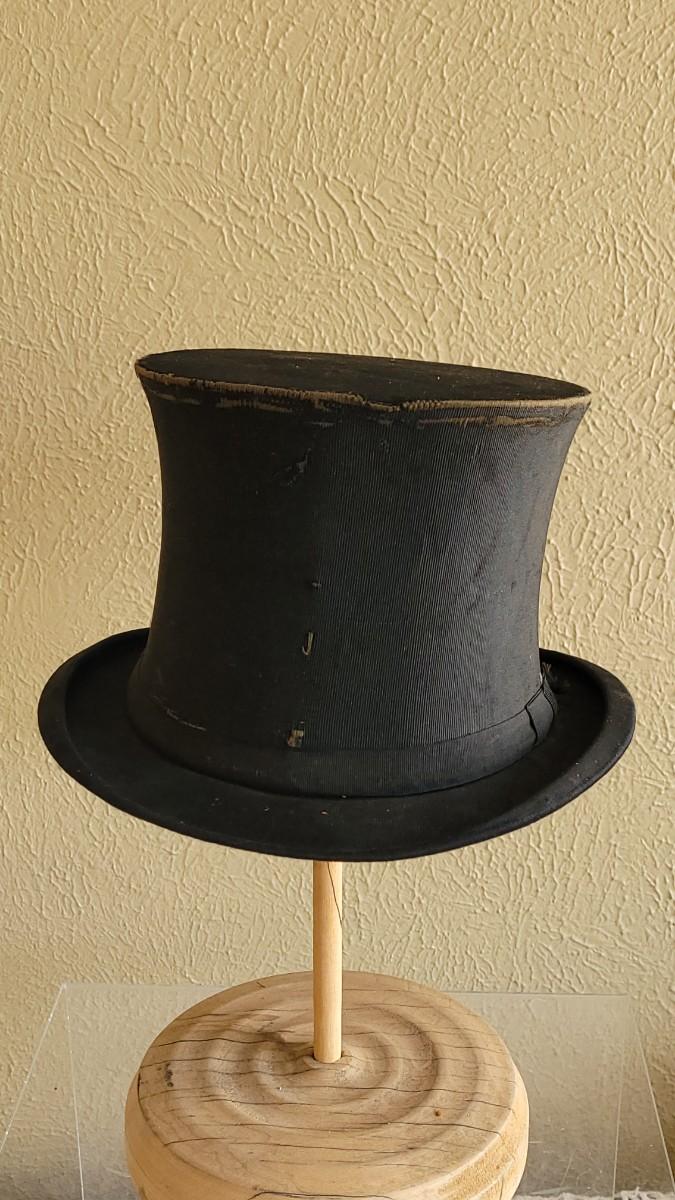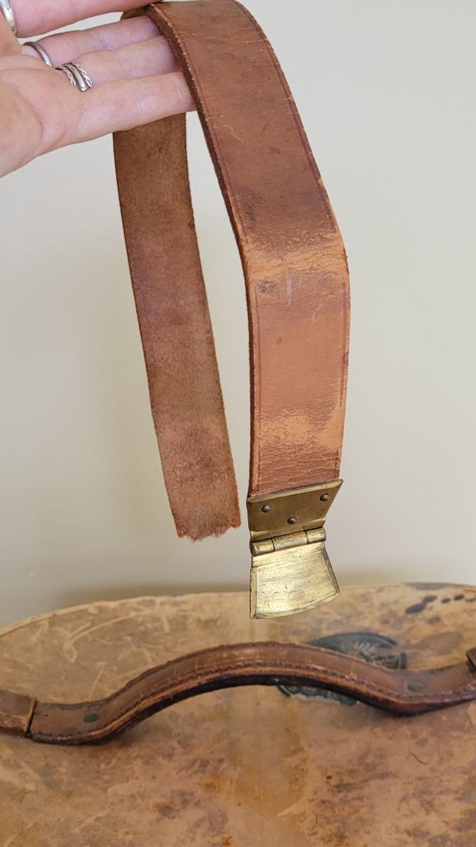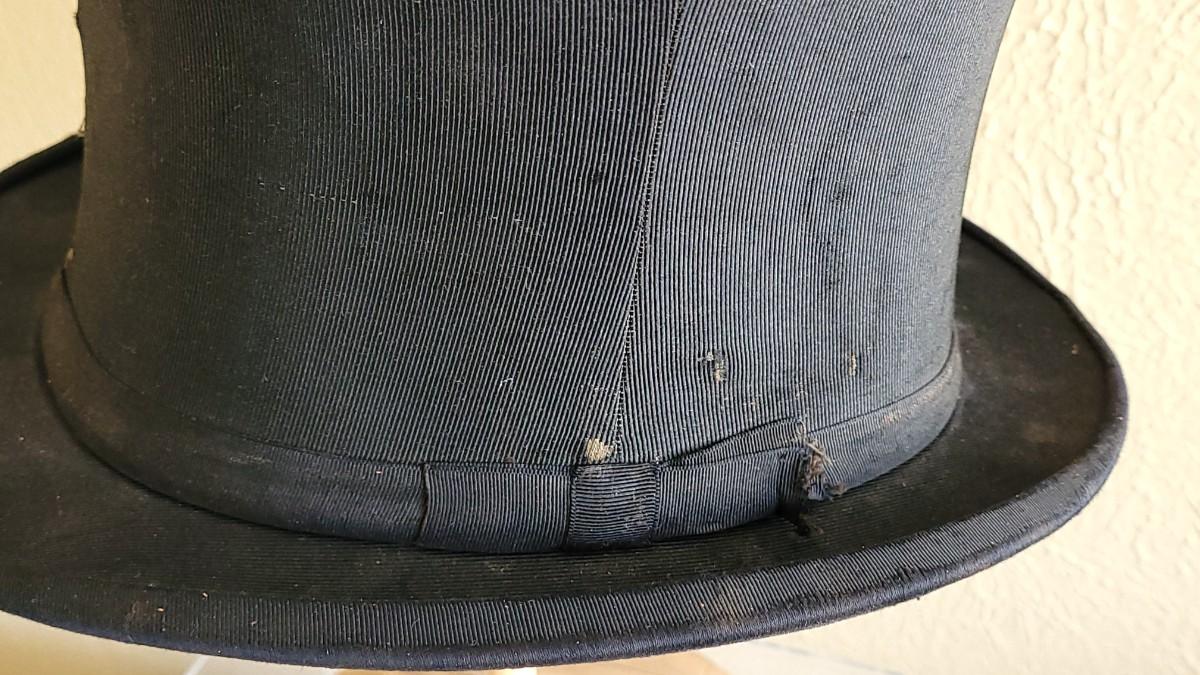 Box has straps that have broken but the straps are still present with the box. The top hat, box and small Cushion all have the Original Frank H. CHAMBERLAIN Label which is amazing that all 3 pieces have stayed together for so long! The leather box has some what appears to be heat/fire damage to one bottom side. The top hat is a Collapsible Opera Hat. The interior of the hat has fallen down but not ripped out, the material is still attached at the top and can be repaired. Impressive set!