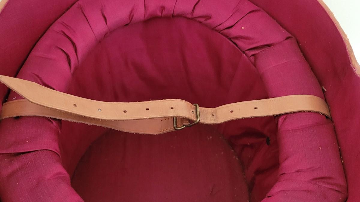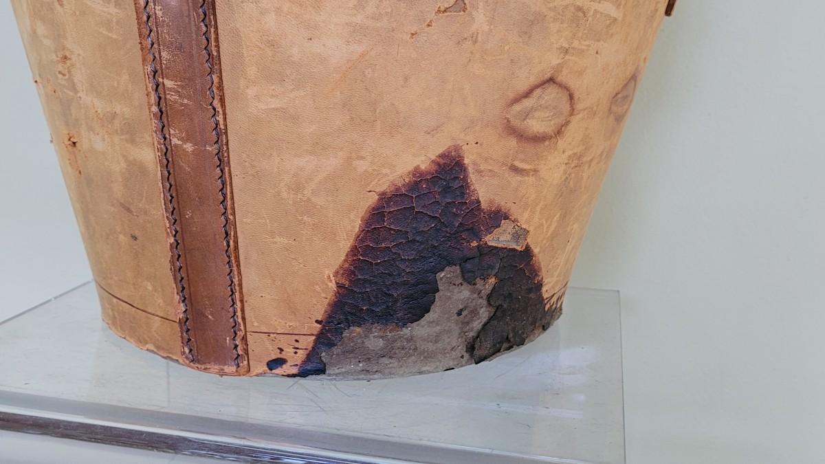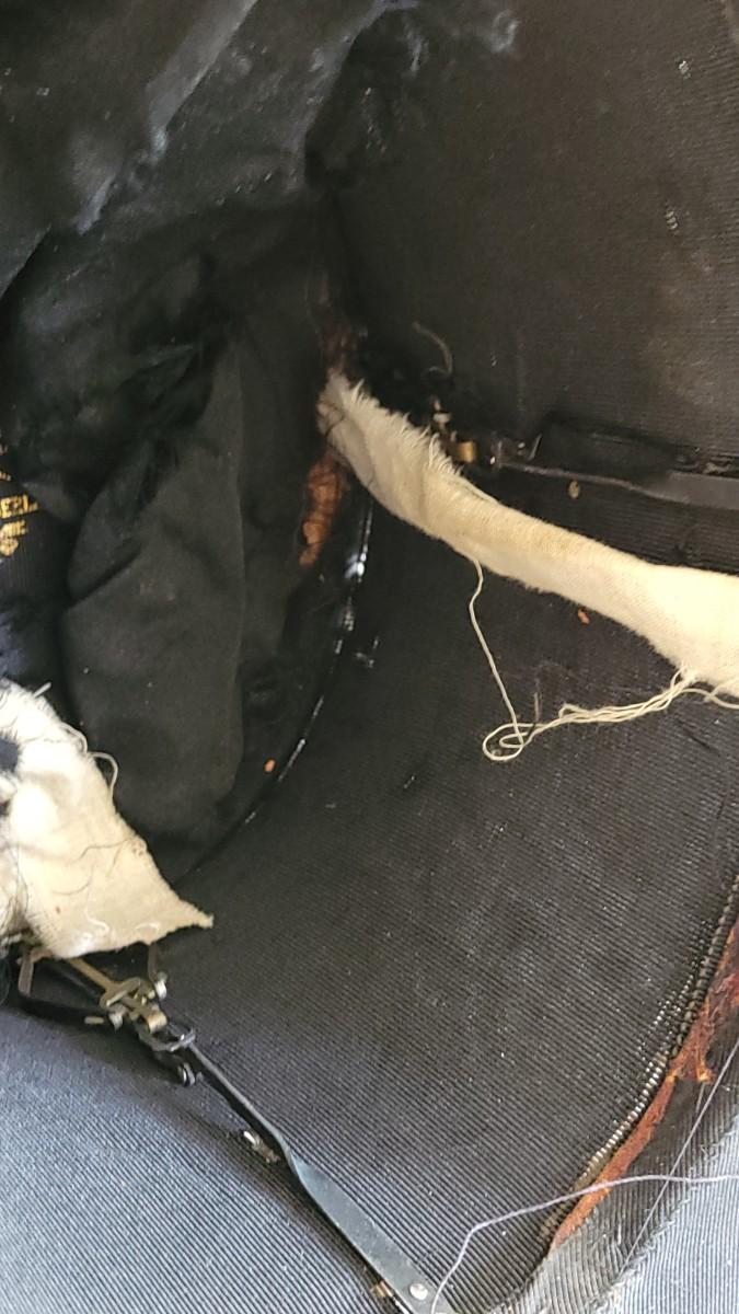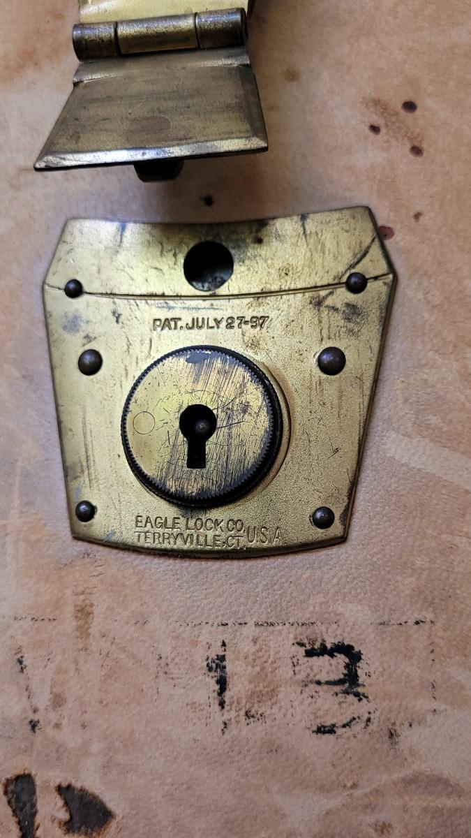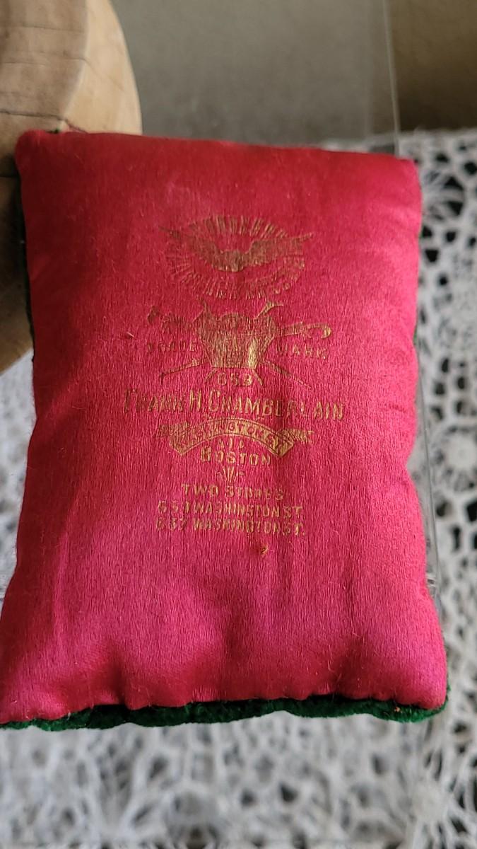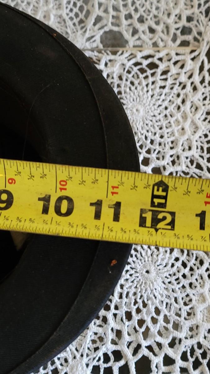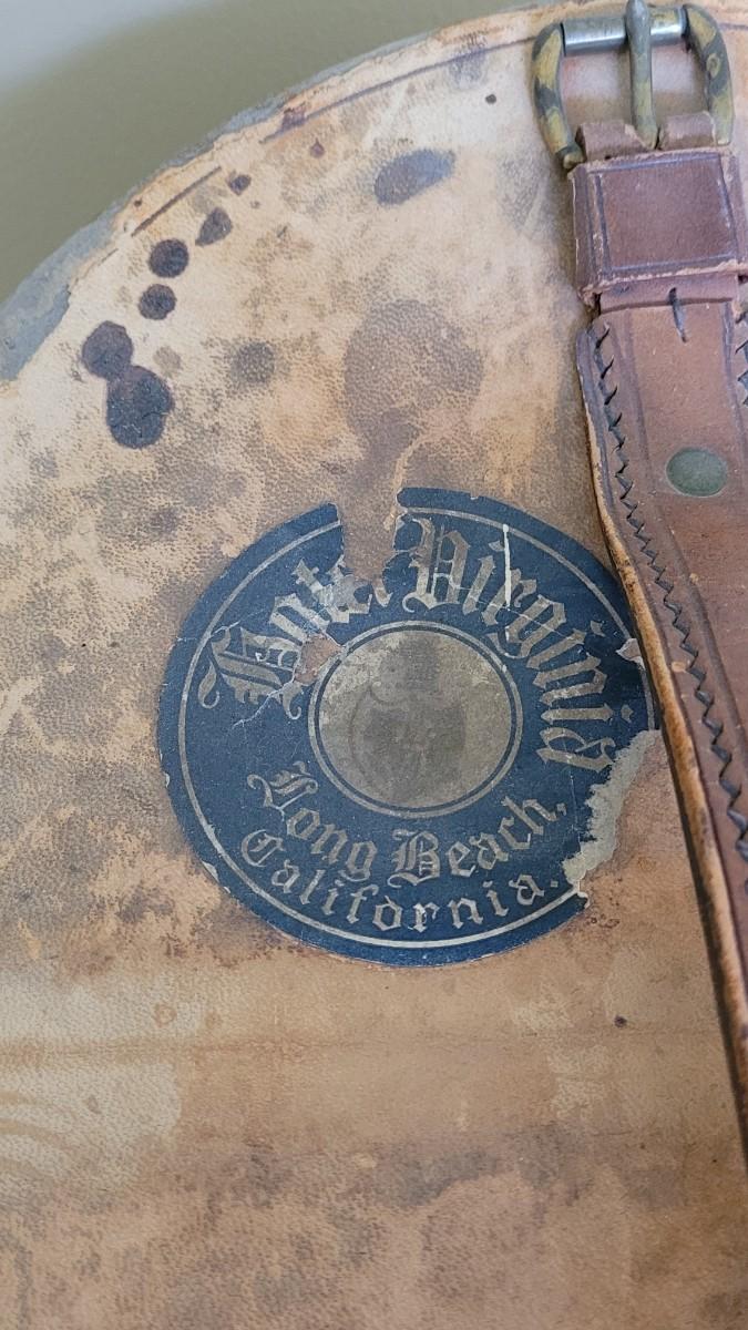 Box has straps that have broken but the straps are still present with the box. The top hat, box and small Cushion all have the Original Frank H. CHAMBERLAIN Label which is amazing that all 3 pieces have stayed together for so long! The leather box has some what appears to be heat/fire damage to one bottom side. The top hat is a Collapsible Opera Hat. The interior of the hat has fallen down but not ripped out, the material is still attached at the top and can be repaired. Impressive set!