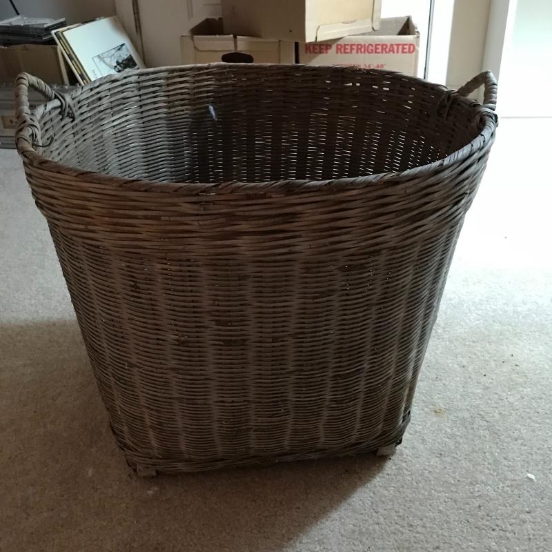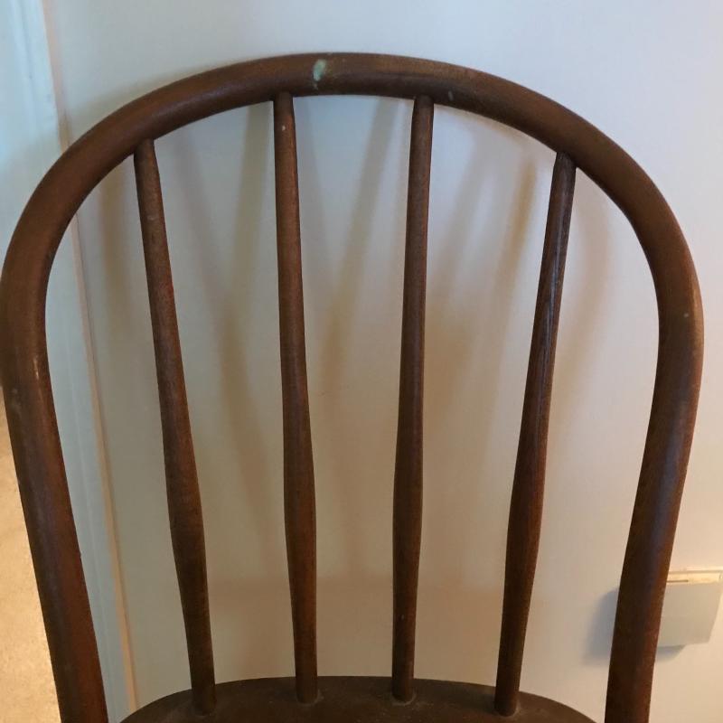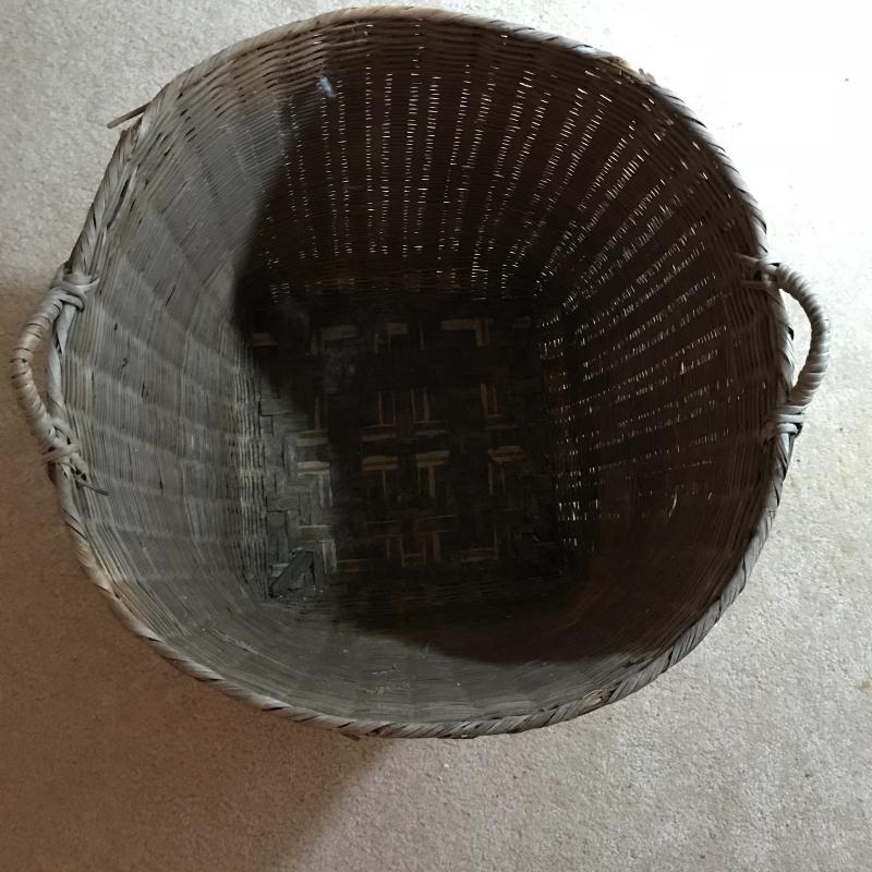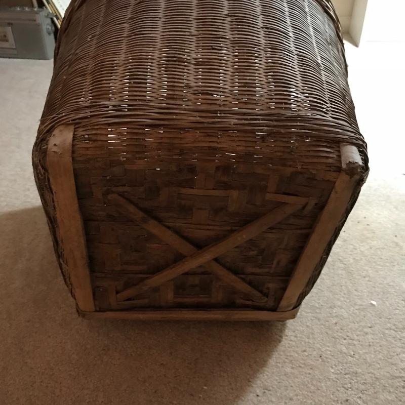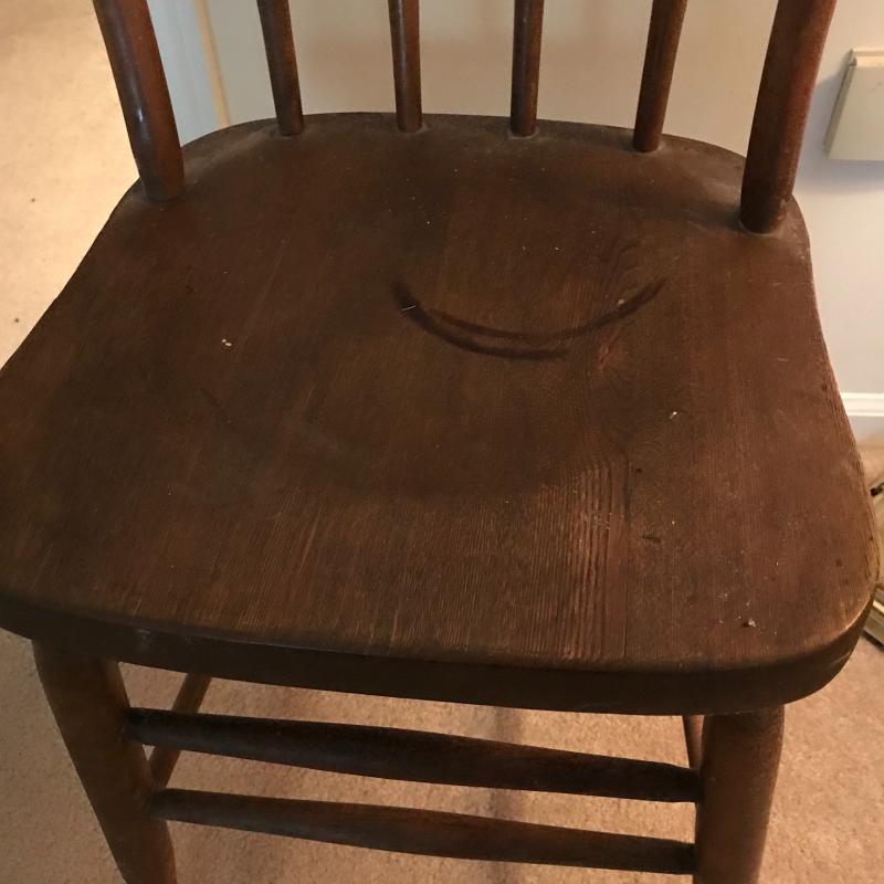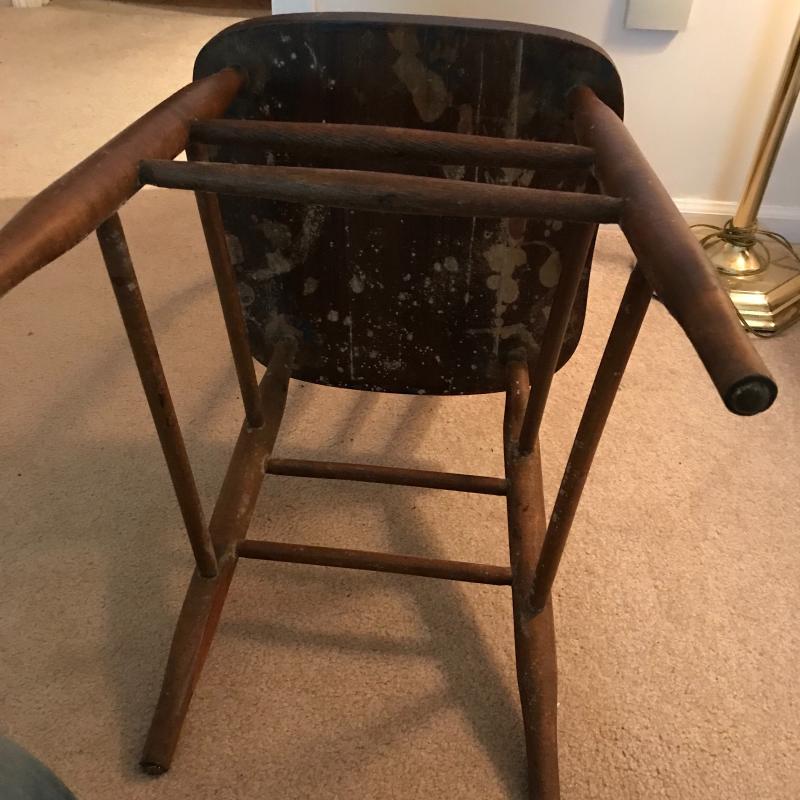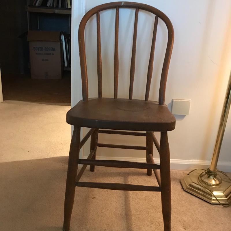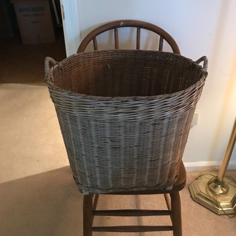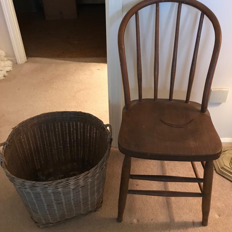 This lot includes a sturdy, antique wooden chair and large, beautiful basket. Chair is 16.5”l x 15.5”w x 34” h, and basket is 19” in diameter across the top and 16” tall to the top of the handles.