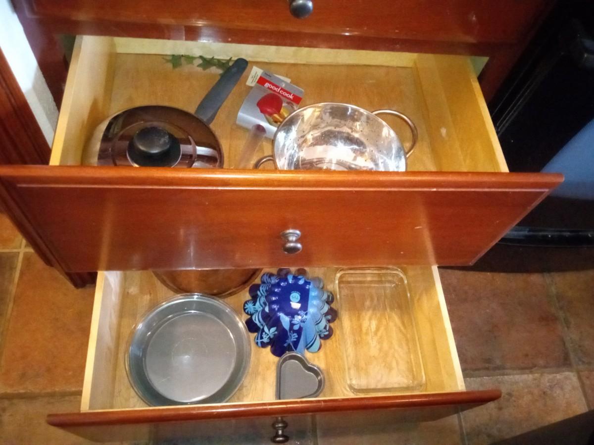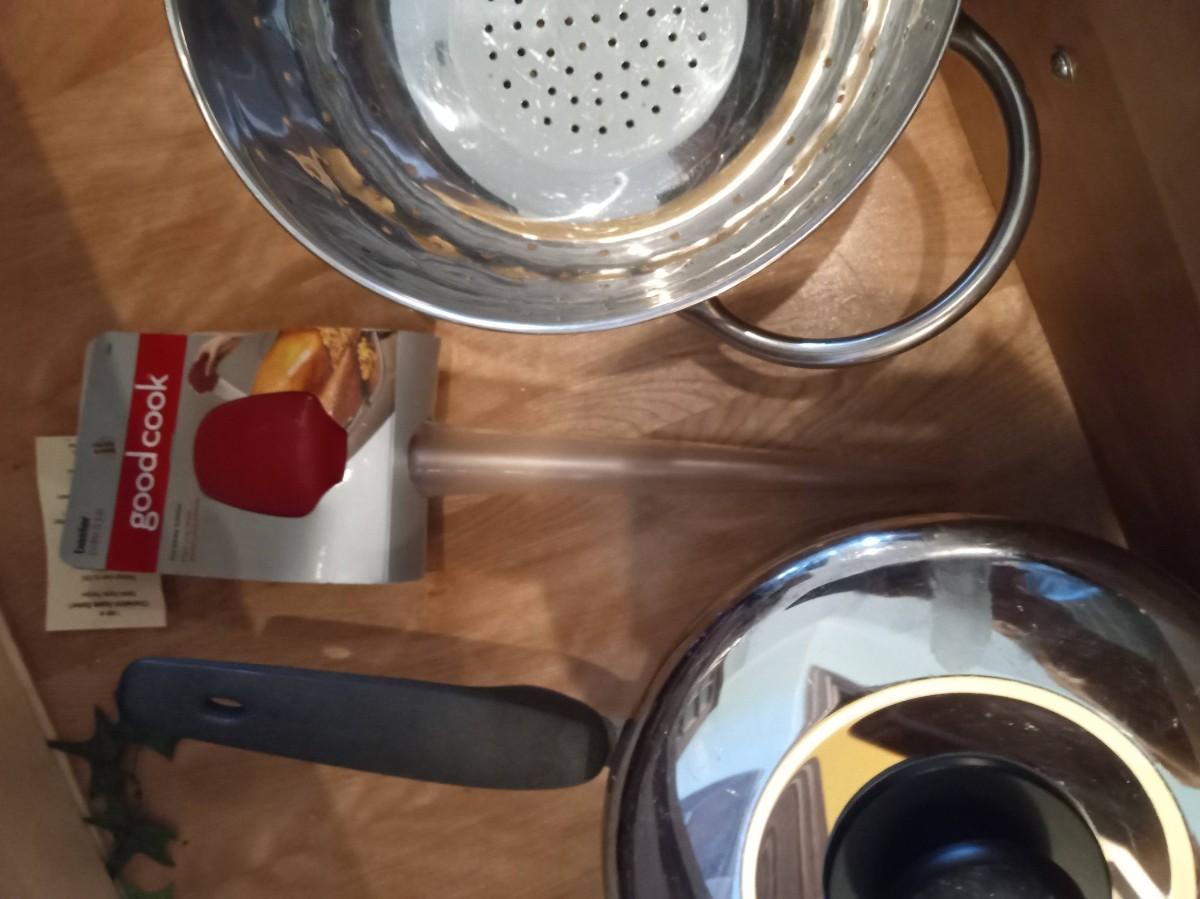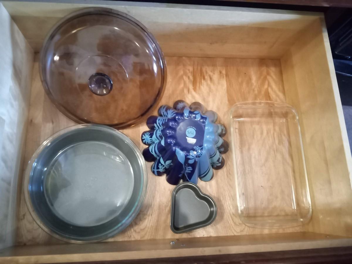 SAUCE PAN, COLANDER, MEASURING CUP, NEW TURKEY BASTER, JELLO MOLD, BAKING DISH, PIE PANS AND A GLASS LID