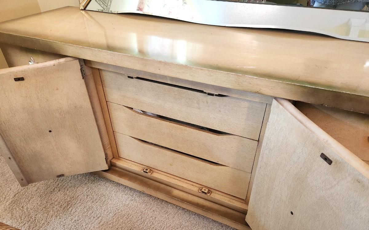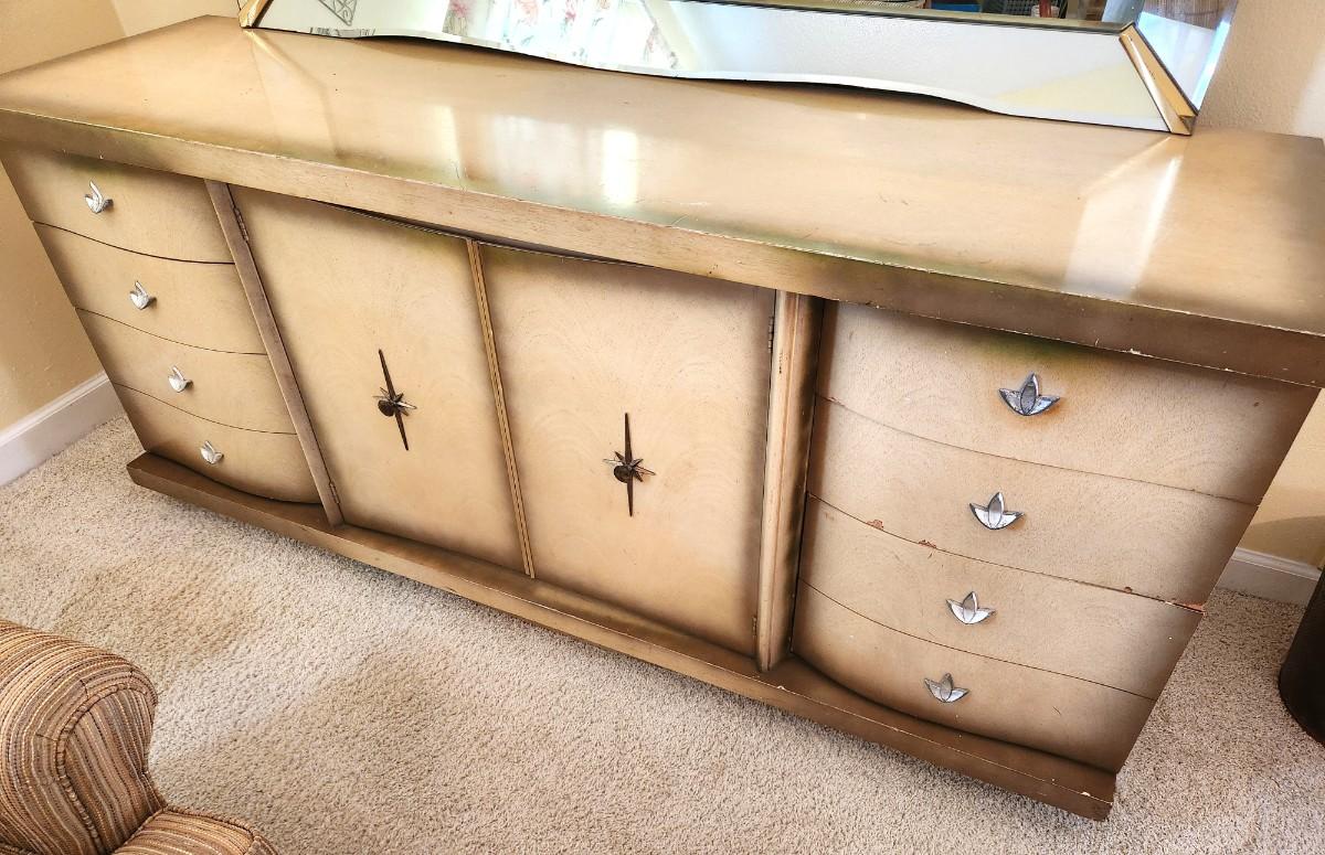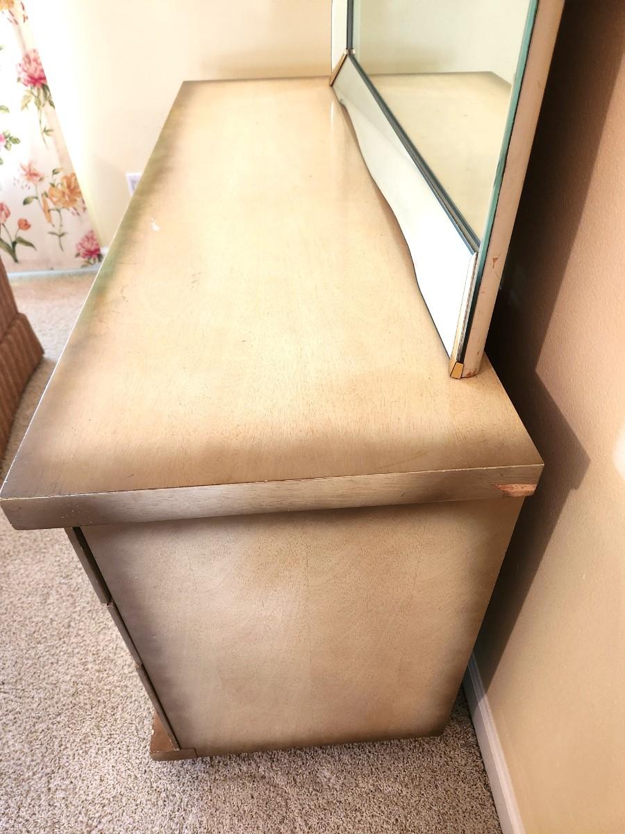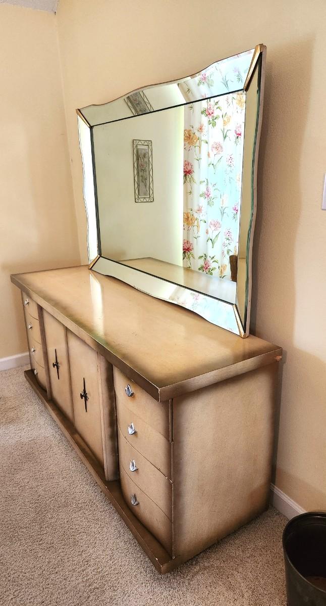 This piece matched the Chest of Drawers in Lot #121. Interesting "fade" effect - "Golden Bisque" color . 1960's Mid Century Modern Bedroom dresser from Basset Furniture Co. - unusual Beveled mirror. Dresser measures 6 feet across, 21" deep, and 70" tall, counting the mirror. The Mirror is 5 feet wide. Vintage condition. Mirror does come off for moving.