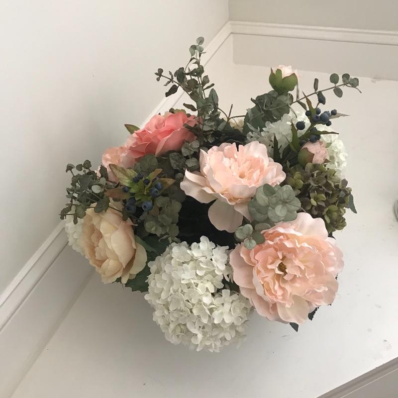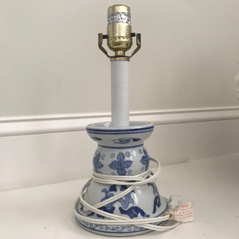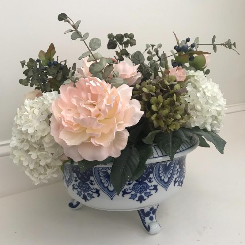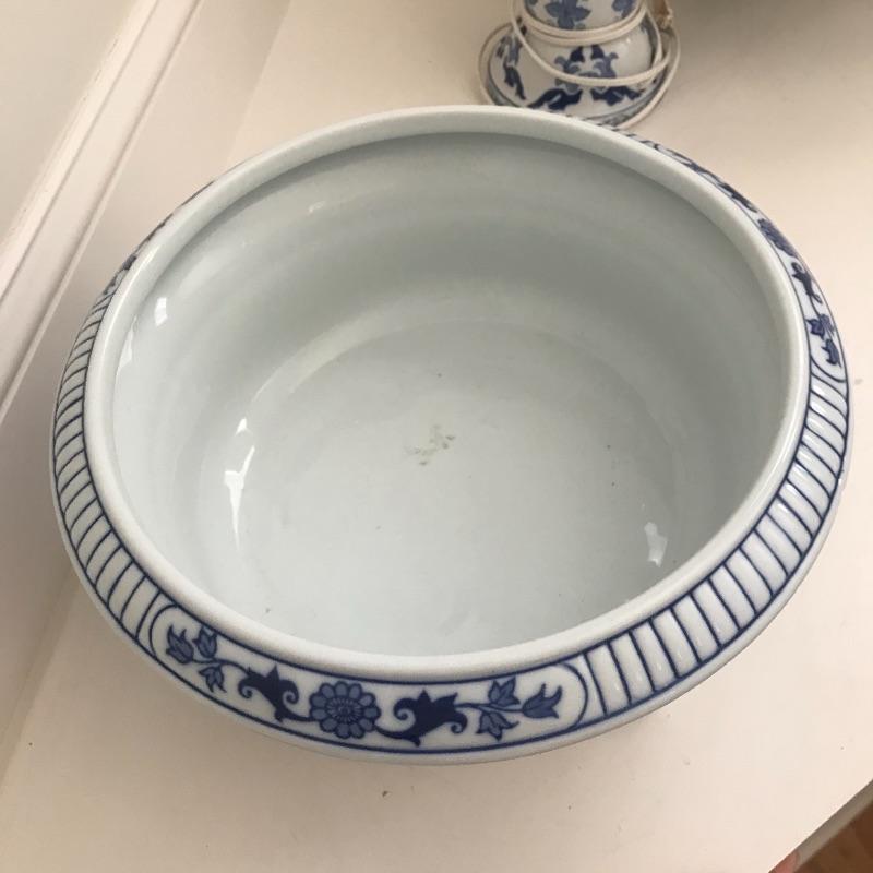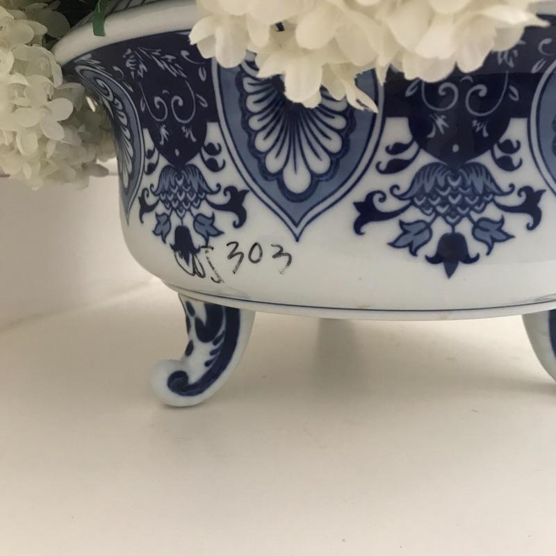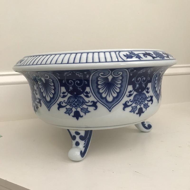 Two lovely blue and white ceramic footed bowls that are quite substantial. Each stands 7” tall and 13” diameter. Floral arrangement is removable and included. Lot also includes a small lamp in blue and white ceramic also which stands 11.5” tall. Local pick up only.