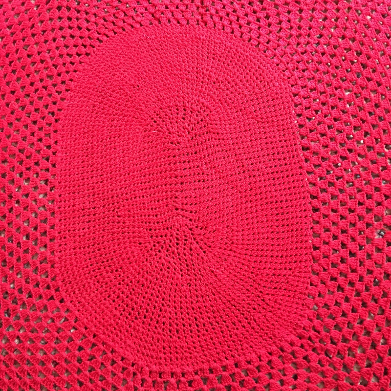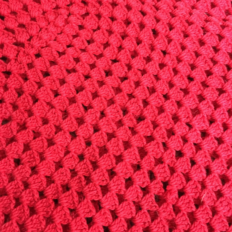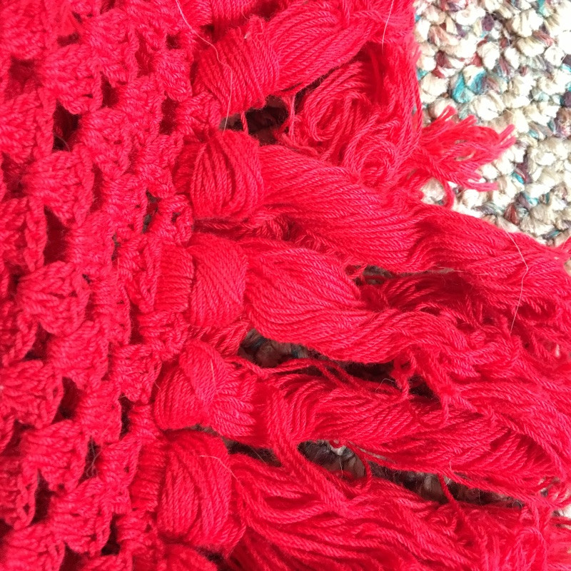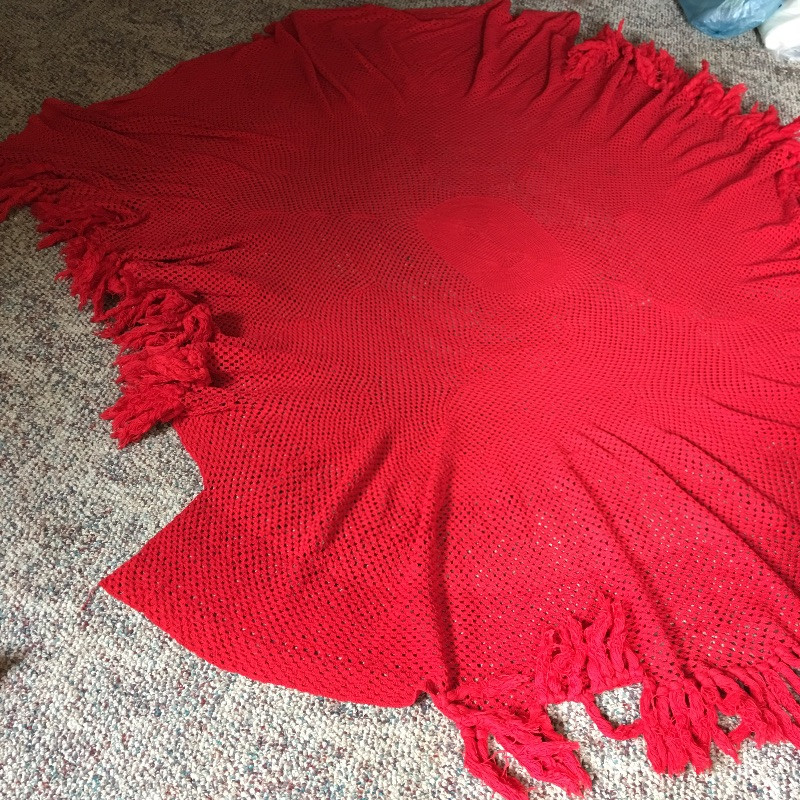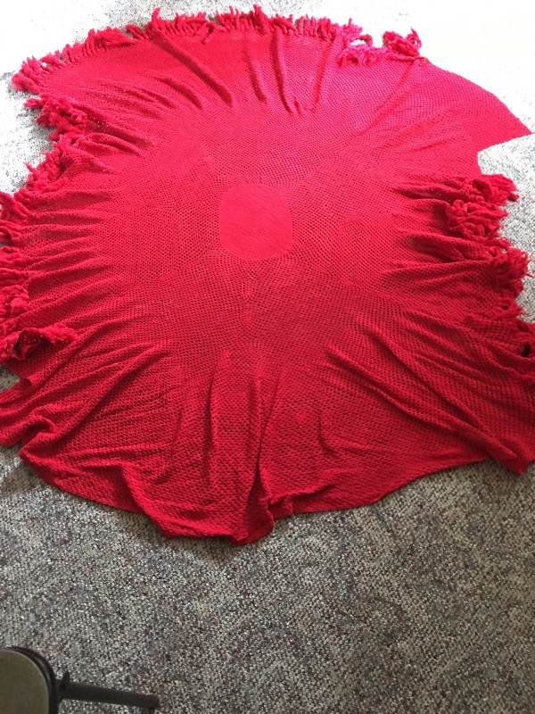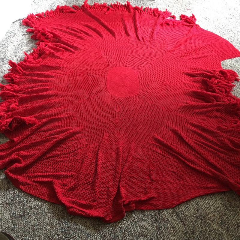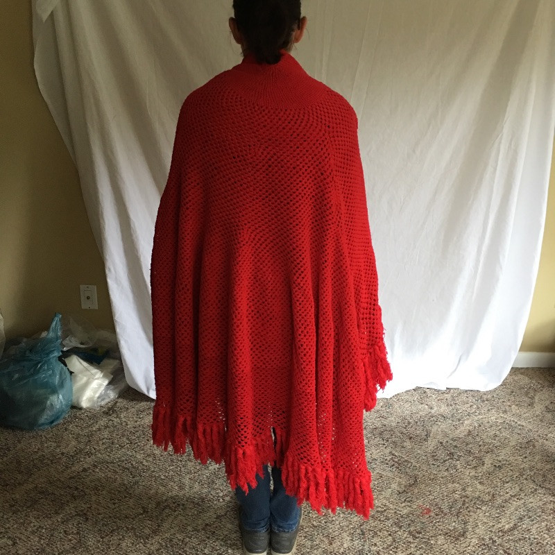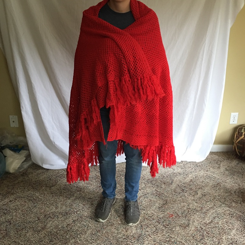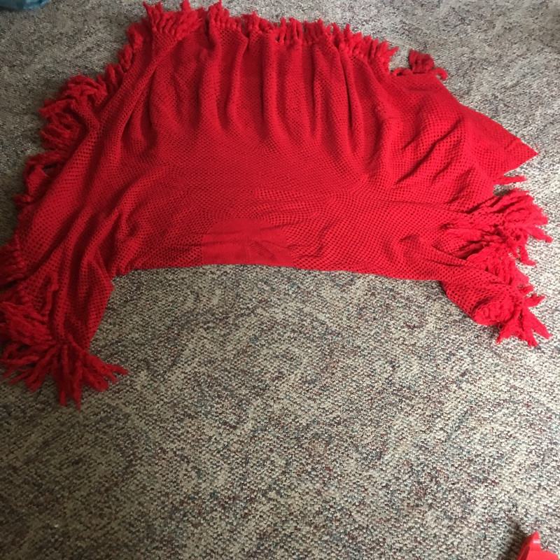Red crochet that appears to be a cape. Be the lady in red at your next party. Cape measures 62” x 82”.