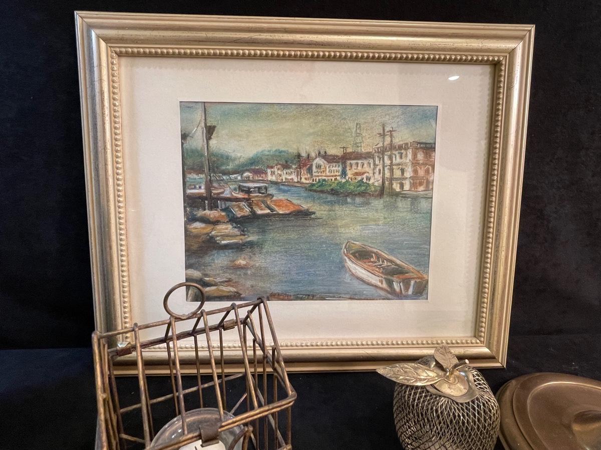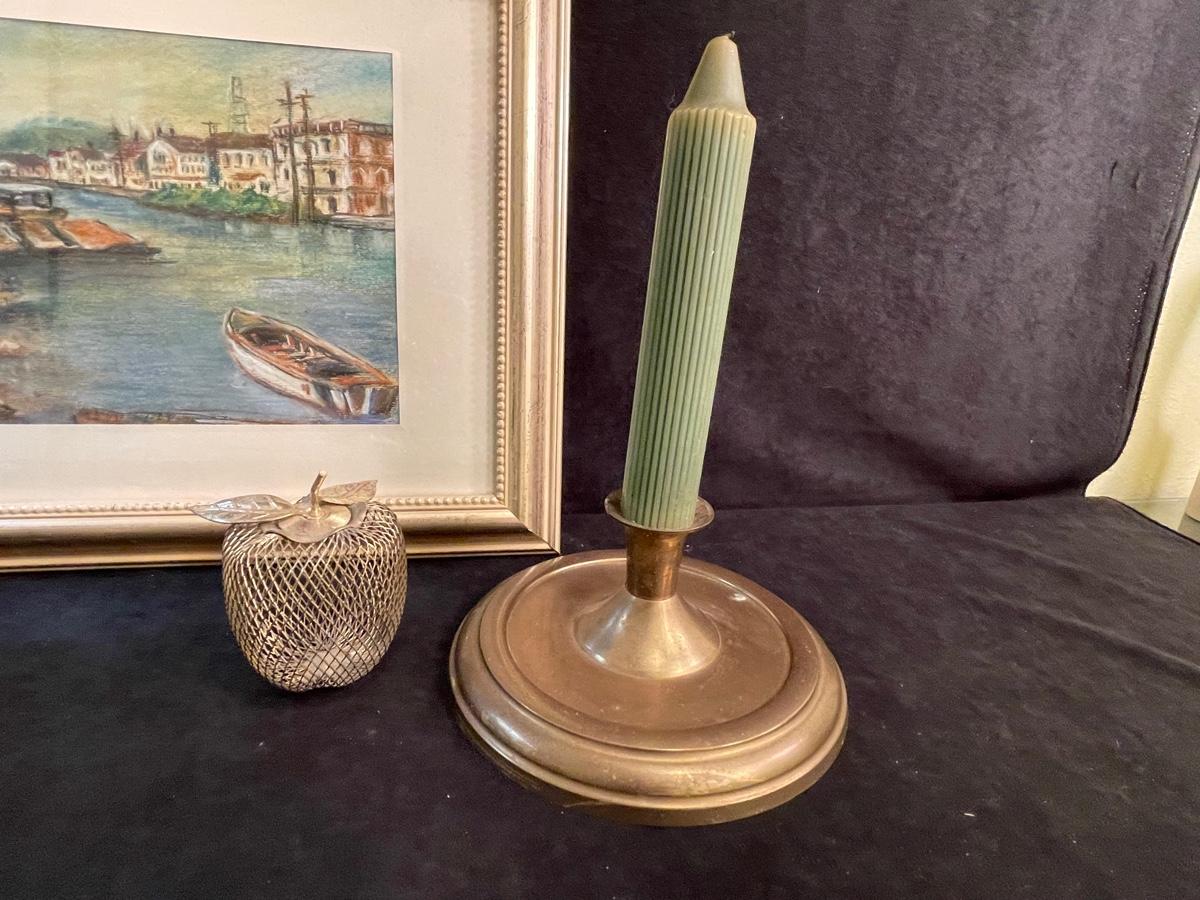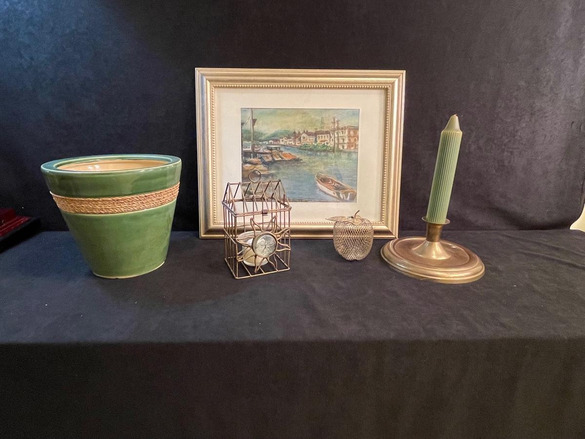 Boating motif framed watercolor print, green ceramic flower pot, candle holder and green candle, small brass mesh apple and metal votive holder