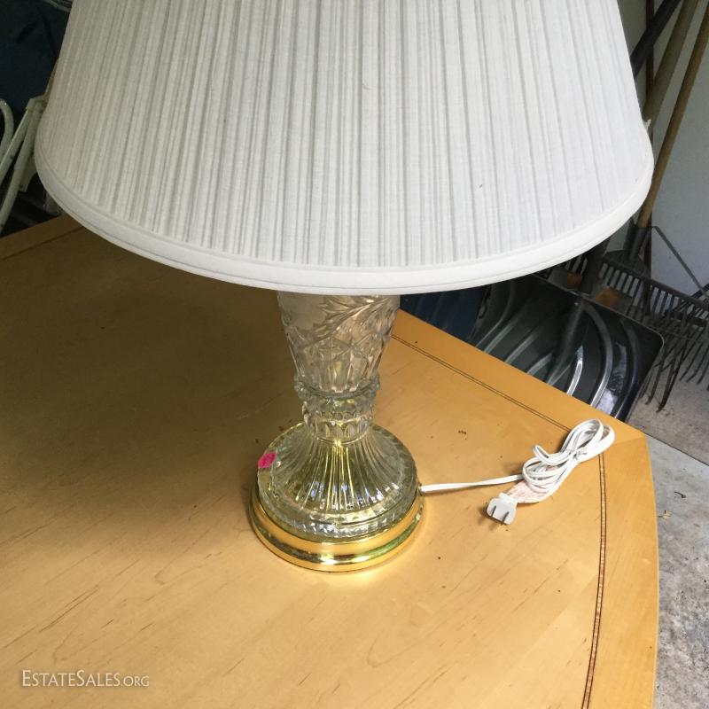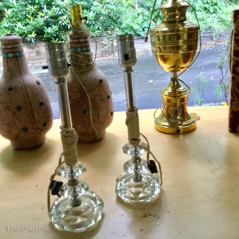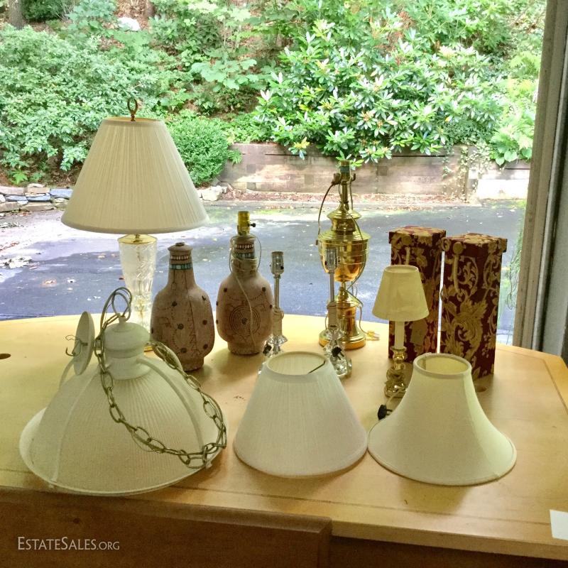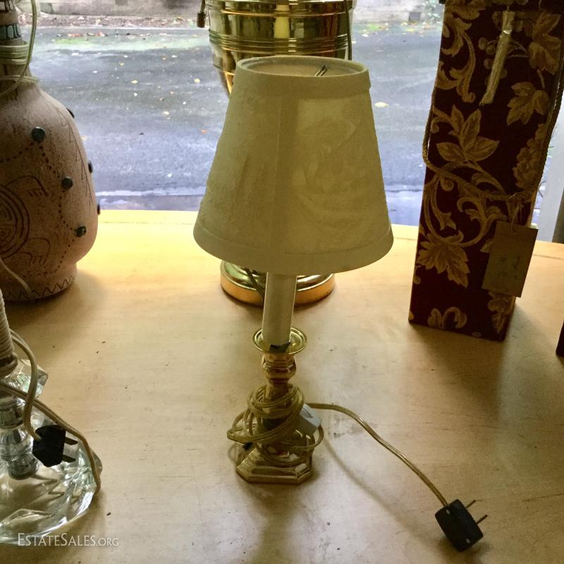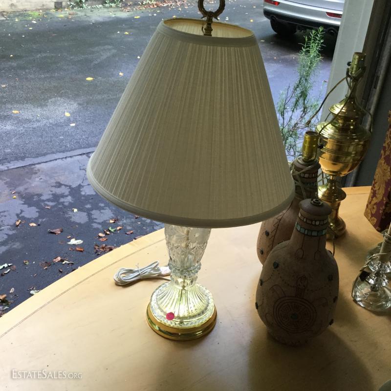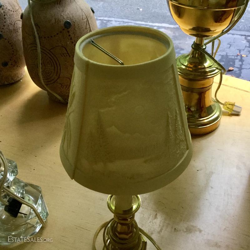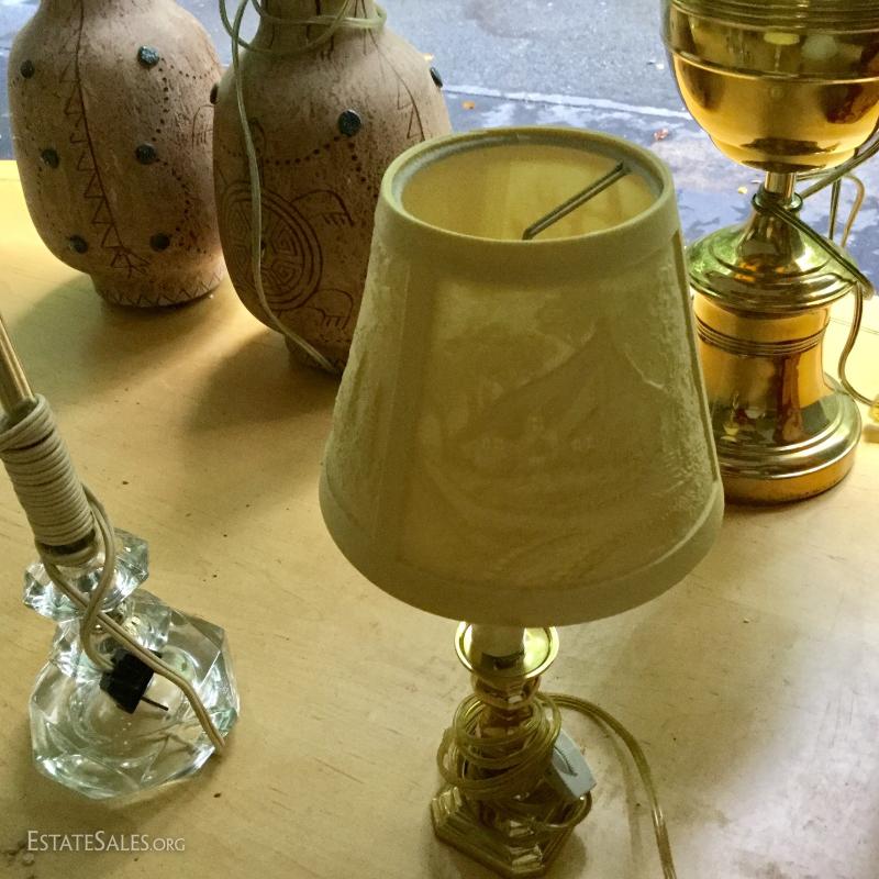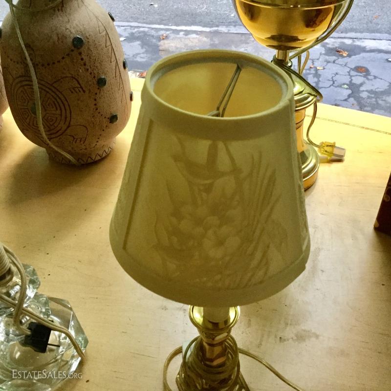 Several lamps and shades. Three glass (includes one matching pair,) two brass, two artistic ceramic (one with broken top). Tallest brass lamp base is 21". Ceramic bases are 17"h. Lot also includes two wine gift boxes.