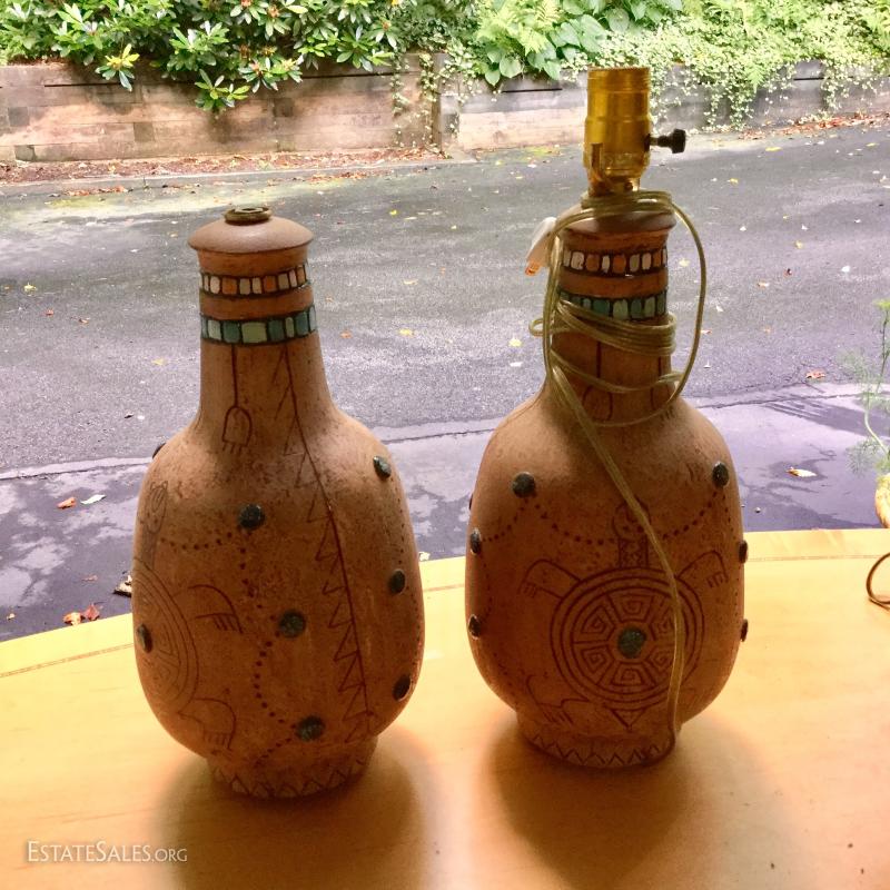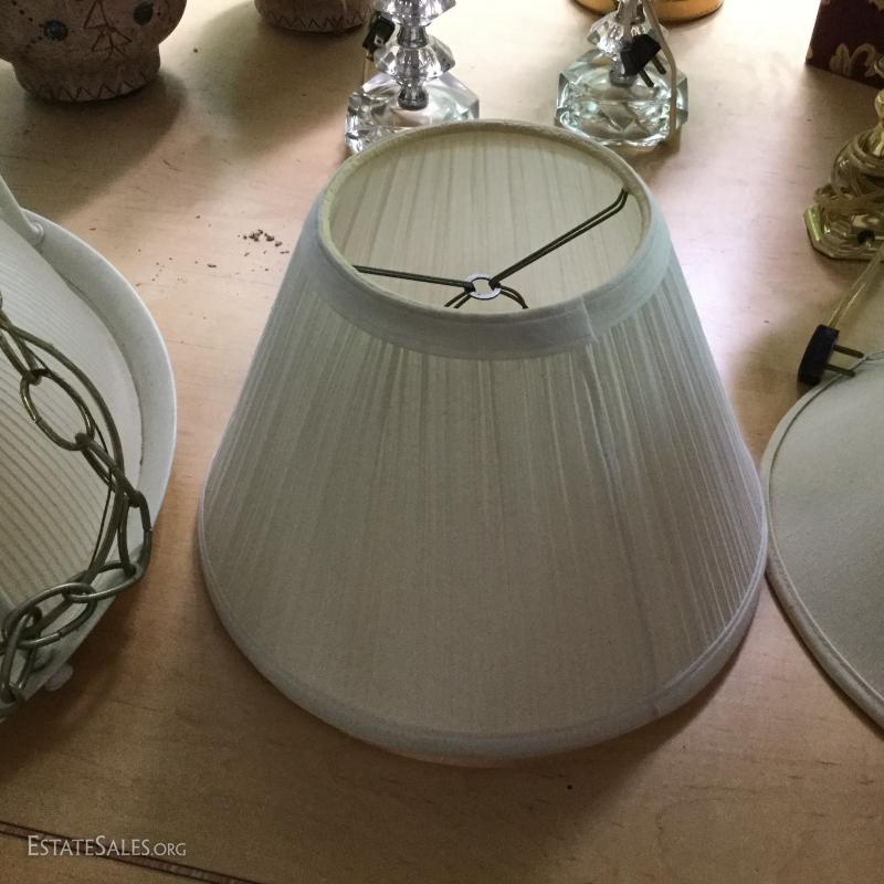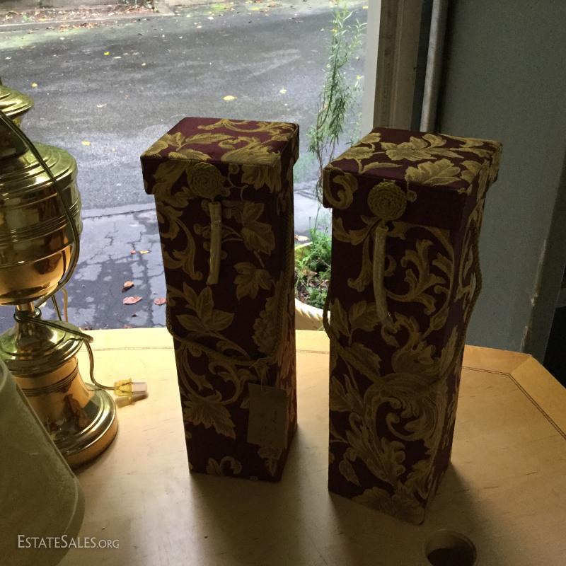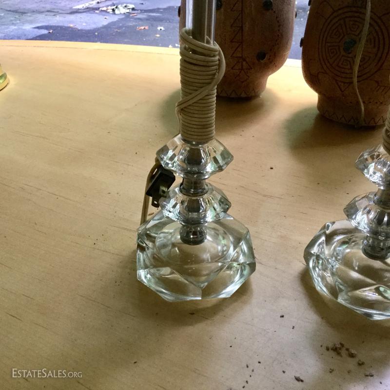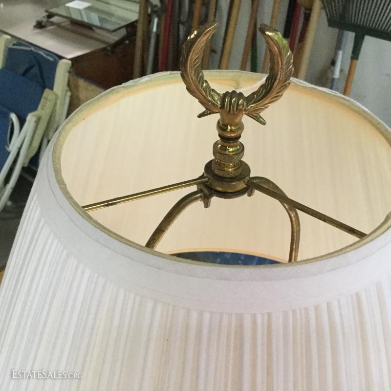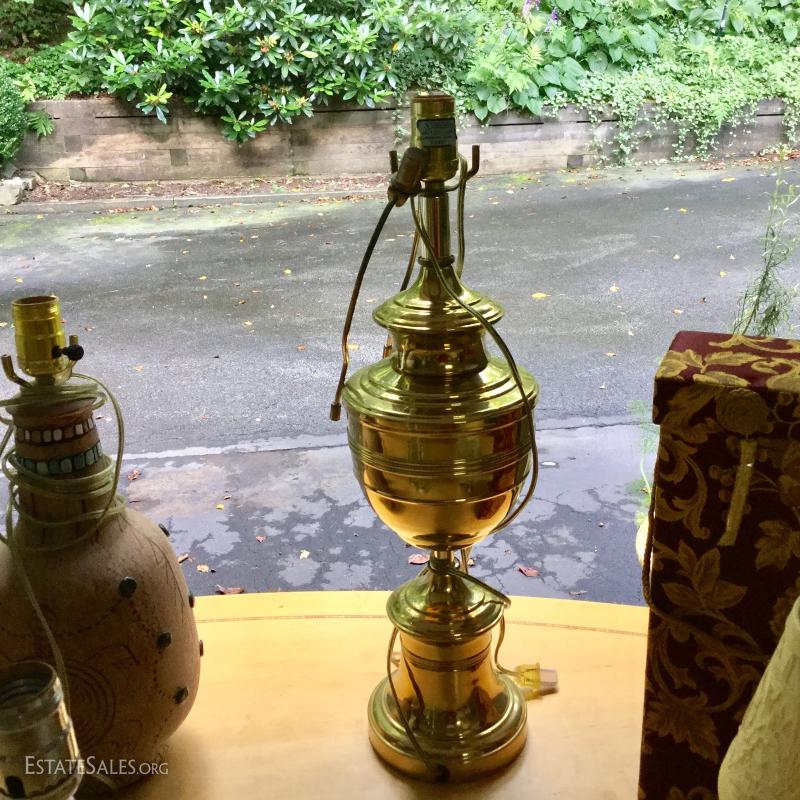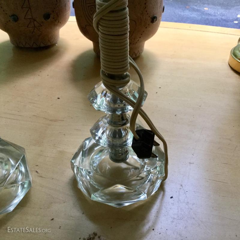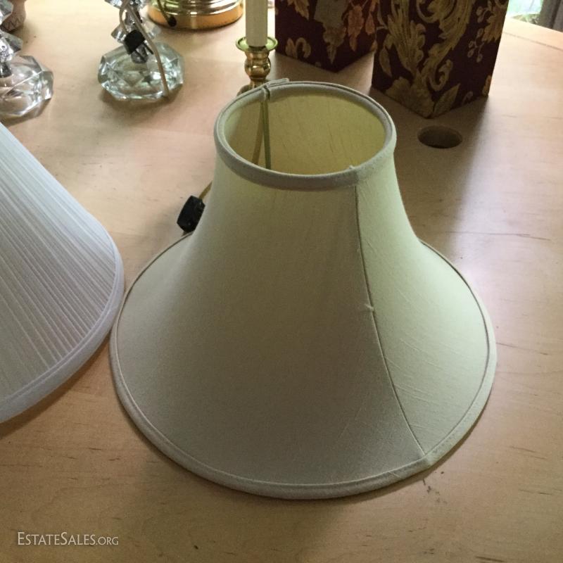 Several lamps and shades. Three glass (includes one matching pair,) two brass, two artistic ceramic (one with broken top). Tallest brass lamp base is 21". Ceramic bases are 17"h. Lot also includes two wine gift boxes.
