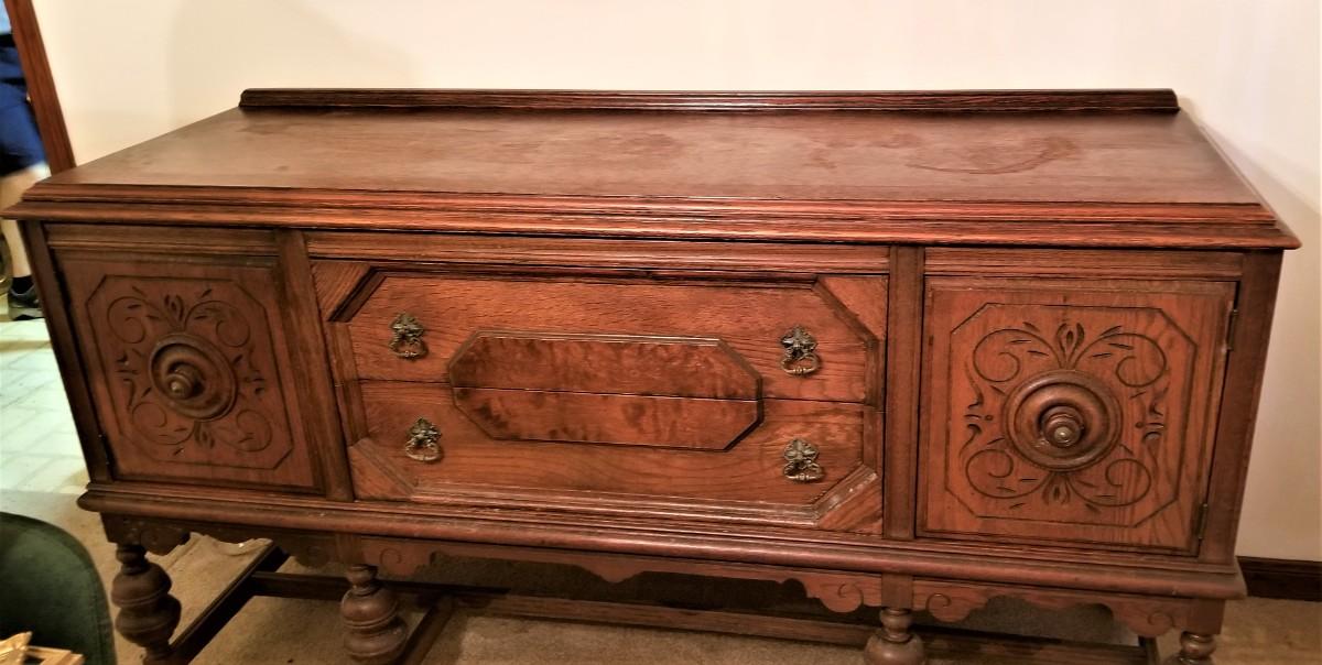 Solid oak Depression-era Sideboard - two drawers, storage on each side. Measures 22" deep, 66" across, 38" tall. Good antique condition. Note: some of the applied pieces on the bun feet have come unglued over time and fallen off - we have the pieces so they can be glued back on. Just takes a little work to restore to it's former glory, or go "Farmhouse Chic" with some chalk paint. Whoever buys this piece needs to be prepared to move and haul it themselves.