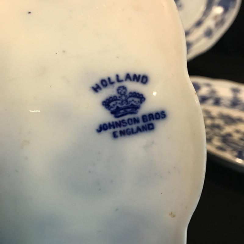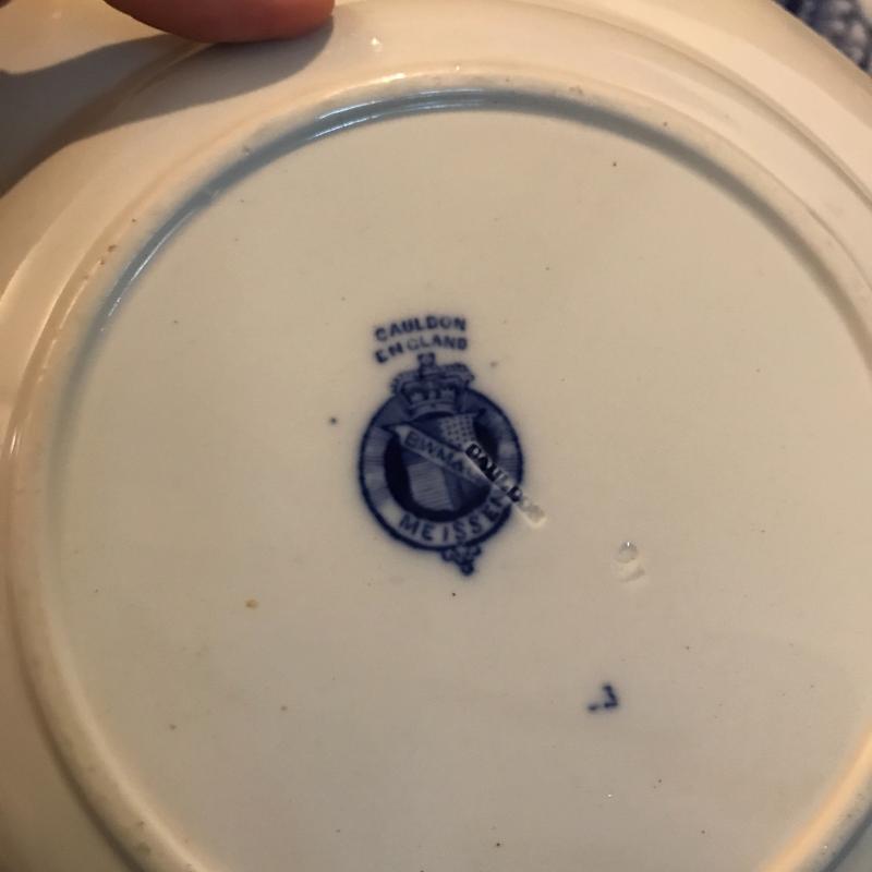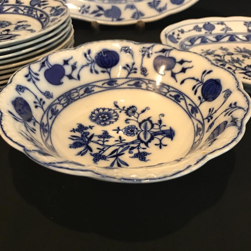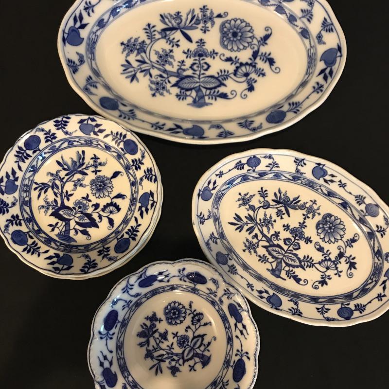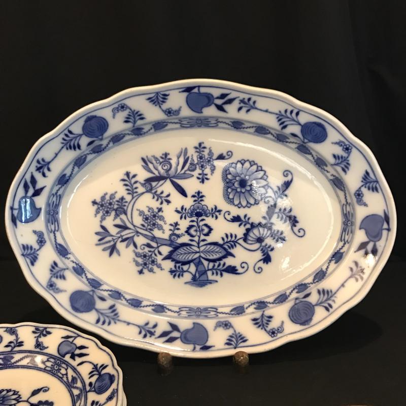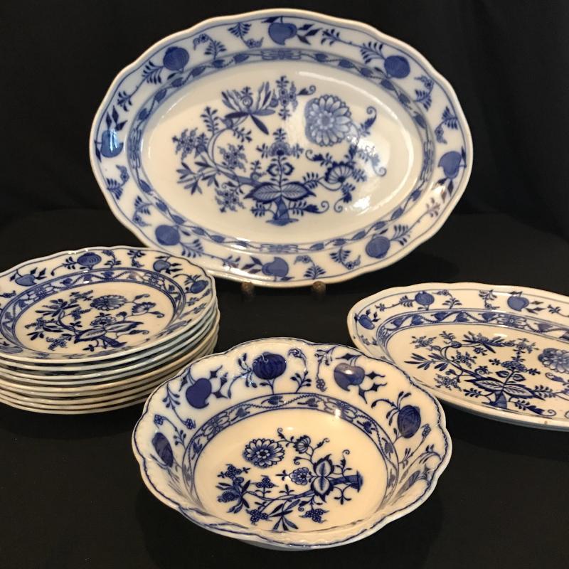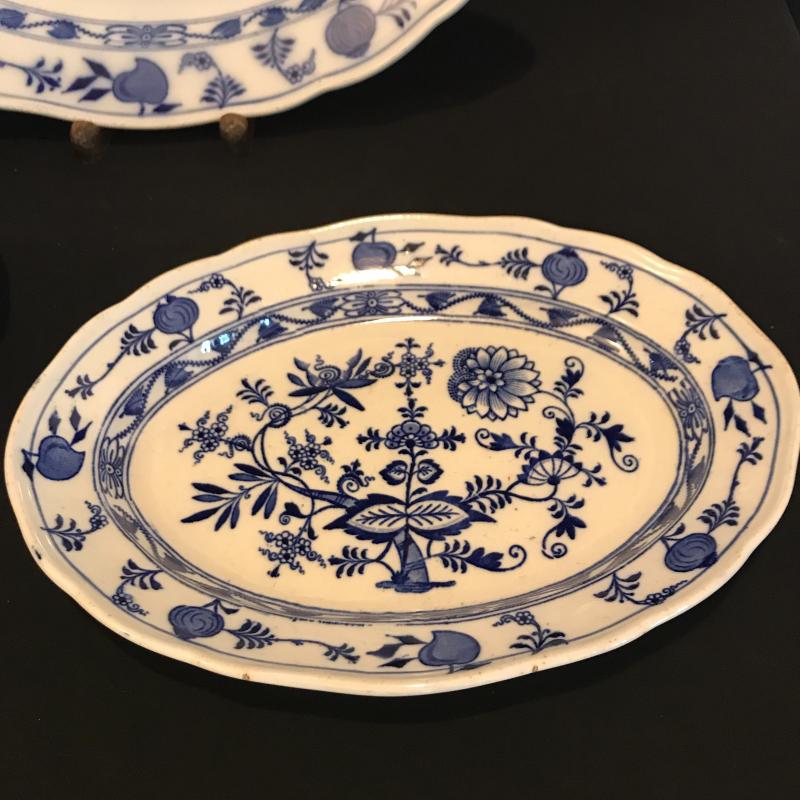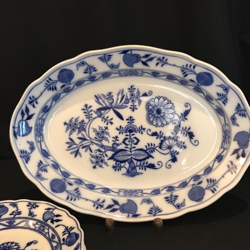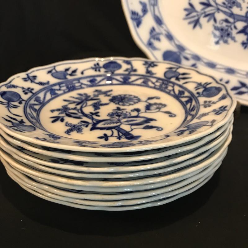 Three serving pieces and nine plates. All Blue Onion designs but different manufacturers. Two platters are Meissen Cauldon Blue Onion and the bowl is Johnson Bros. Flow Blue Onion and has a raised relief on inside. 9 plates are all Meissen. Largest platter is 18.5”l x 13”w. No visible chips or cracks but slight wear due to age. Shipping or local pick up in Asheville.