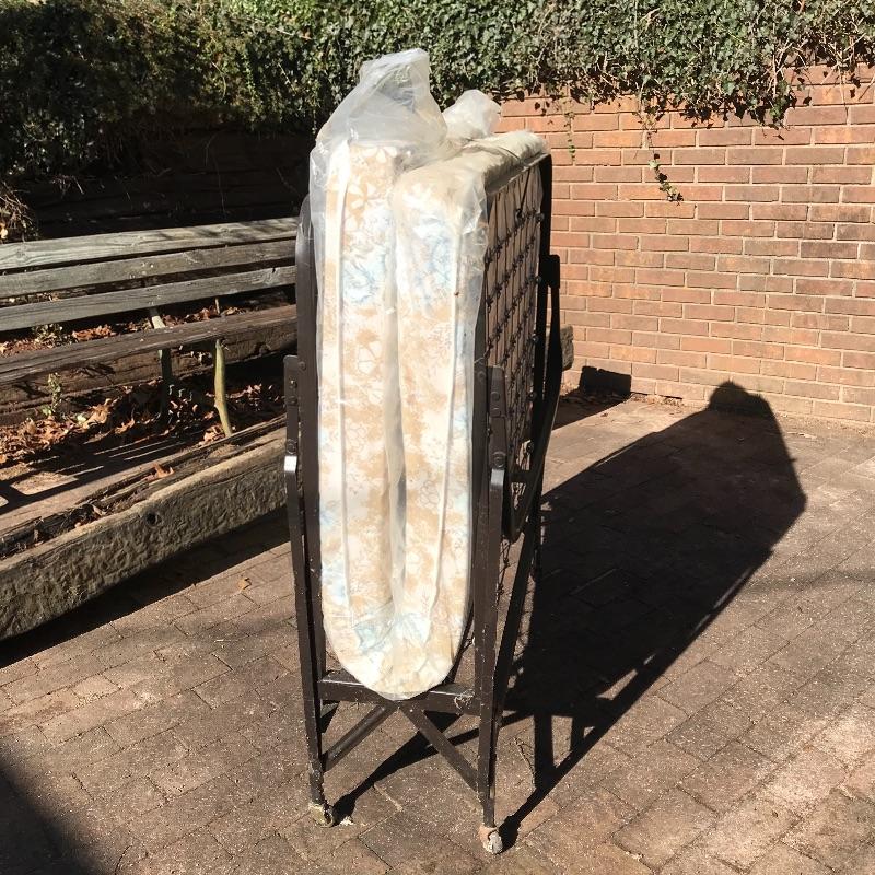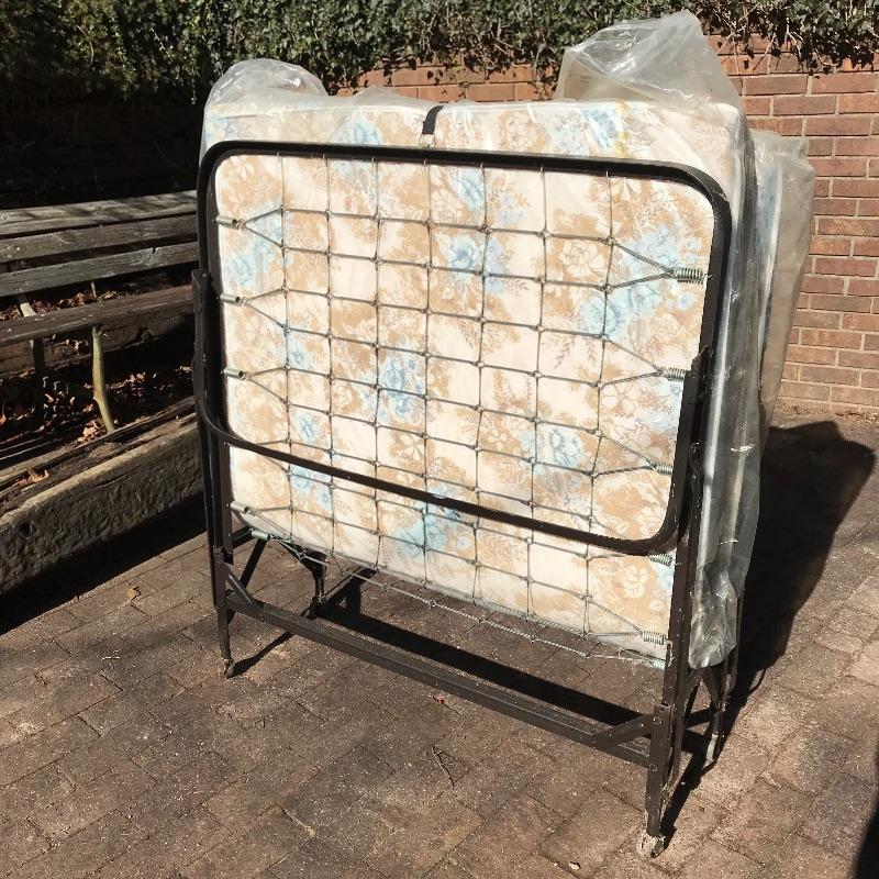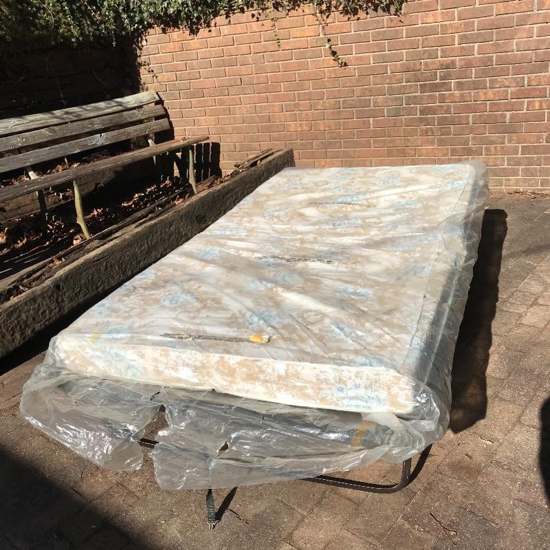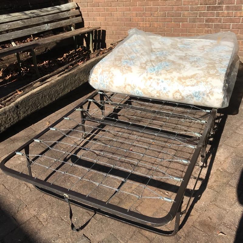 Where are you going to put that extra family or friend who’s sleeping over? Here’s a small twin bed sized hideaway bed with metal frame and springs. The mattress can be given to the winning buyer, if desired, at no additional costs. The mattress appears to be in great condition, wrapped in a mattress protecting plastic. Bed was stored away and has some spiderwebs and dust that will need to be brushed away before use. The mattress folded measures 39” x 14” x 39.5”. See photos. Local pick up only.