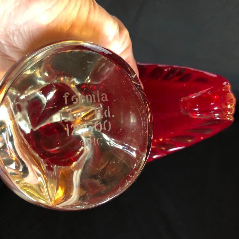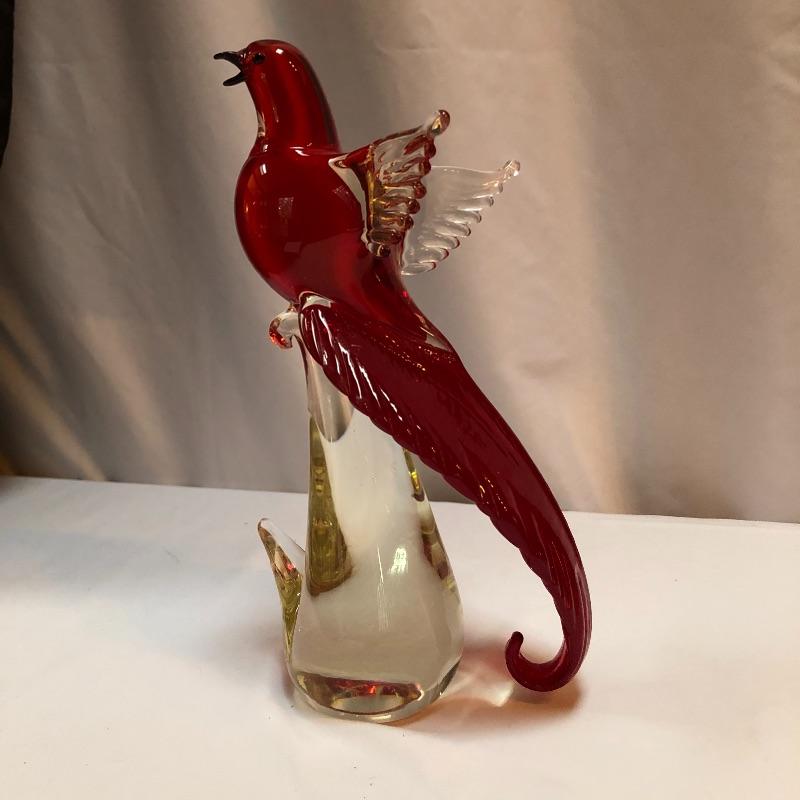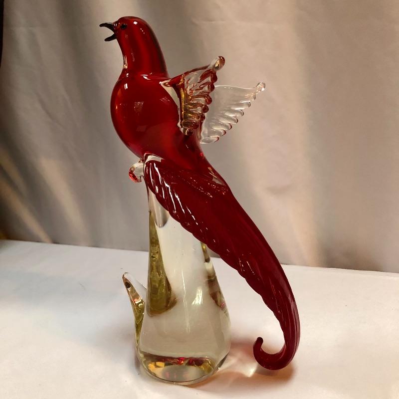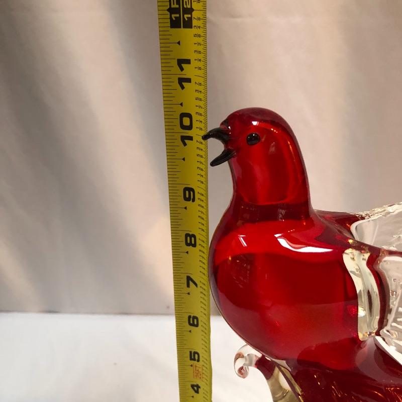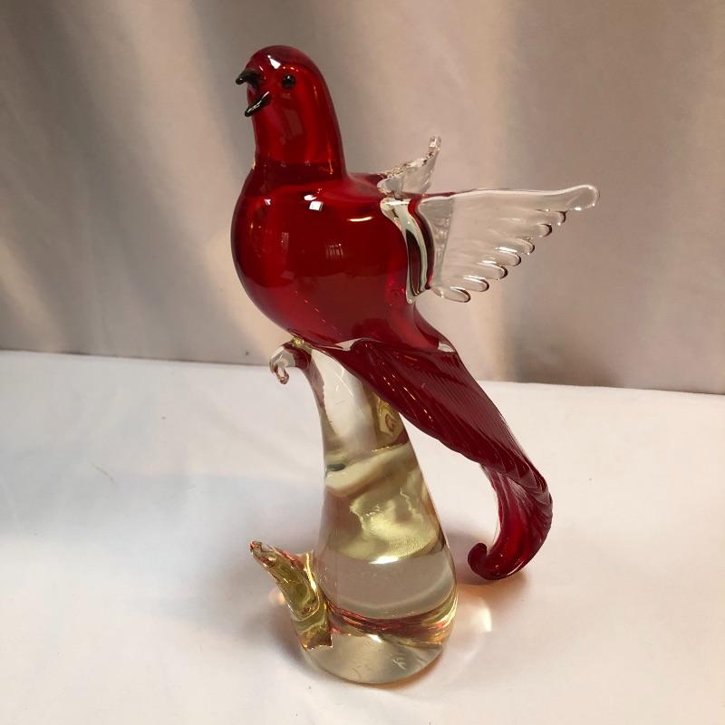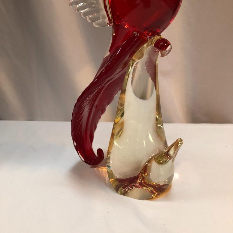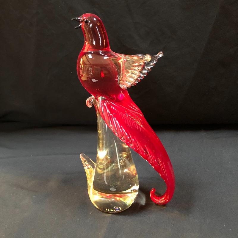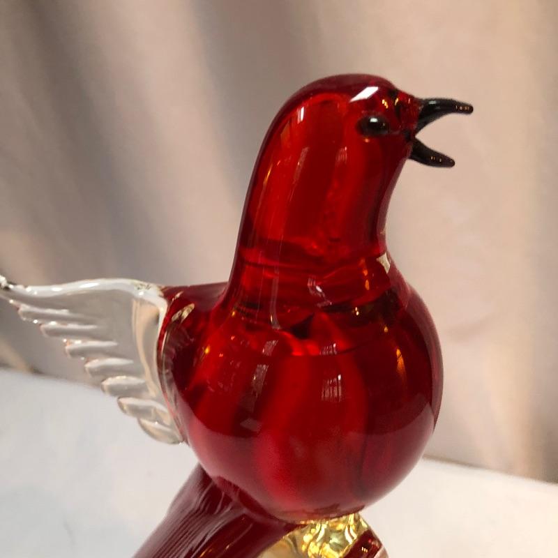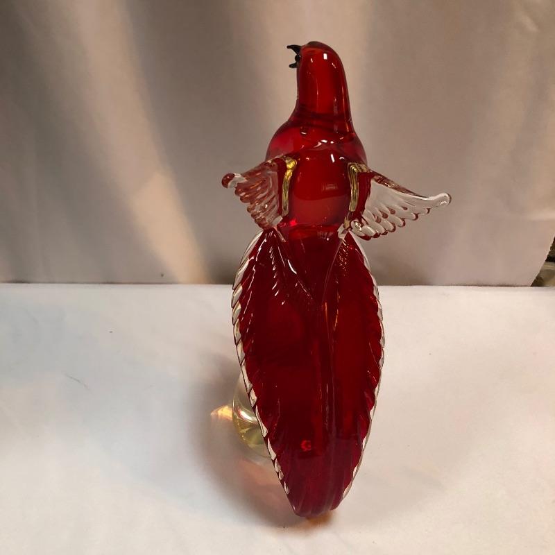 This Formia Vetri Di Murano ruby red bird is a spectacular piece of hand blown glass that has a makers mark, see images. The birds tail has amazing realistic textured details and will be a showstopper of a display piece in any space it resides.
