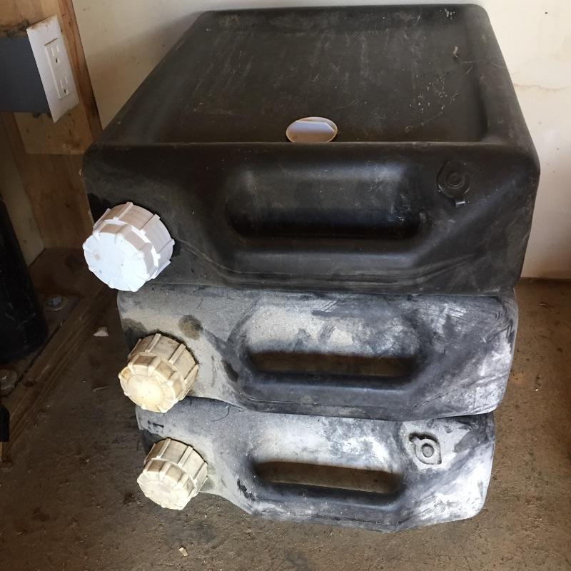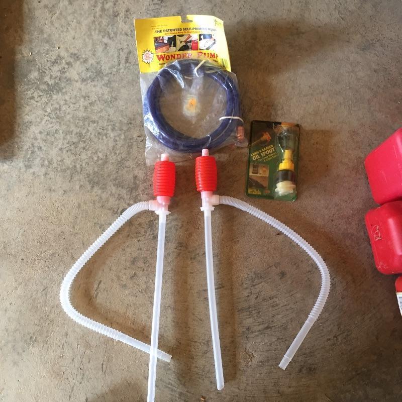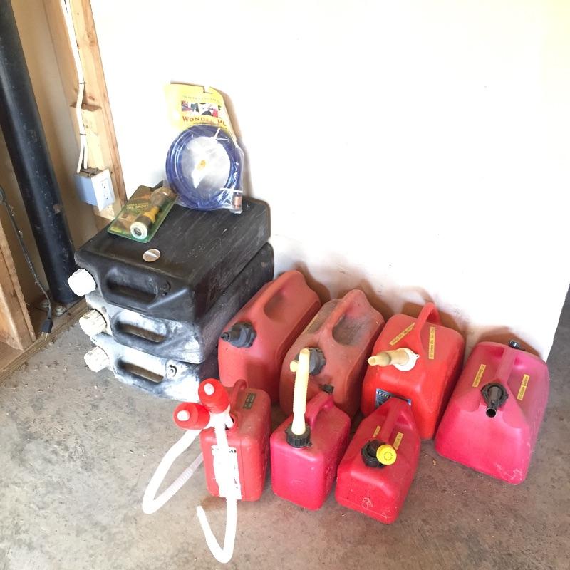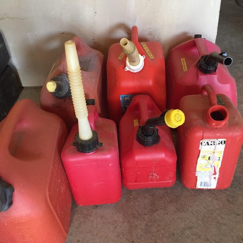 Seven assorted sizes of gas cans , three oil change containers and more. Great for that assortment of lawn tools that all require different fuel.