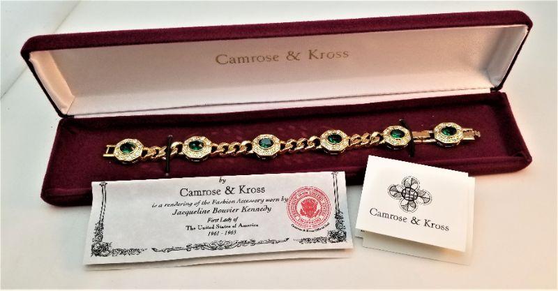 Original packaging/paperwork - Camrose & Kill Jacqueline Kennedy "Emerald" Bracelet. We have the matching earrings in another Lot in this auction. Gold tone, set with CZs, measures about 8" long.