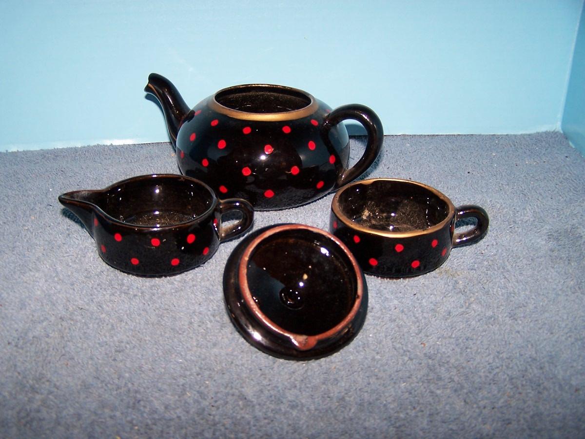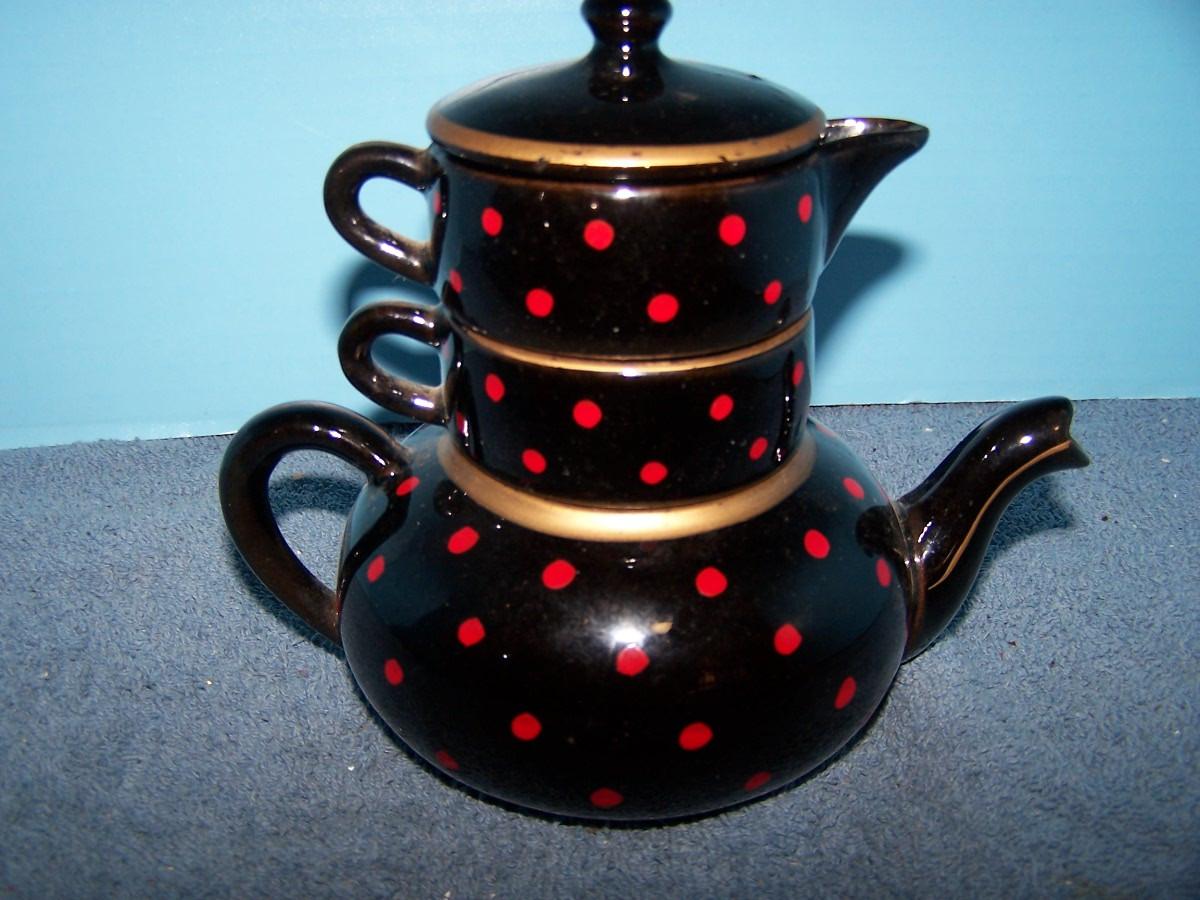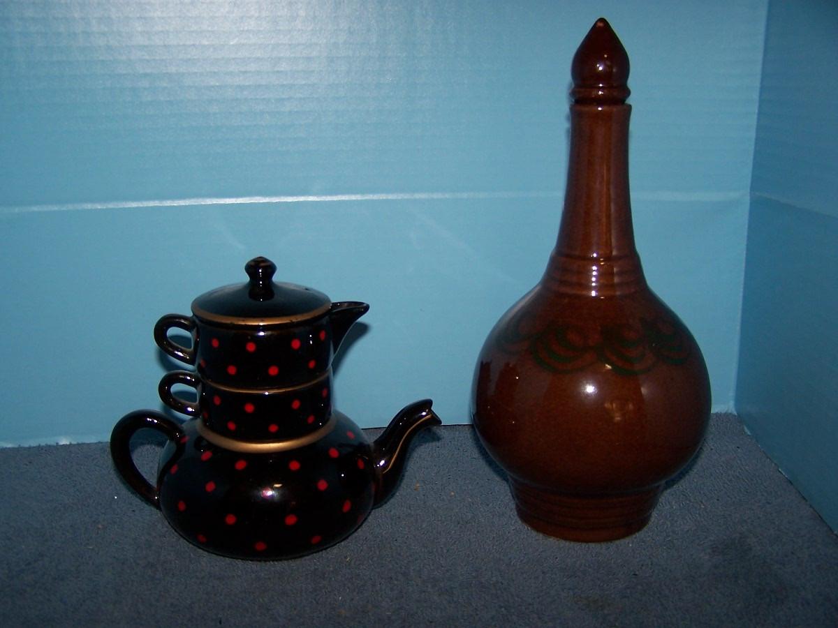 THESE ARE GREAT VINTAGE STACKING TEAPOT SET AND A BOTTLE!!! BOTTLE IS 10 1/2'' TALL.. LIGHT WEAR...