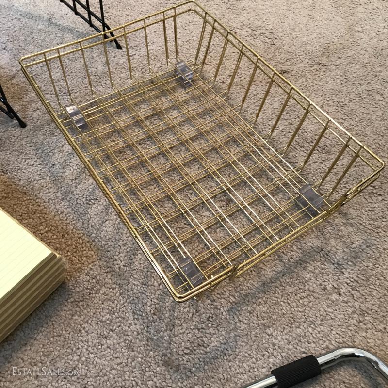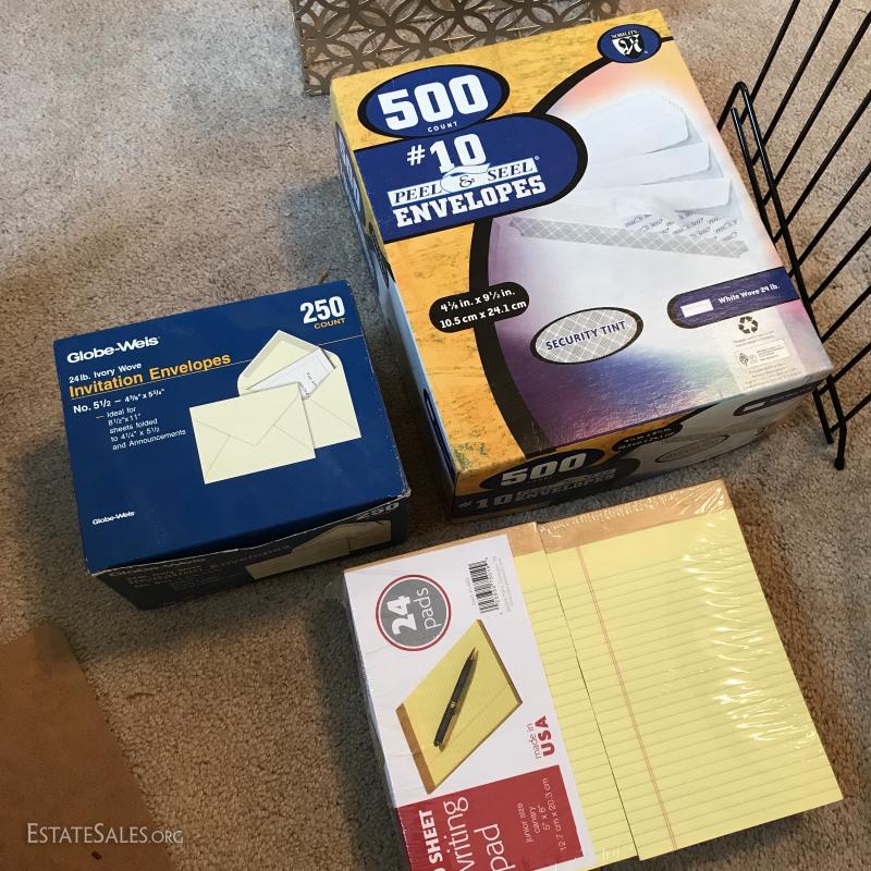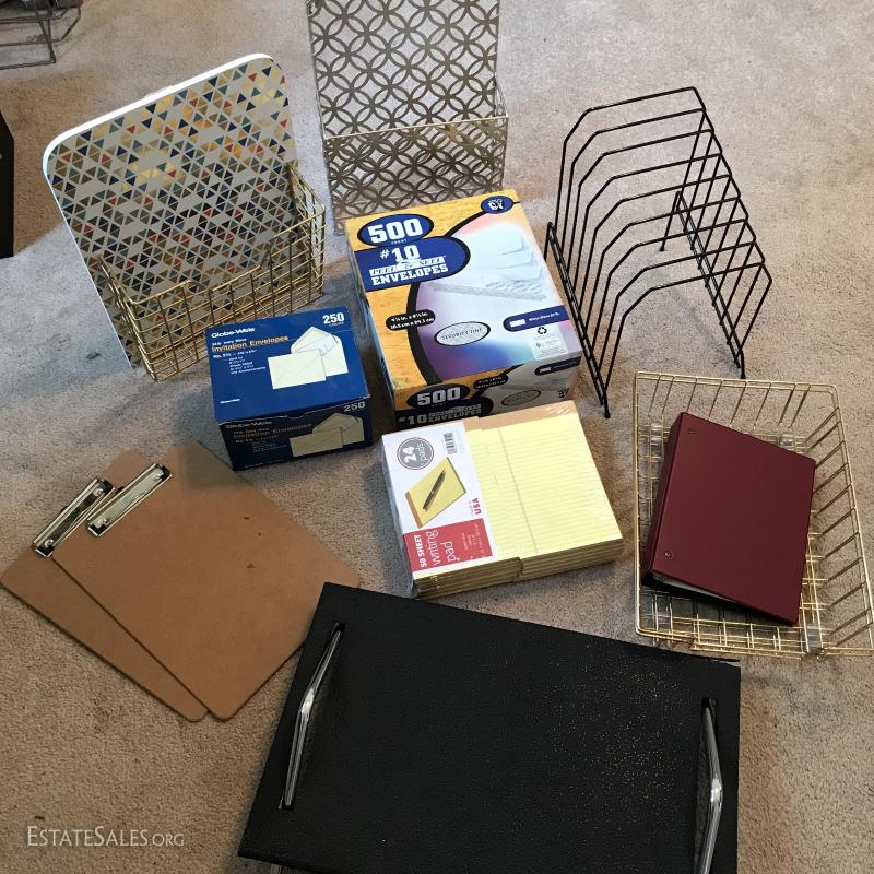 Outfit your home office with the essentials! Wall-mount and tabletop file racks, 24-pack of yellow junior sized notebooks, box of 500 count security tinted legal-sized envelopes (box appears full but cannot verify), box of 250 invitation envelopes (box appears to be full but cannot verify), binder/organizer, two clipboards, and ajustable foot rest for under desk (chip on one corner). See photos for details.