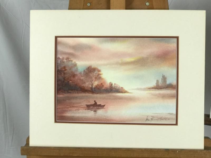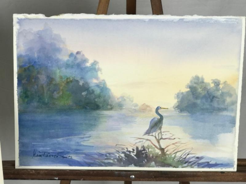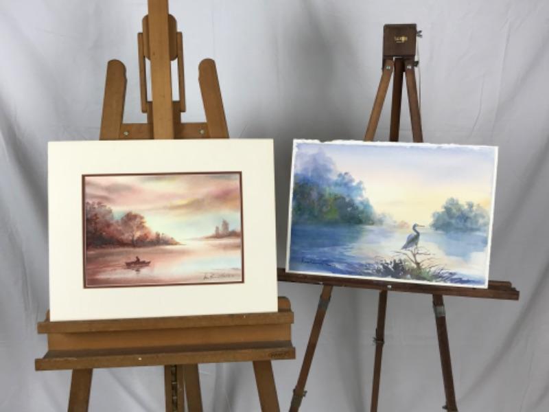 Pair of Jean Ranney Smith signed original watercolor paintings “Fishing” measures 20”x16” including matt, “Heron” measures 18”x12-1/2”