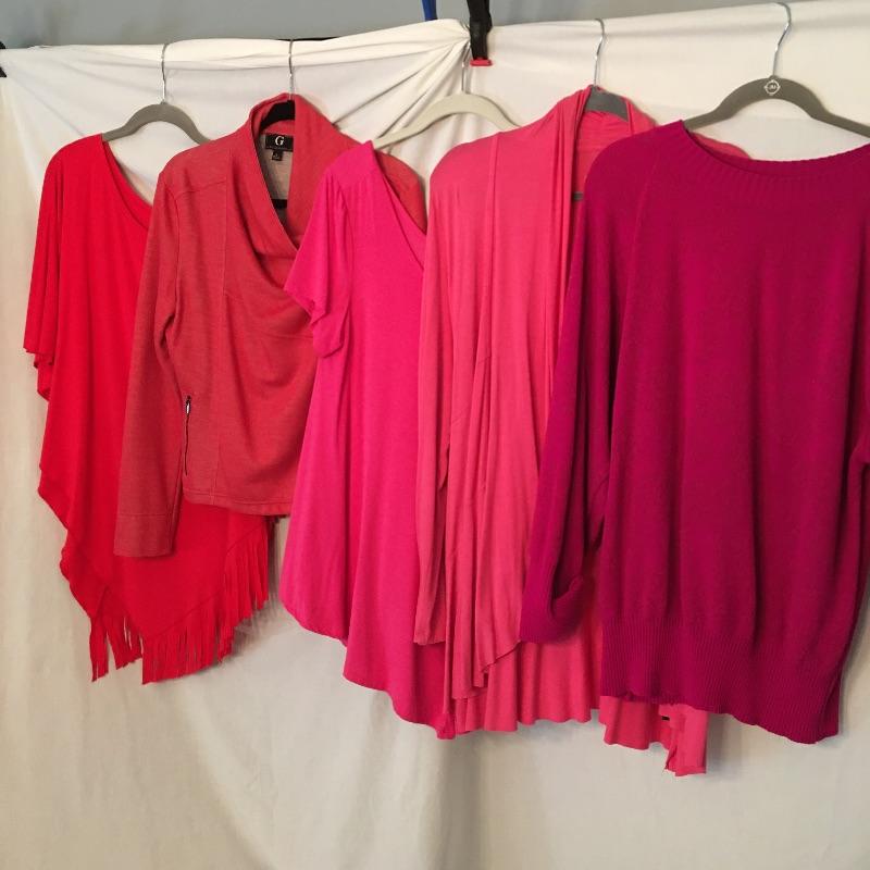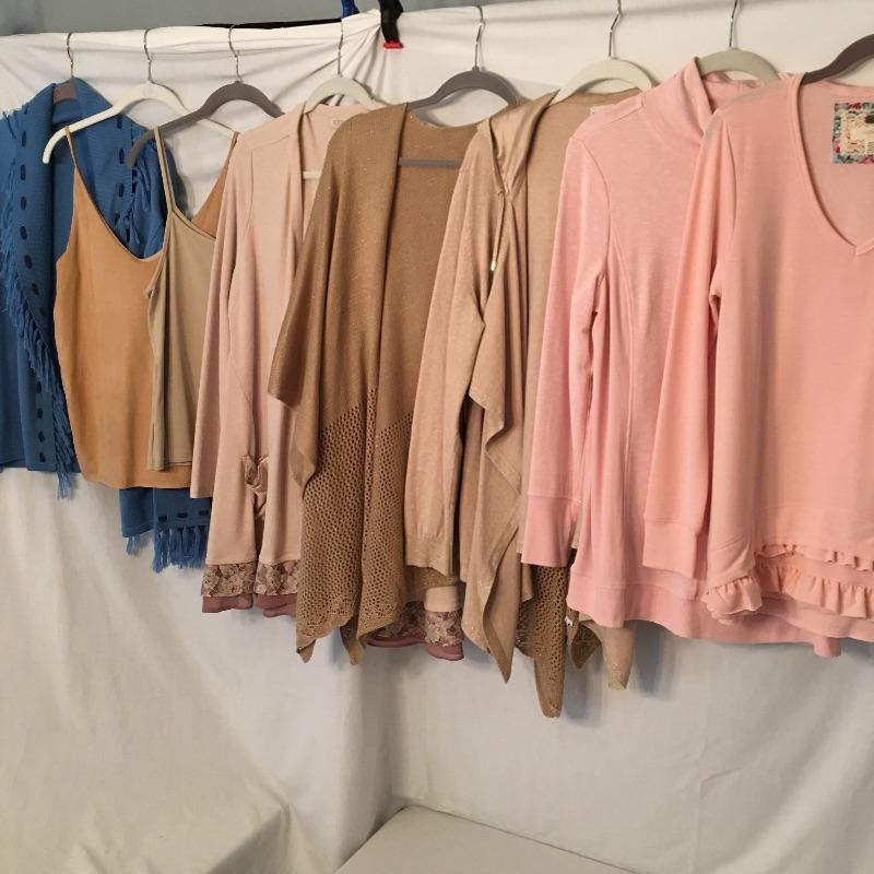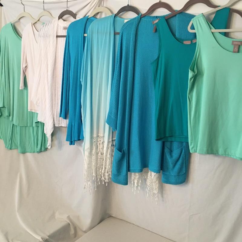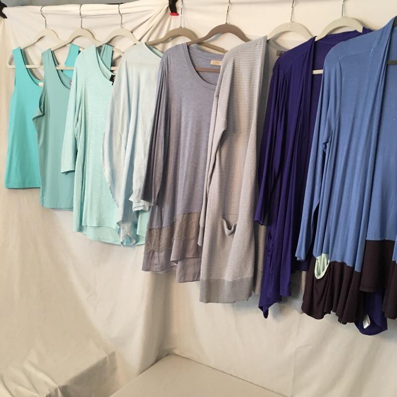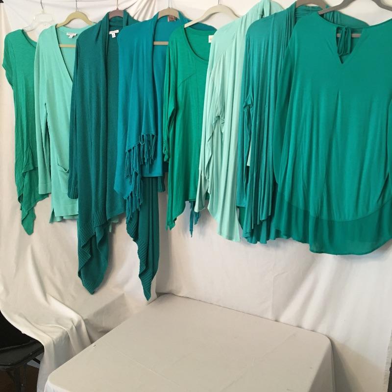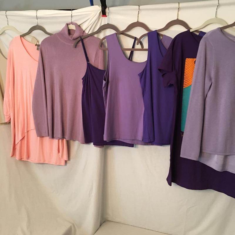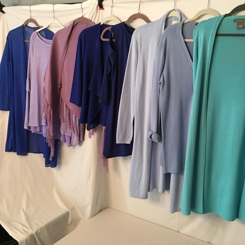 Ladies Colorful tops includes over one hundred tops in a rainbow of colors, styles and materials. Including such brands as Chico, Halston, Cha Cha Vente, Kate and Mallory, Cuddl Duds, Cupio and more. Sizes run from Chico's size one to XL.