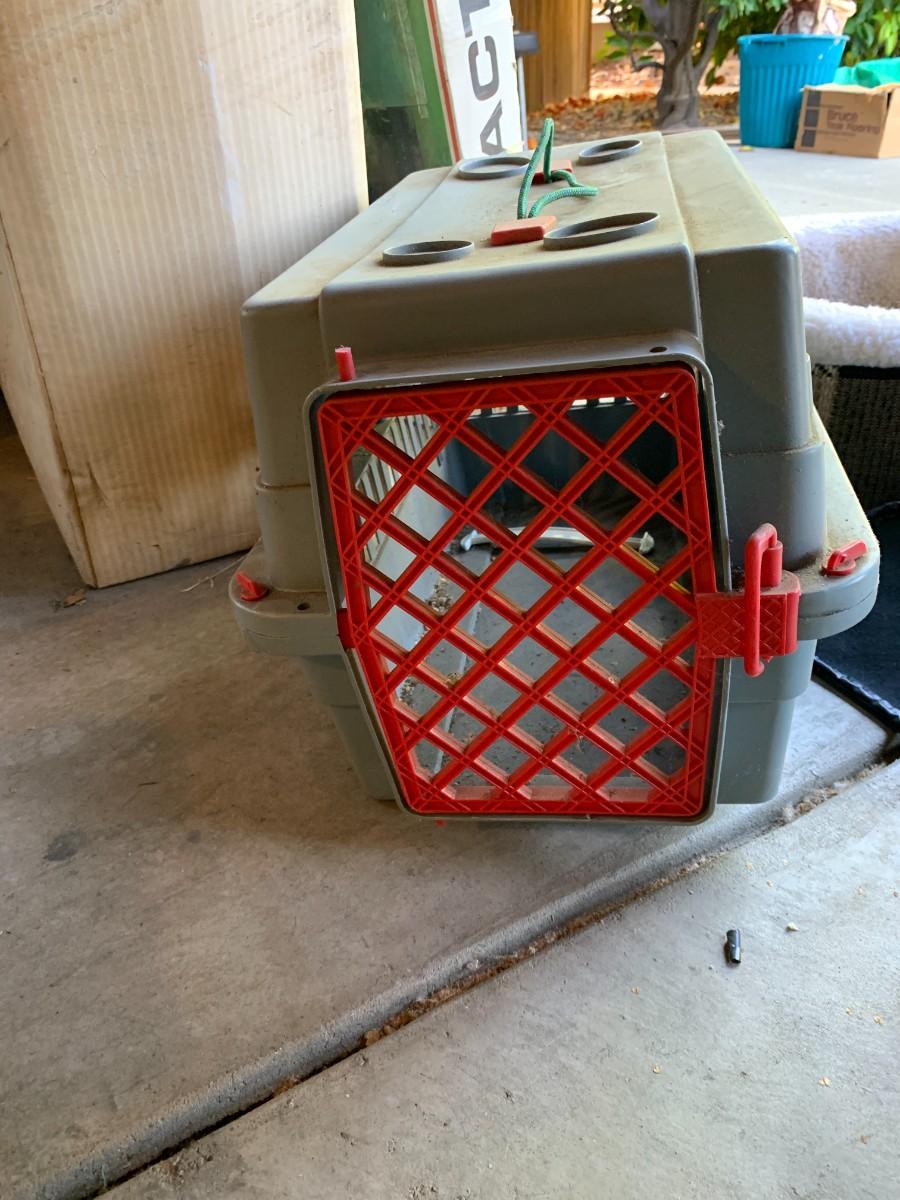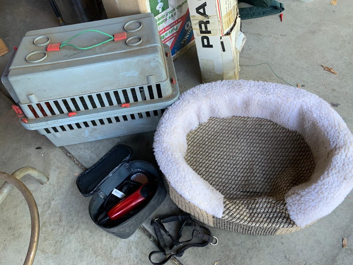 Small plastic carrier, dusty. Small pet bed, clean. Harness and electric clippers, not tested.