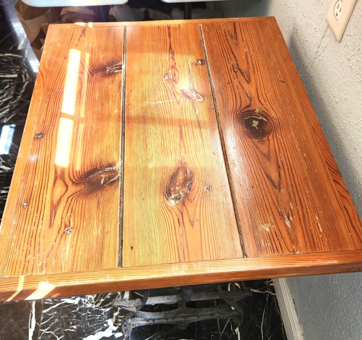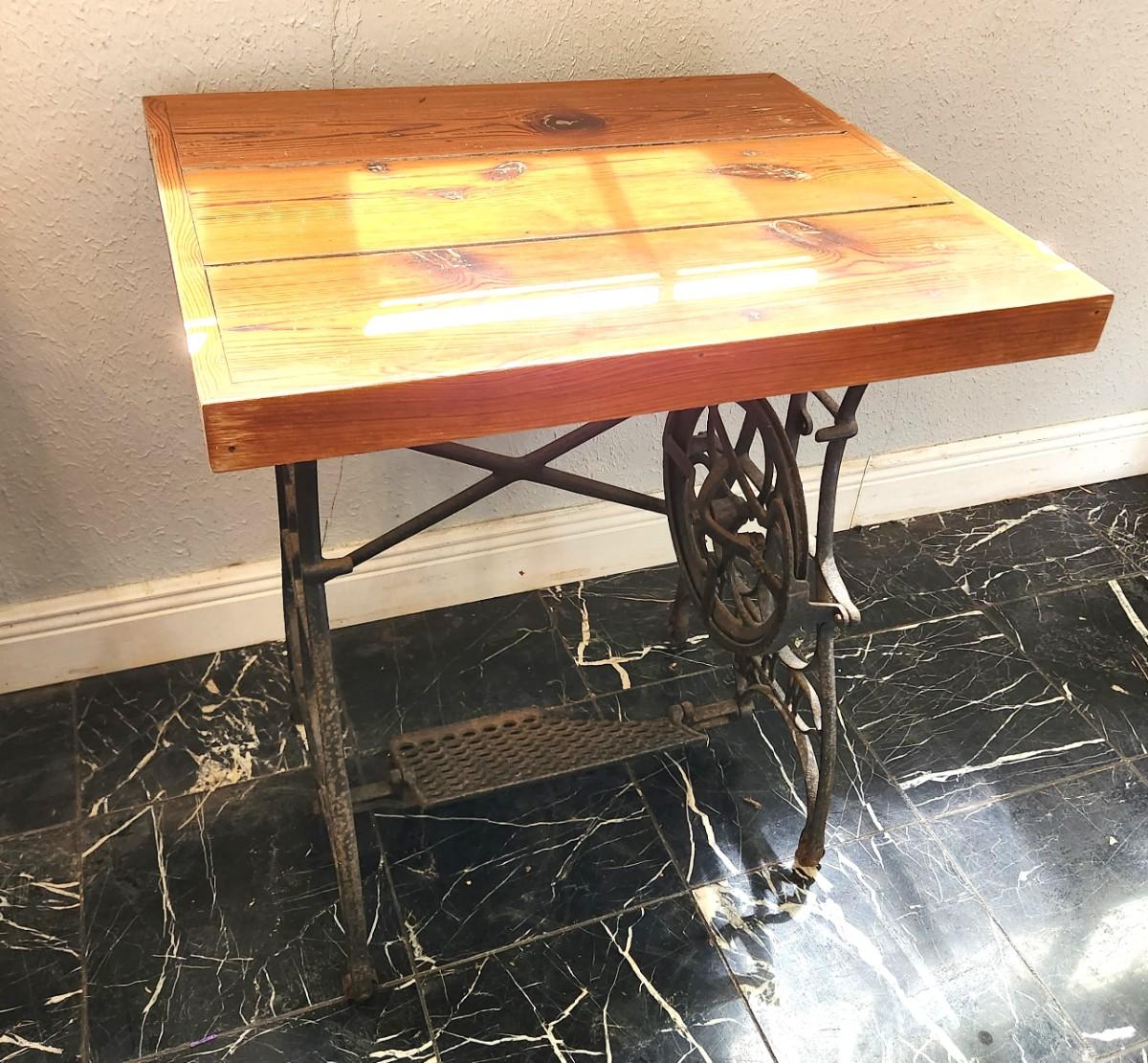 Cypress top table with antique cast iron sewing machine base - pedal has one part broken off. 26" x 22", 29.5" tall. Great in a sunroom or on a covered patio for plants, etc.