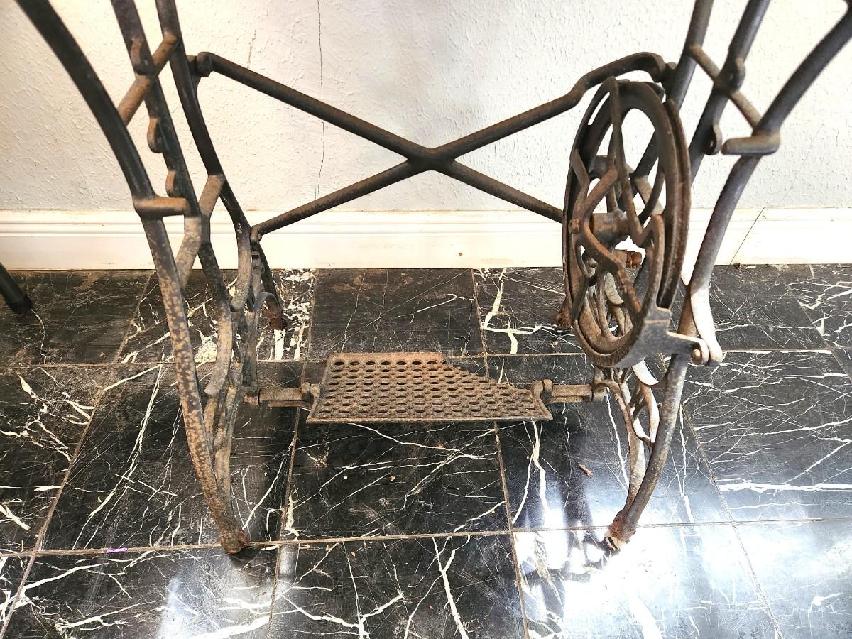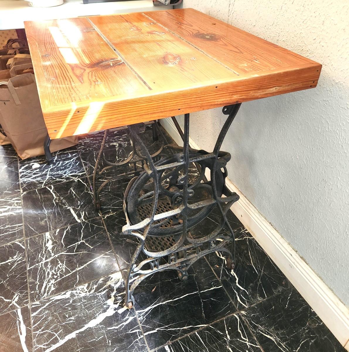 Lot #129 Cypress Top Table with Antique Sewing Machine Base