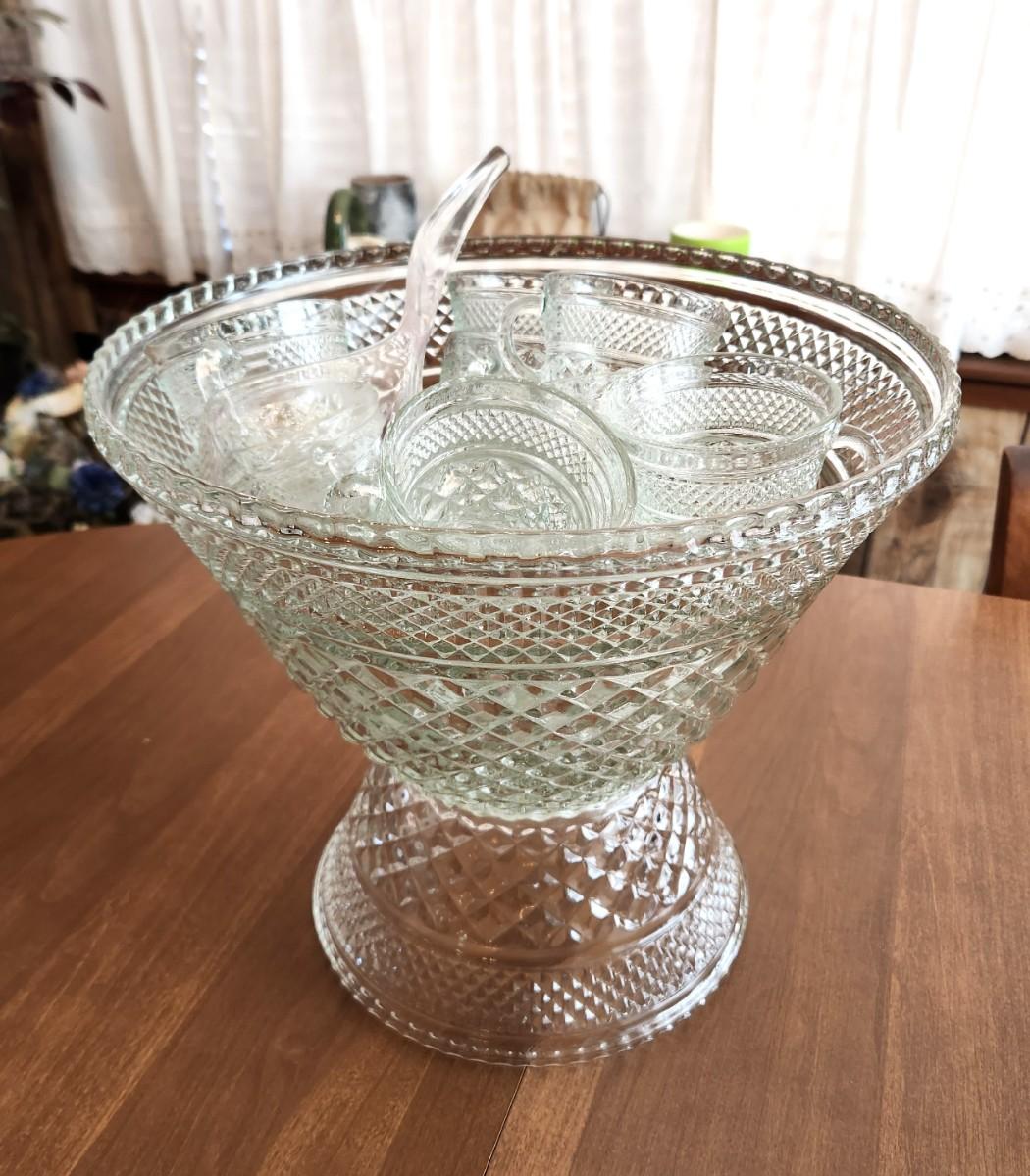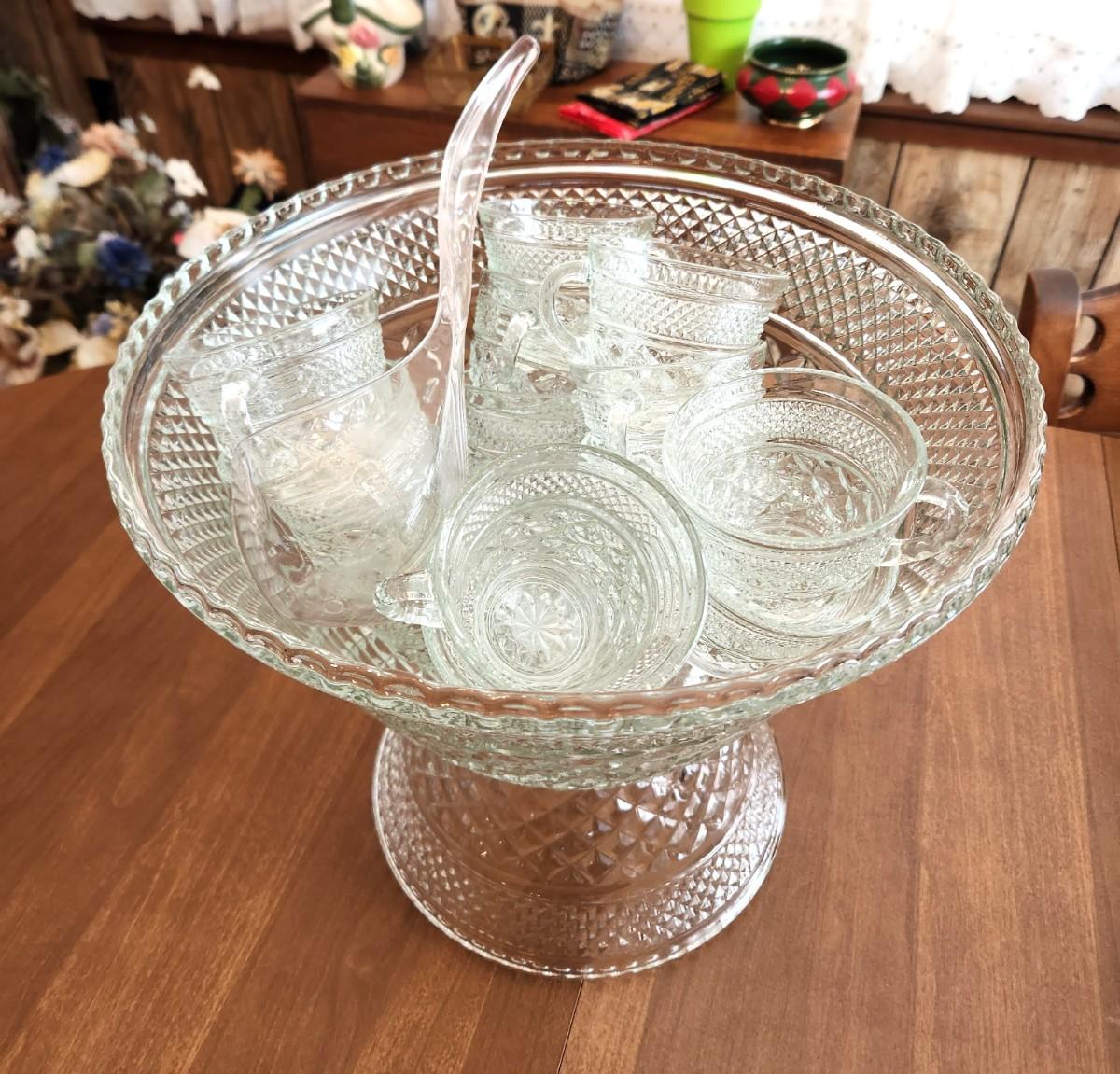 Pressed Glass Punch Bowl on Base - 18 matching cups, plastic Ladle. 12.5" tall, 14" across. Good Condition.