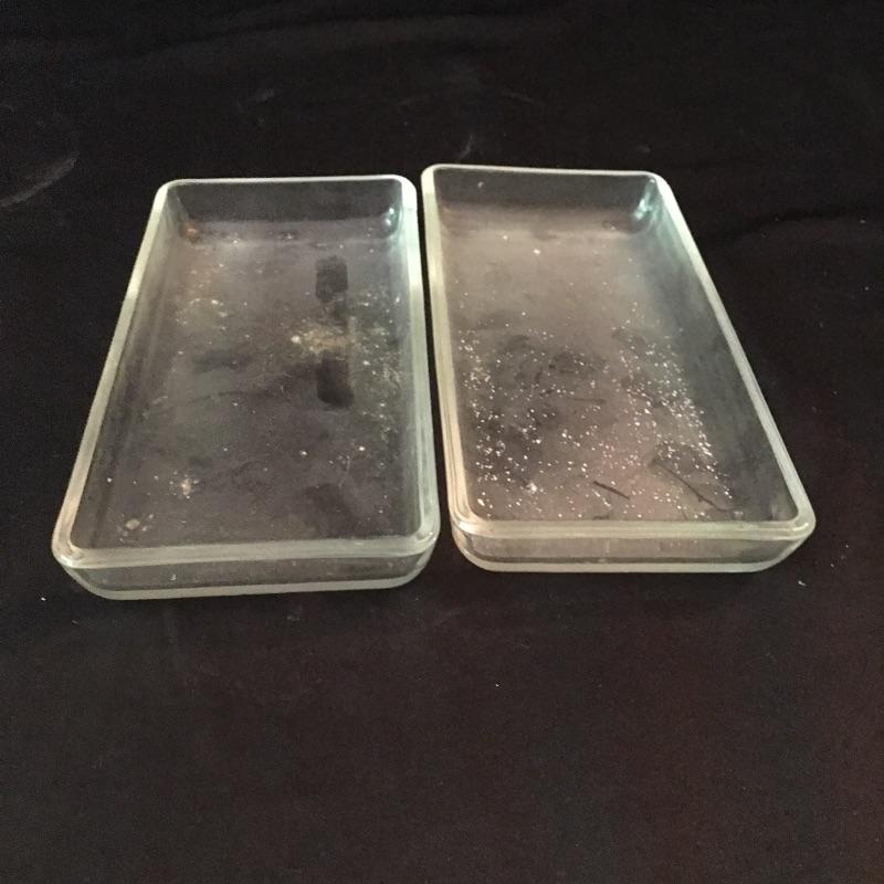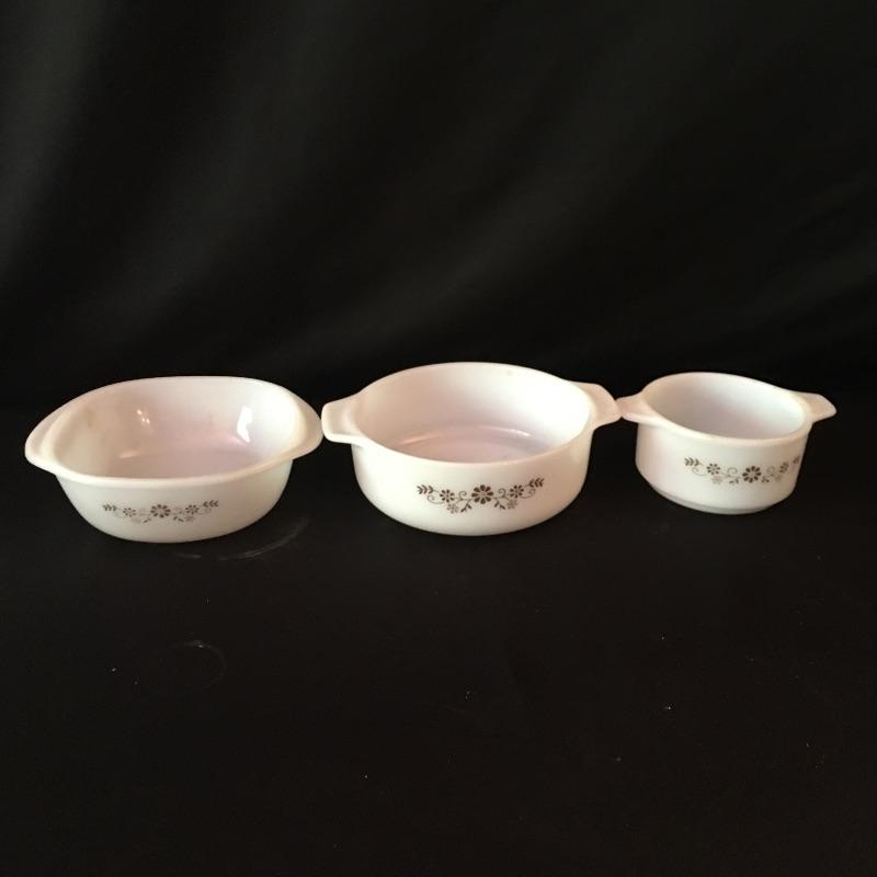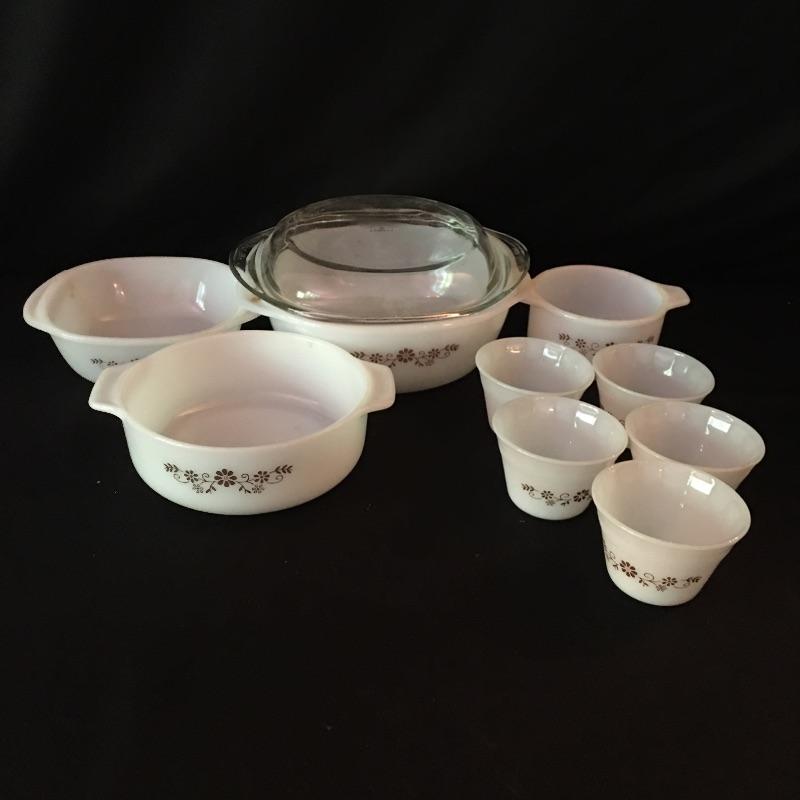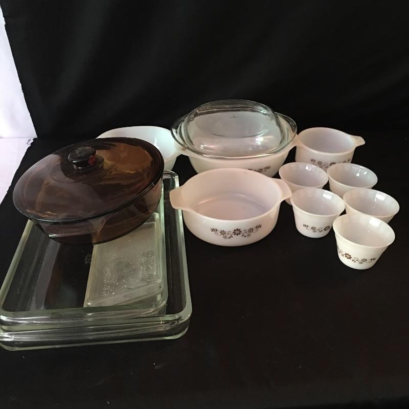 Pyrex and more. Lot includes two Pyrex casserole dishes, two unmarked glass trays, Anchor Hocking covered and tinted dish, five small dishes and four dishes with one cover all by Dynaware. Largest Pyrex dish measures 9” x 15.25” x 2”.