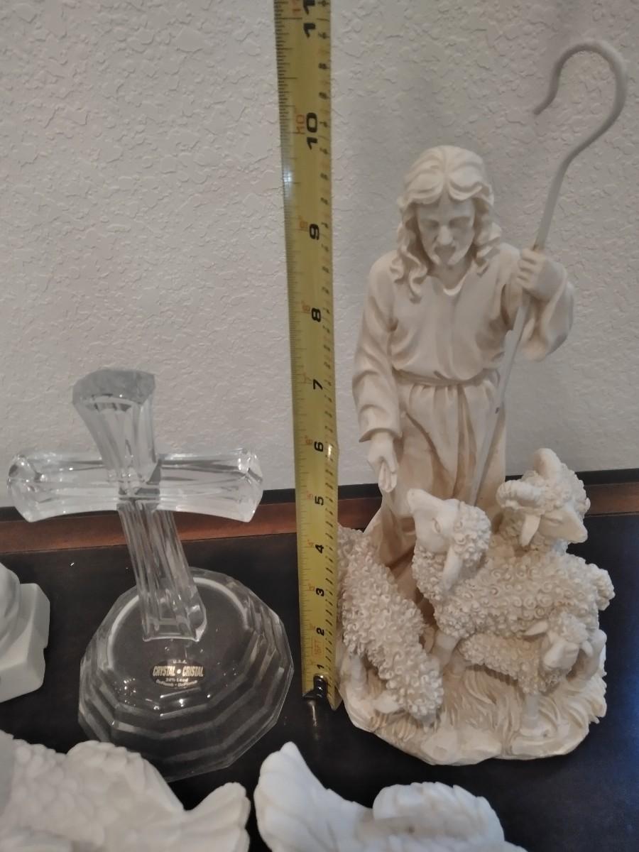 FRAMED LION PRINT "THE BEST IS YET TO COME" JAN BURCH, PRAYING HANDS LAMP, CLEAR GLASS CROSS, SHEPHERD WITH SHEEP STATUE, TWO ALABASTER ITALY DOVES.