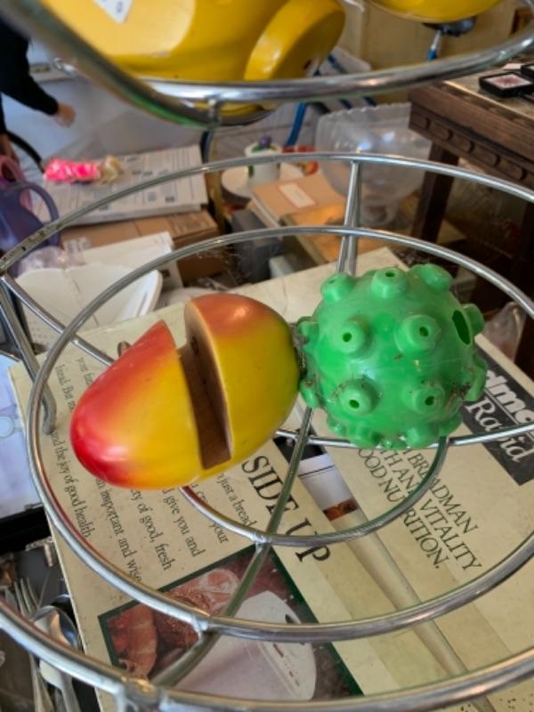 Lot 129. Serving cutlery, Mid Century horn handled cheese knives, decorative plates, Sunbeam breadmaker, fruit rack, tripod, Mid Century hors d’oeuvres picks, etc.-- Was $105 - Now $80