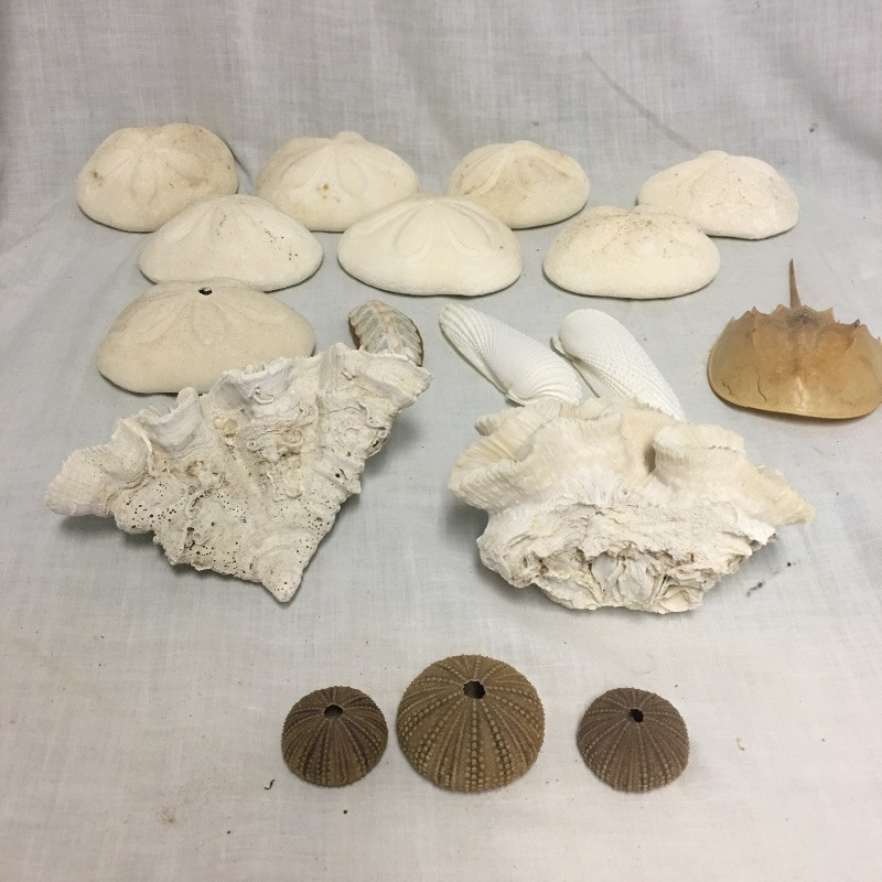A lovely selection of shells including horseshoe crab, ten sea biscuits, three sea urchins and more.